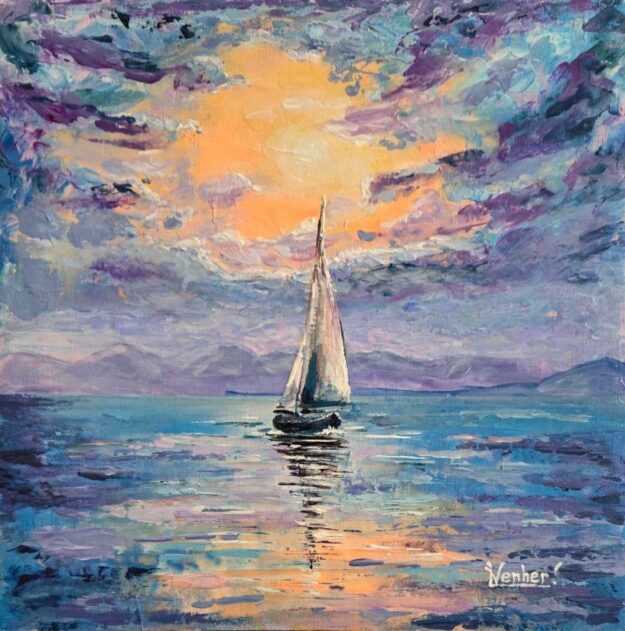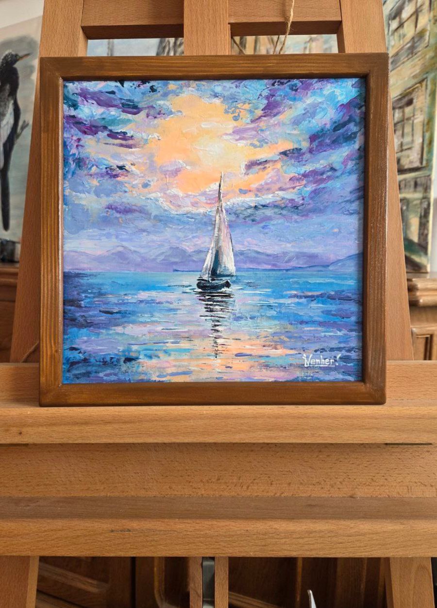 The painting depicts a sea that holds its breath. Its surface is still calm, as if preserving silence before the changes to come. A sailboat glides across the water—lonely but confident, caught in the warm rays of the sunset.