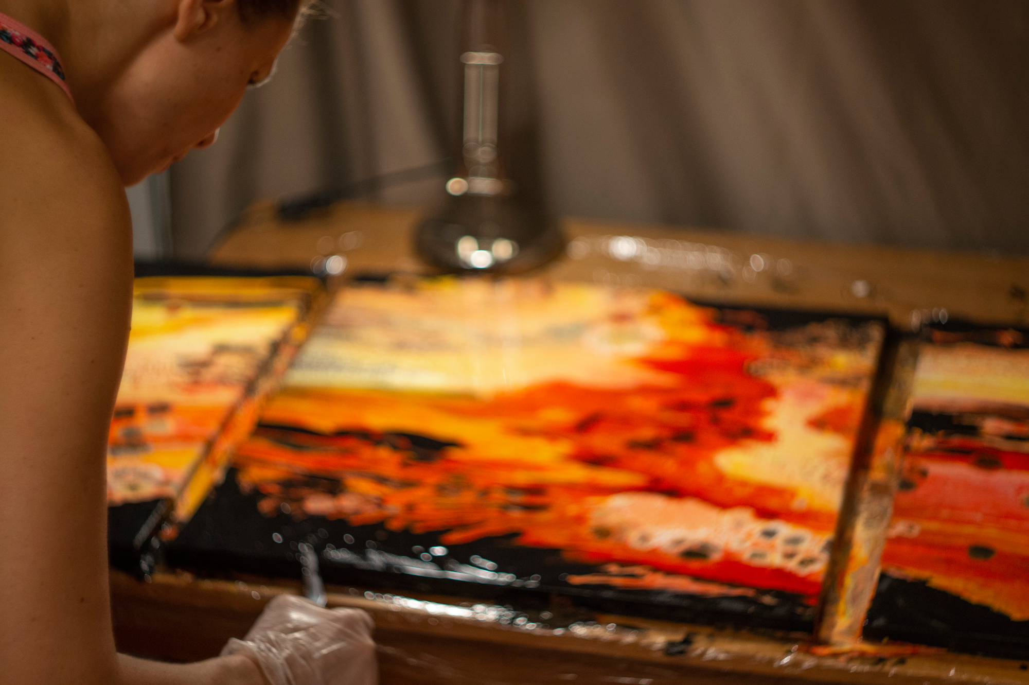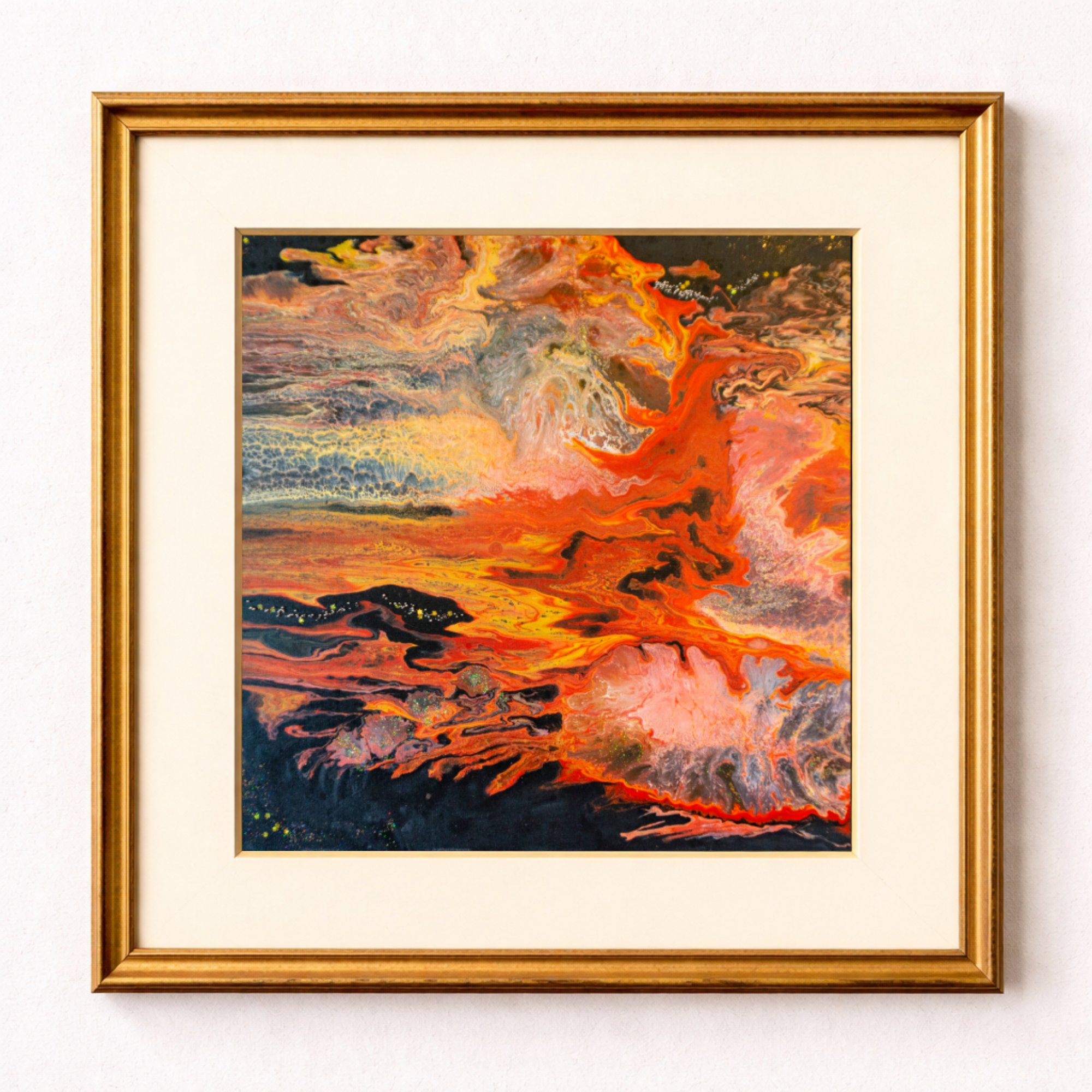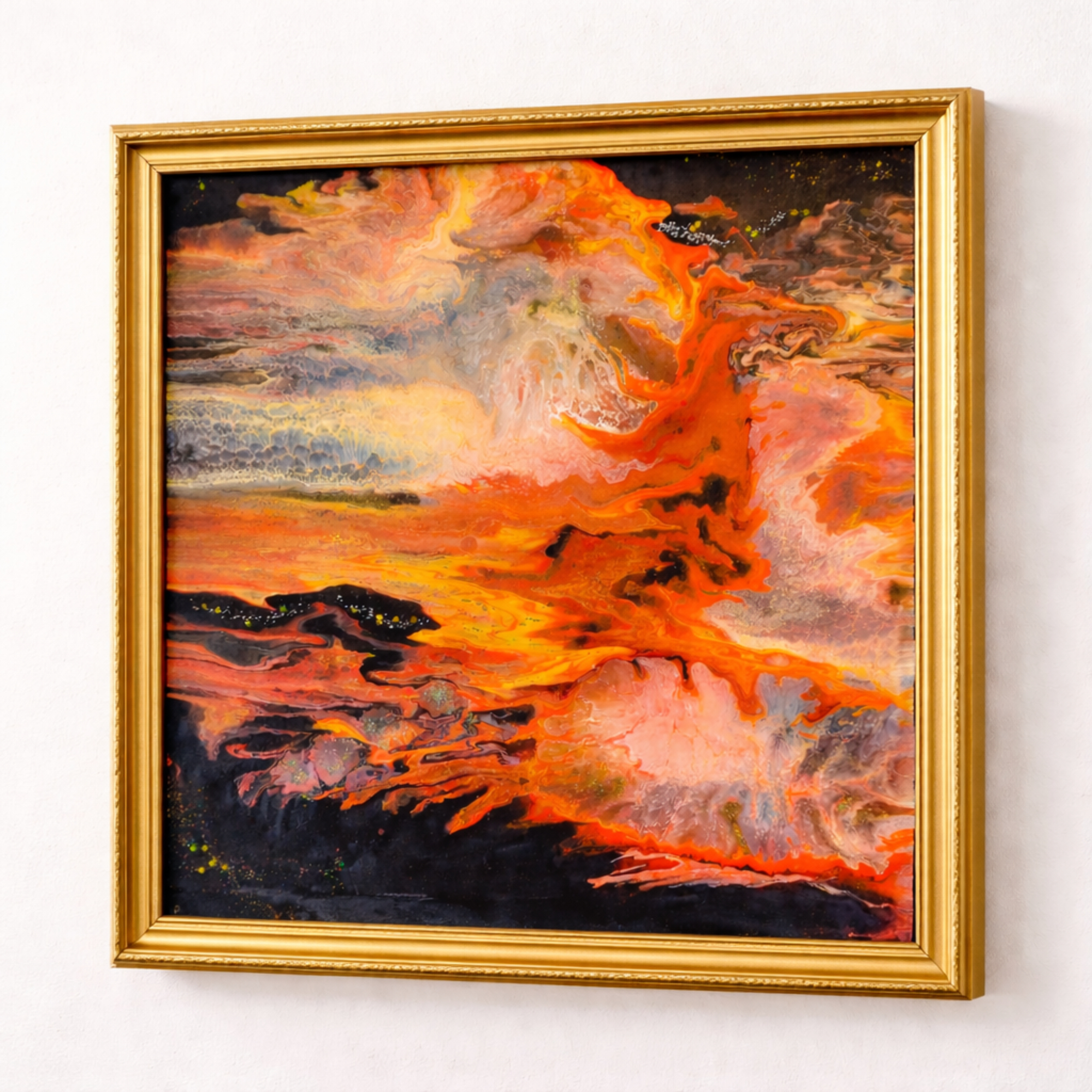 The work is executed using a “liquid art” technique, allowing colors to flow, merge, and form organic patterns reminiscent of shifting clouds, water reflections, and atmospheric layers. The addition of gold powder creates a subtle shimmer and highlights, enhancing the sense of a radiant sunset and lending the surface a refined and collectible quality. The composition combines abstraction with recognizable landscape structure, placing the work within the framework of abstract seascapes, sunset paintings, and contemporary landscape art.