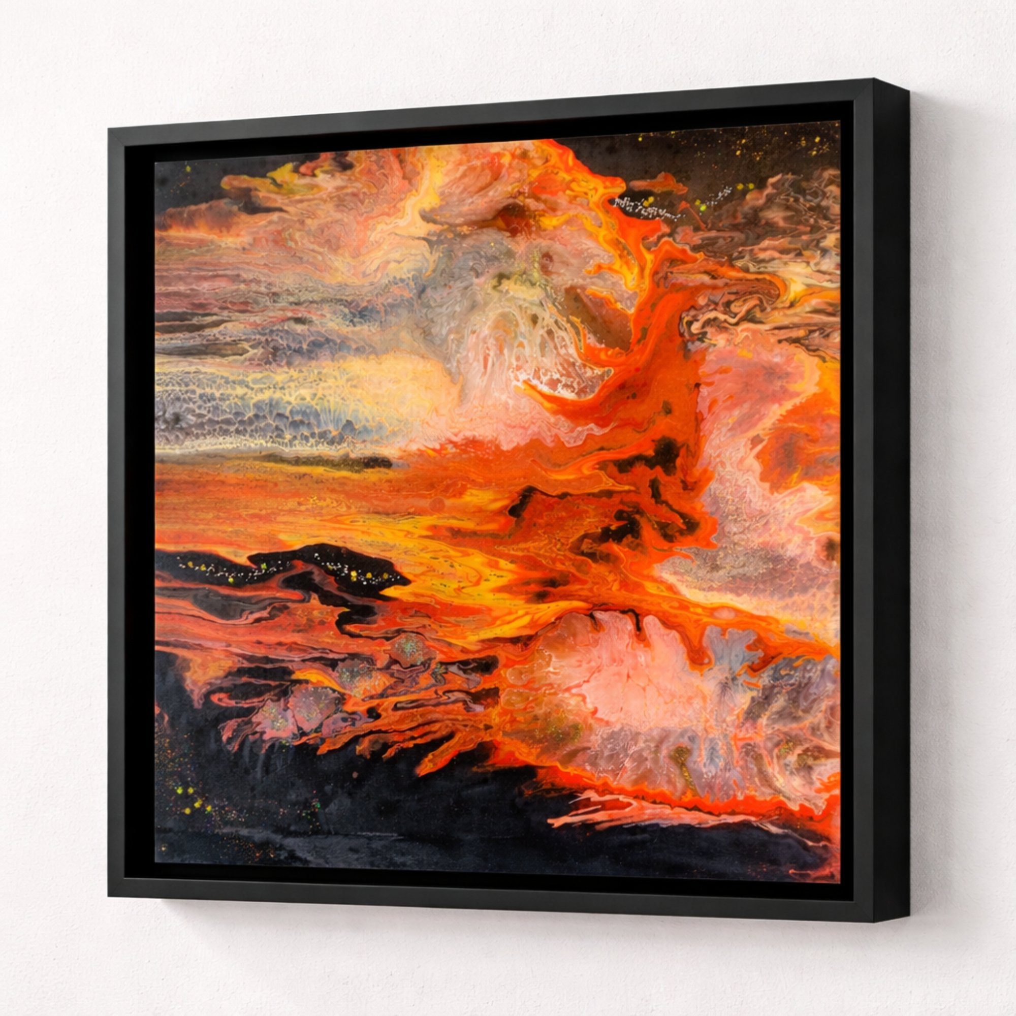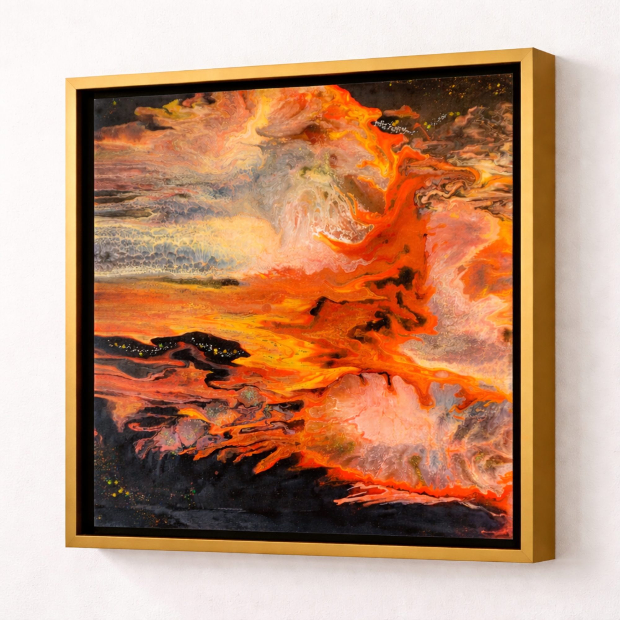 This work stands out for its dynamic movement and multi-layered color transitions. The fluid forms allude to natural elements—sky, water, light—while remaining open to interpretation, making it suitable for collectors who appreciate both abstract painting and contemporary wall art. The square format and rich palette make the work versatile for interiors: it fits seamlessly into modern, minimalist, and designer spaces, serving as a focal point.