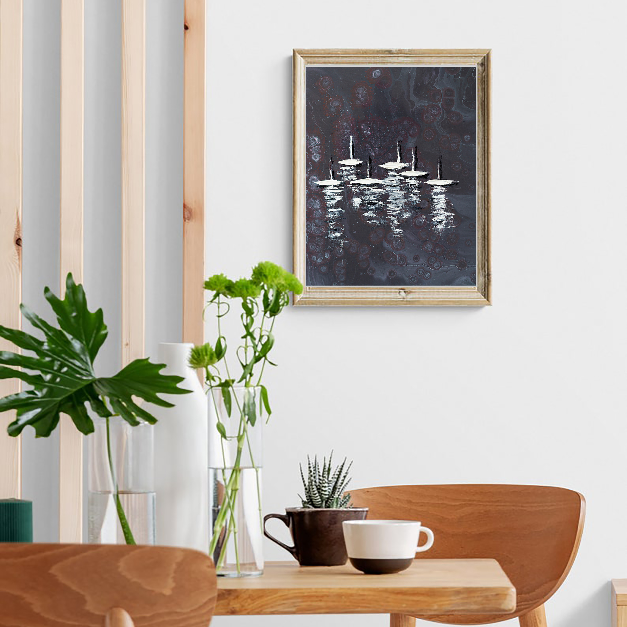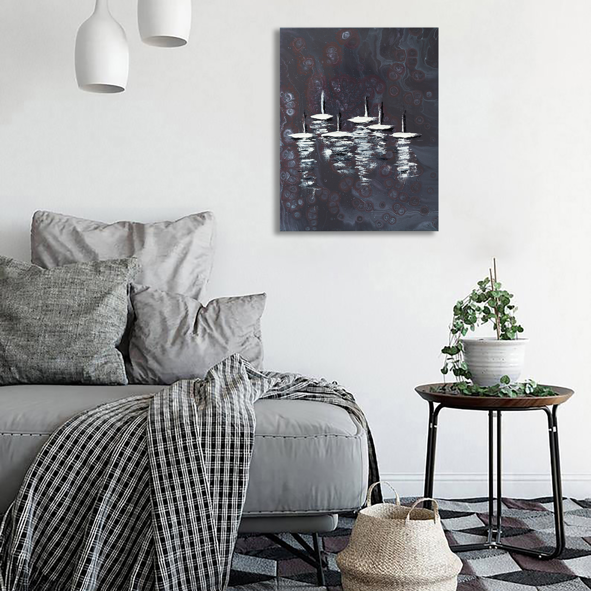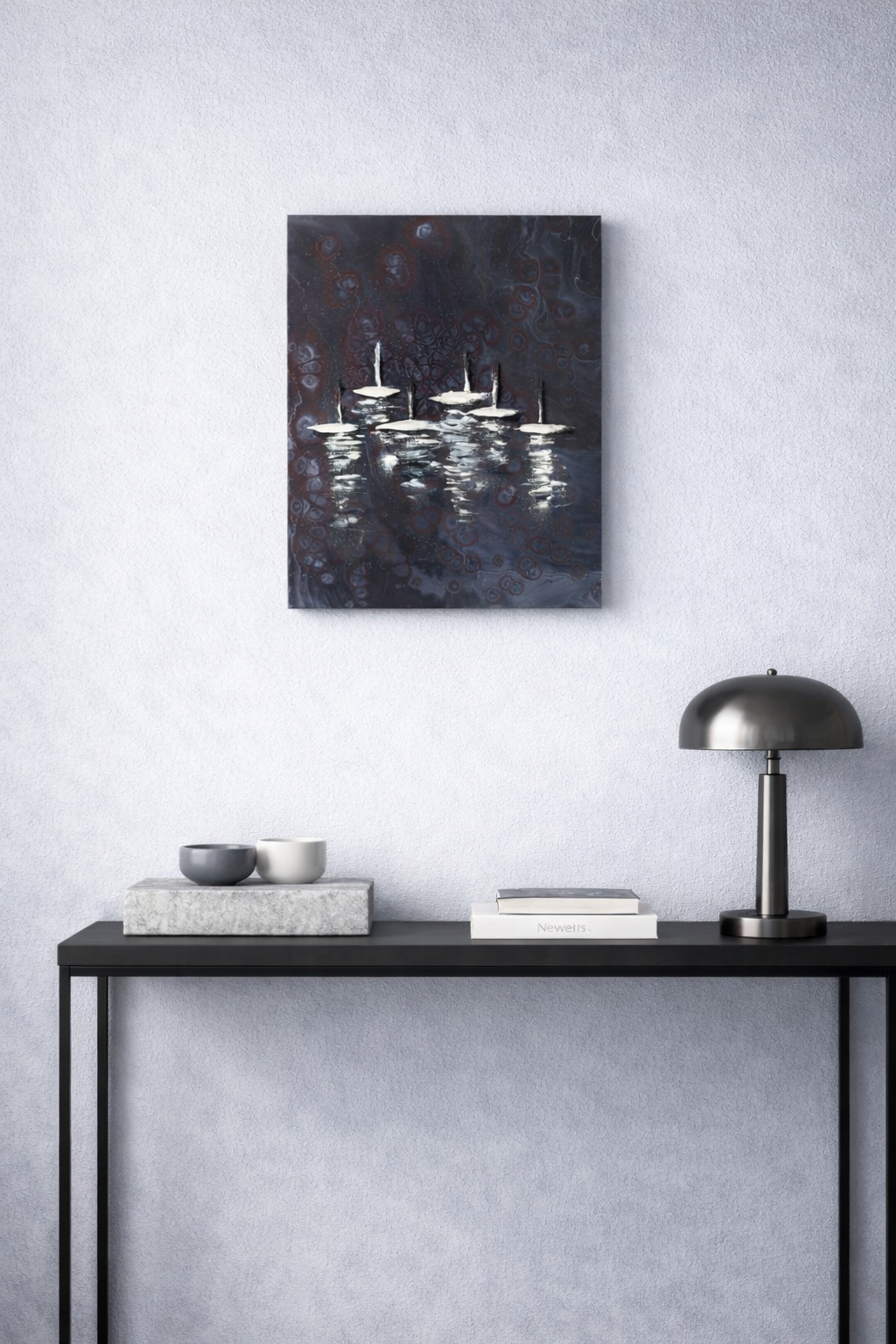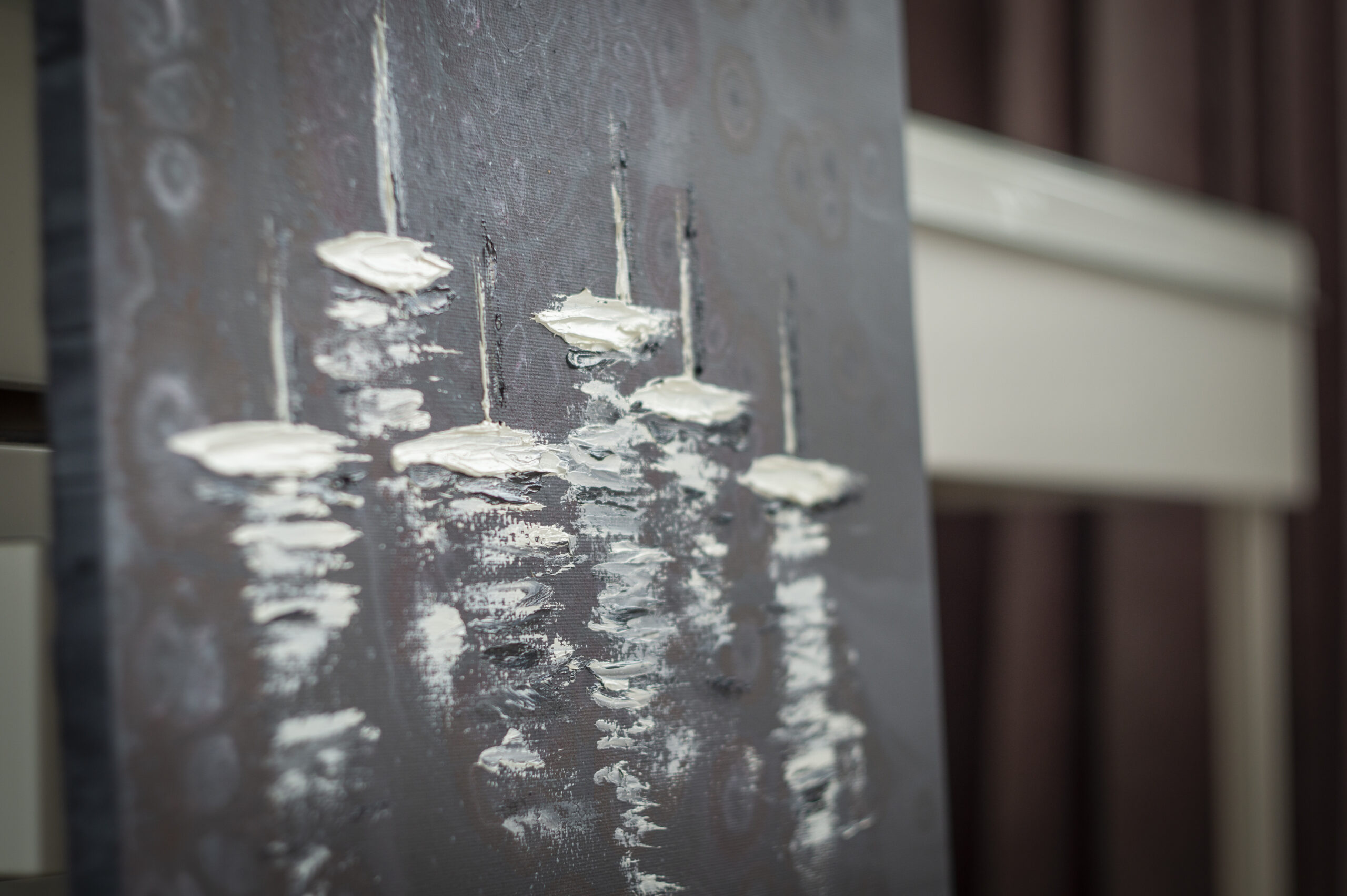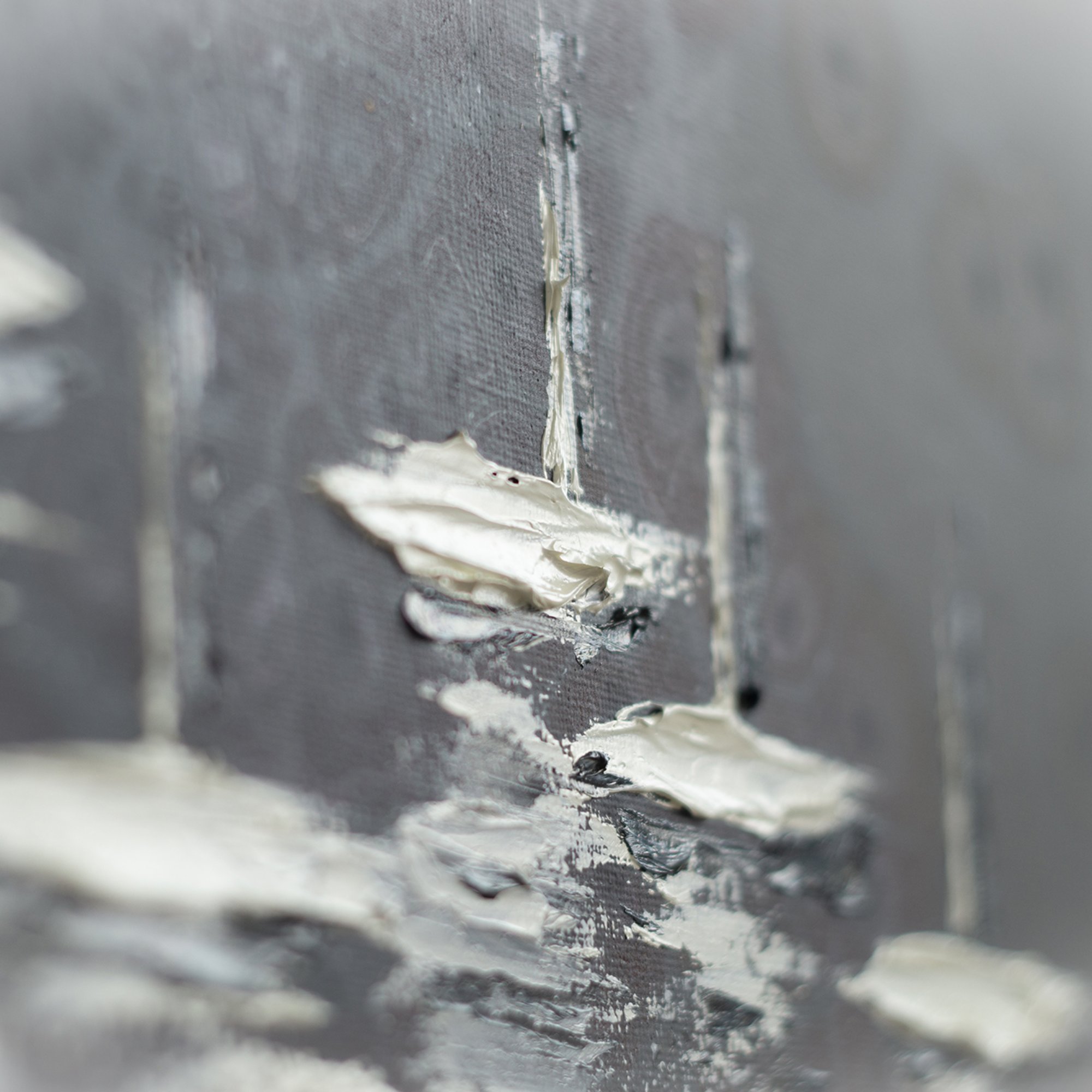 With its calm palette of deep grey tones and luminous white highlights, this painting works beautifully in modern and contemporary interiors. It can become an elegant focal point in a living room, bedroom, study, or creative workspace. The abstract character of the composition also makes it suitable for stylish offices, boutique hotels, or gallery-style interiors where artwork adds atmosphere and personality to the space.