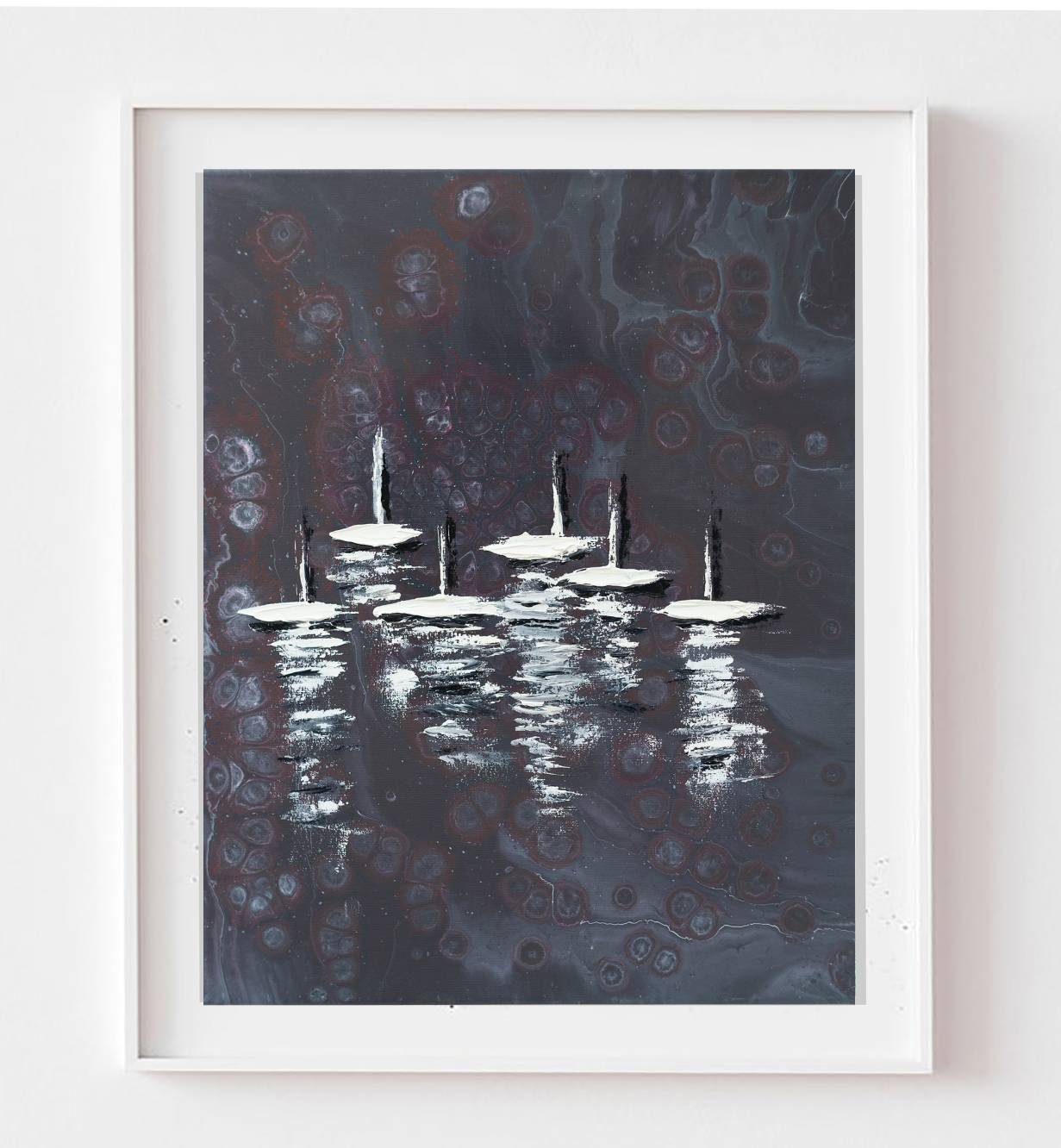 This painting began as an experiment with fluid acrylic techniques. I was exploring the unpredictable beauty of Fluid Art, allowing colors to move freely across the surface and create organic textures and shapes. At first, the result felt abstract and mysterious. When I looked at the forms more closely, they reminded me of white swans gliding across dark water.