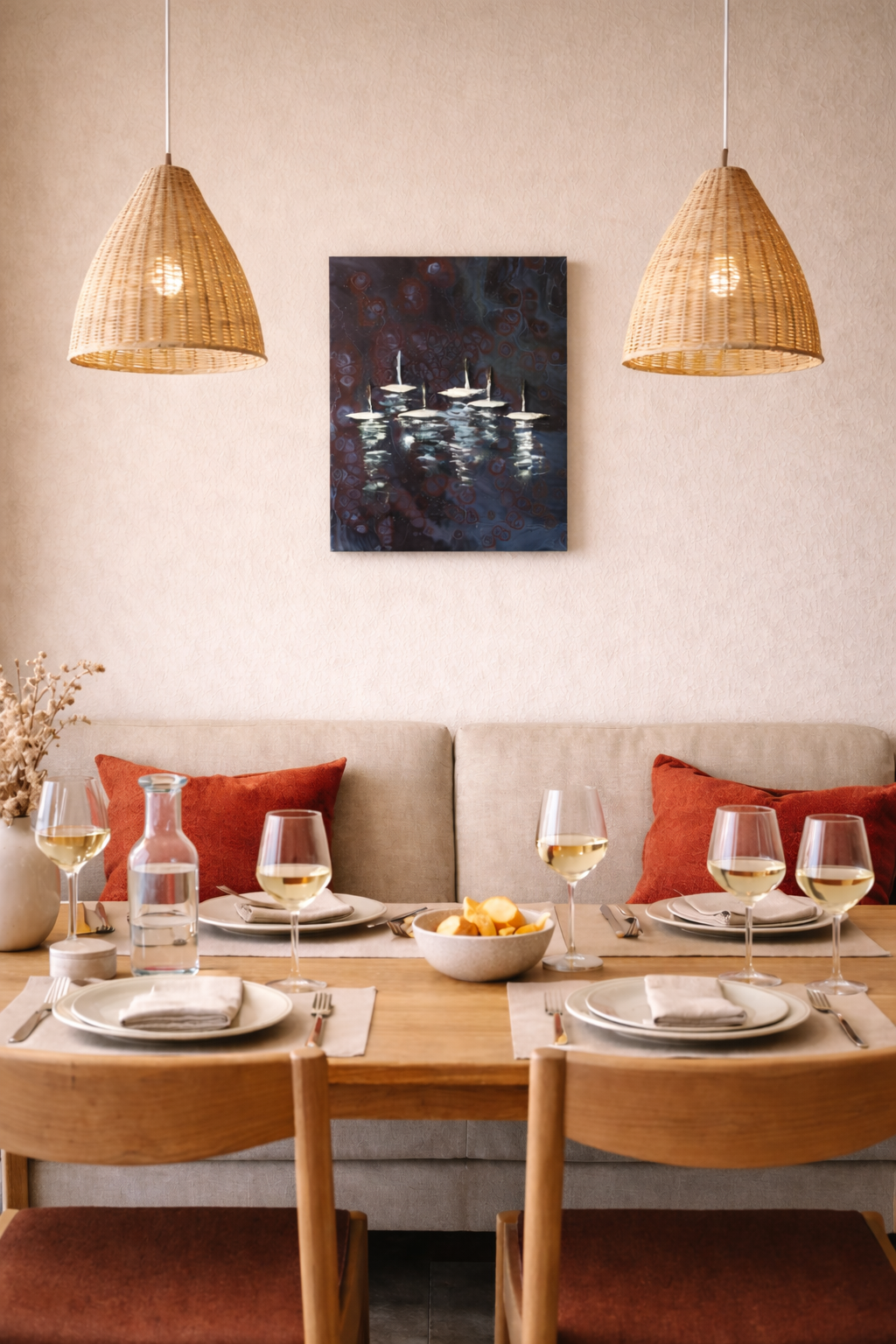 Later, I decided to continue the work with oil paint using the impasto technique, adding expressive textured strokes. The white shapes gradually transformed into elegant yachts sailing together across the water — like a graceful regatta moving quietly through the evening sea.