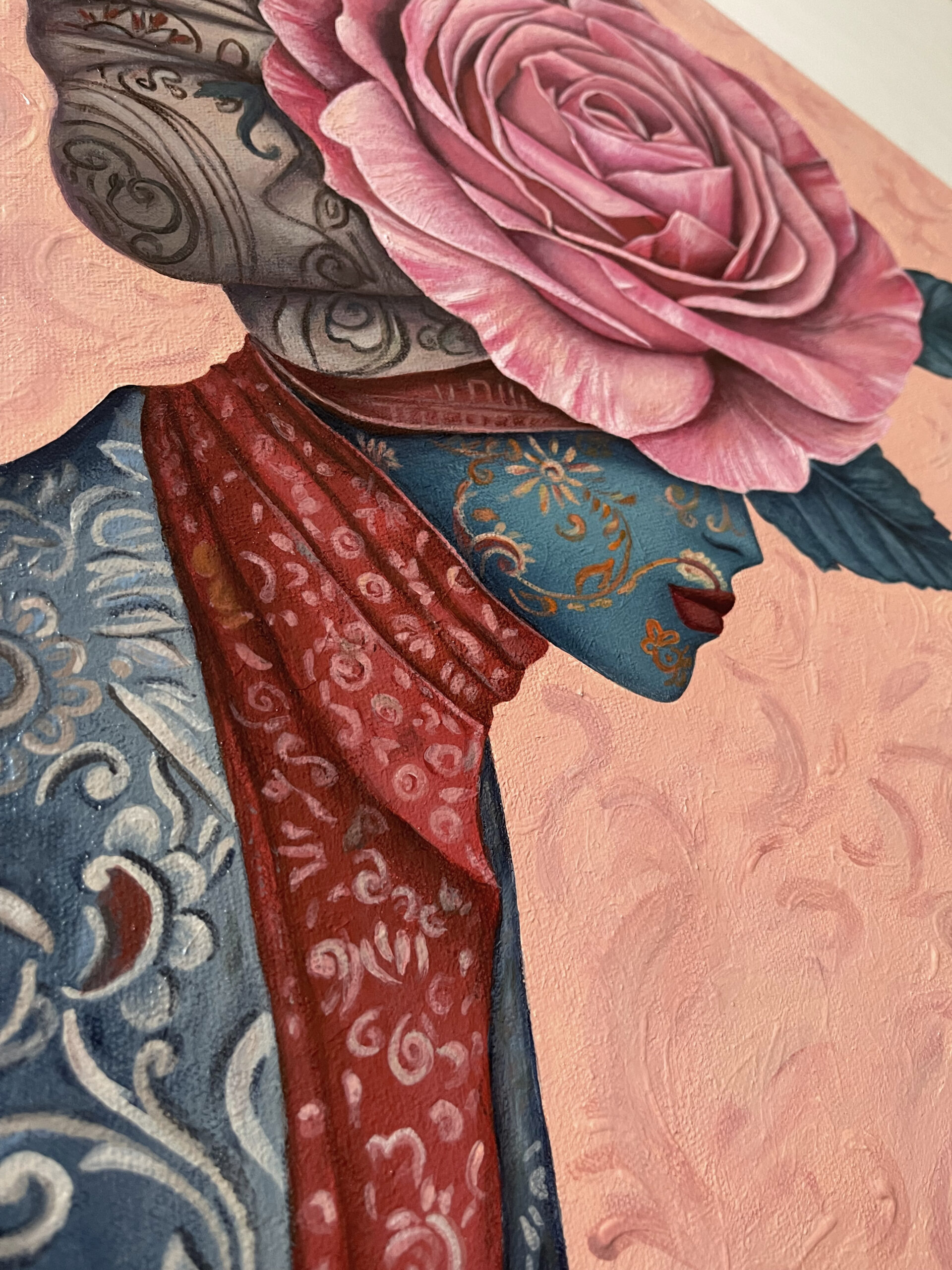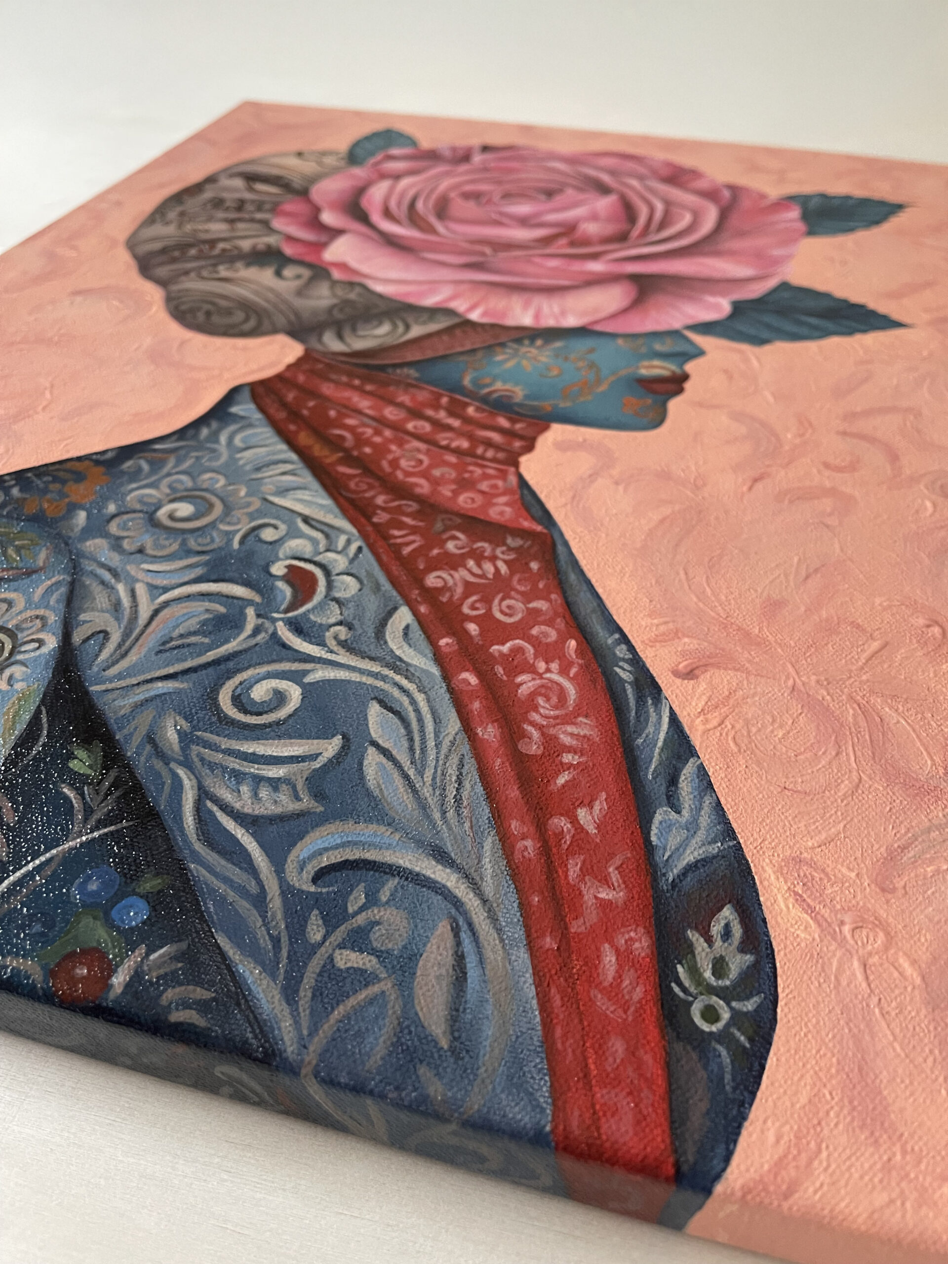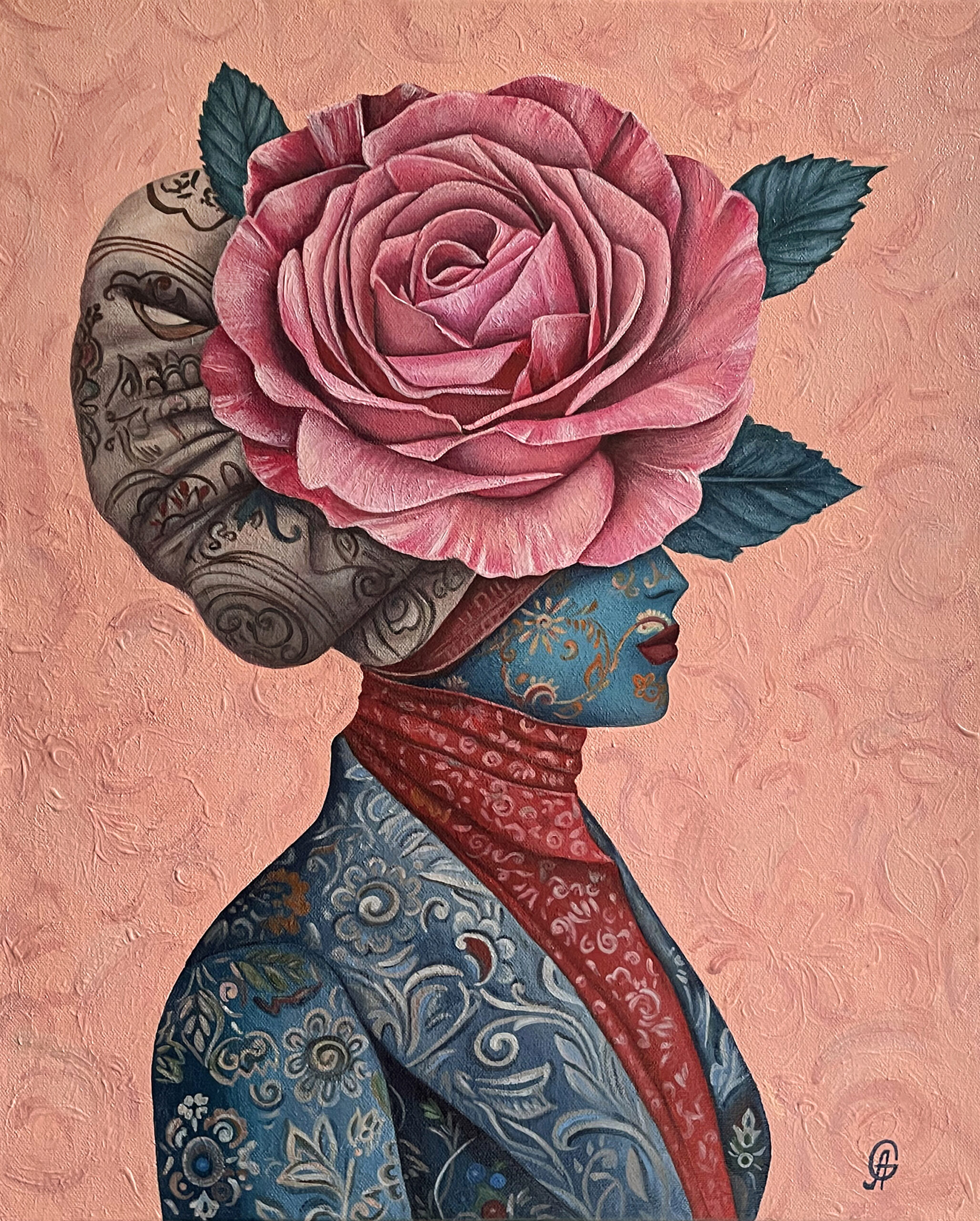 “Ambassador” is a surreal portrait of a mysterious figure whose face is hidden beneath a majestic rose, symbolizing beauty, grace, and diplomacy. Adorned in intricate patterns, she silently represents the delicate yet impactful presence each of us carries into the world. The painting invites viewers to reflect upon the subtle power of our personal messages, emotions, and intentions we share with others.