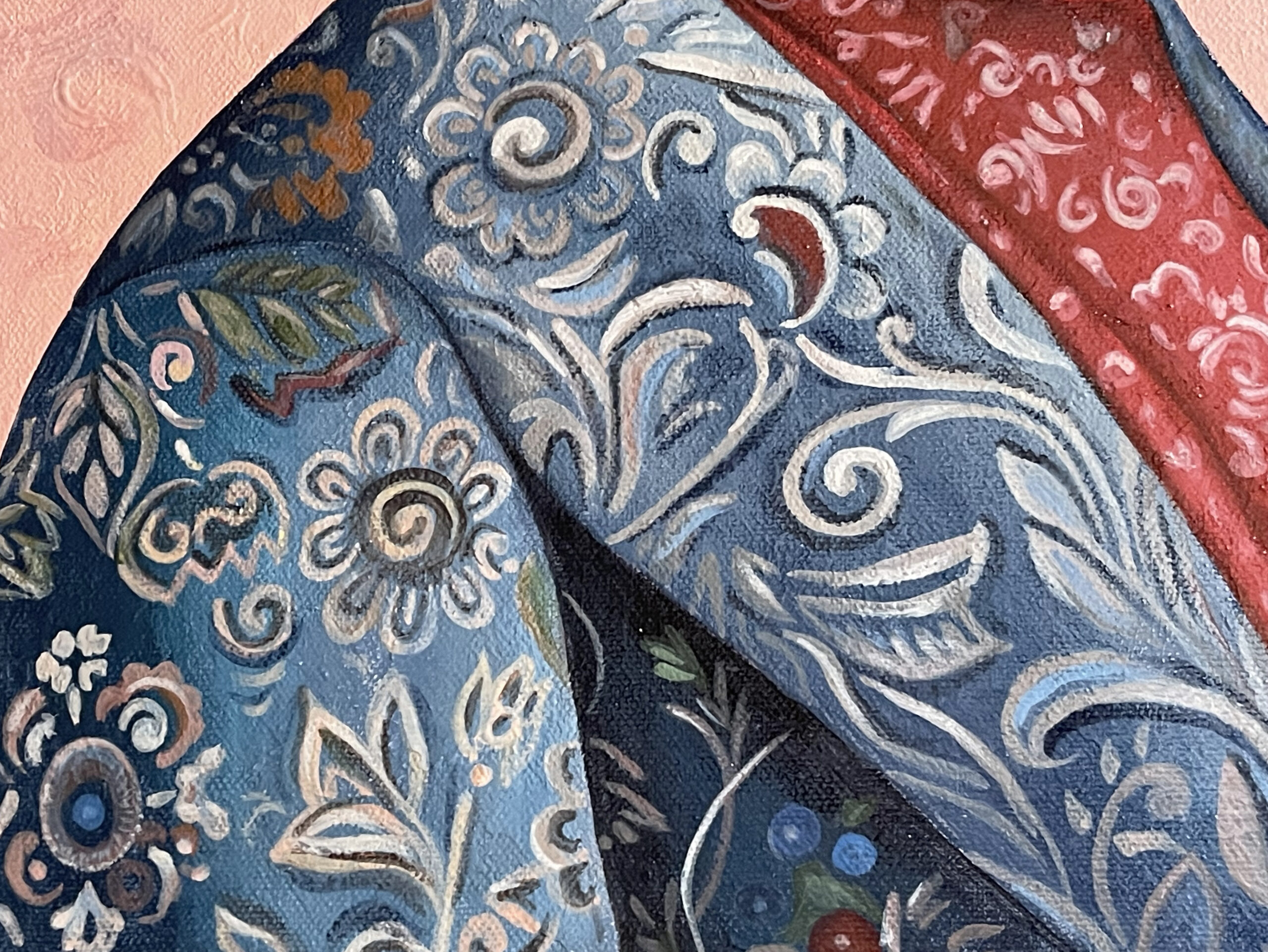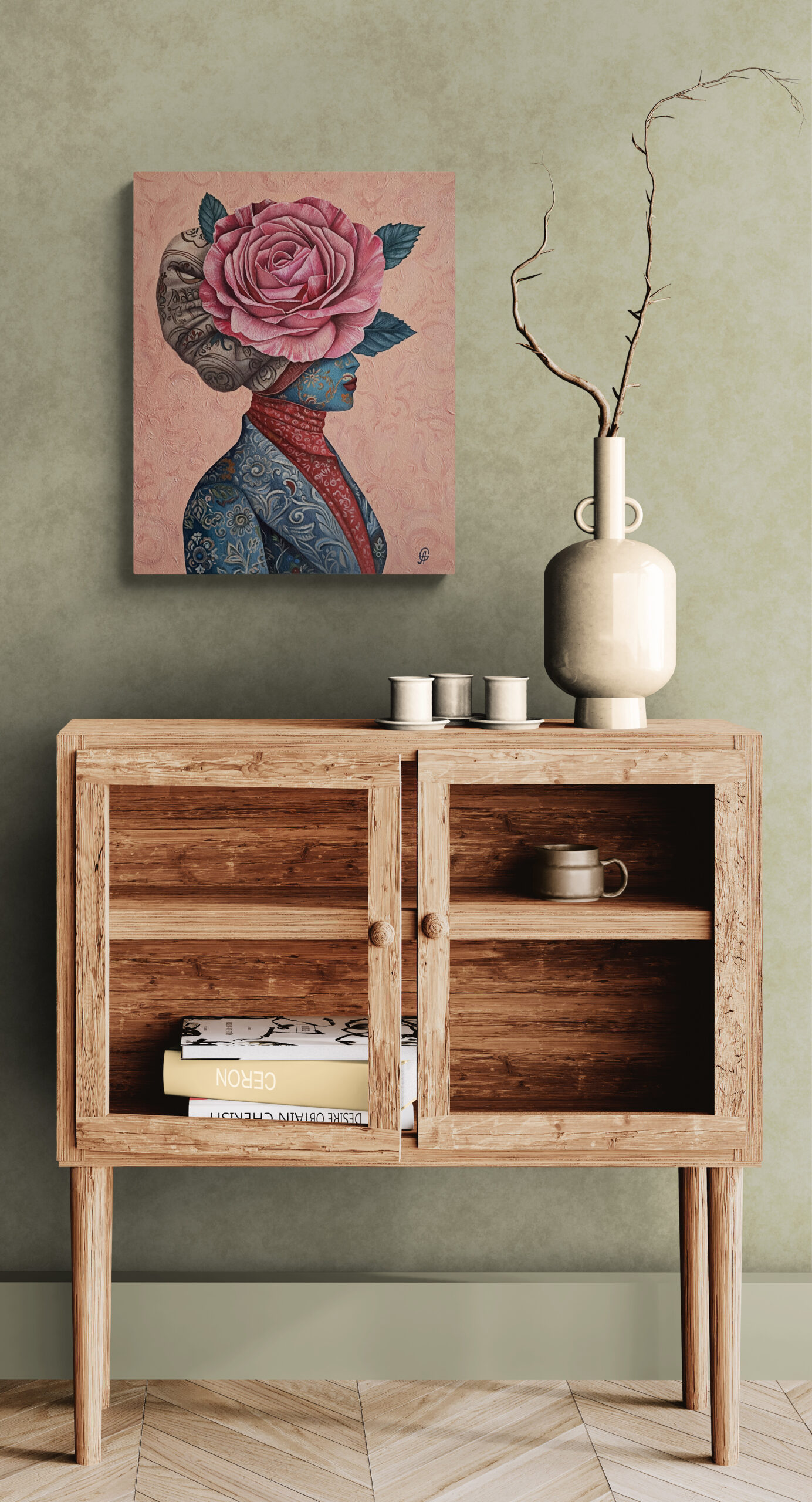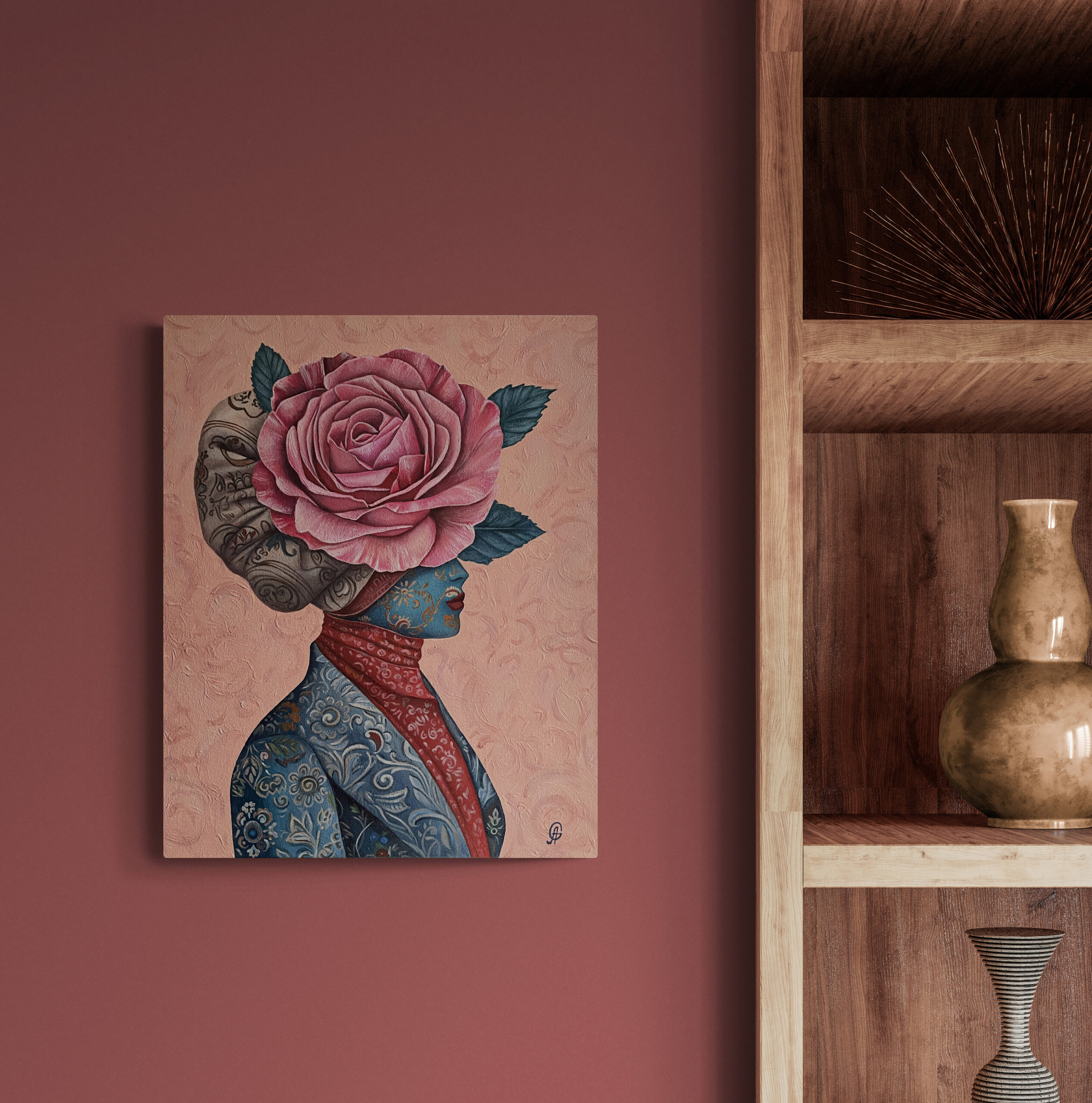 “Ambassador” is a surreal portrait of a mysterious figure whose face is hidden beneath a majestic rose, symbolizing beauty, grace, and diplomacy. Adorned in intricate patterns, she silently represents the delicate yet impactful presence each of us carries into the world. The painting invites viewers to reflect upon the subtle power of our personal messages, emotions, and intentions we share with others.