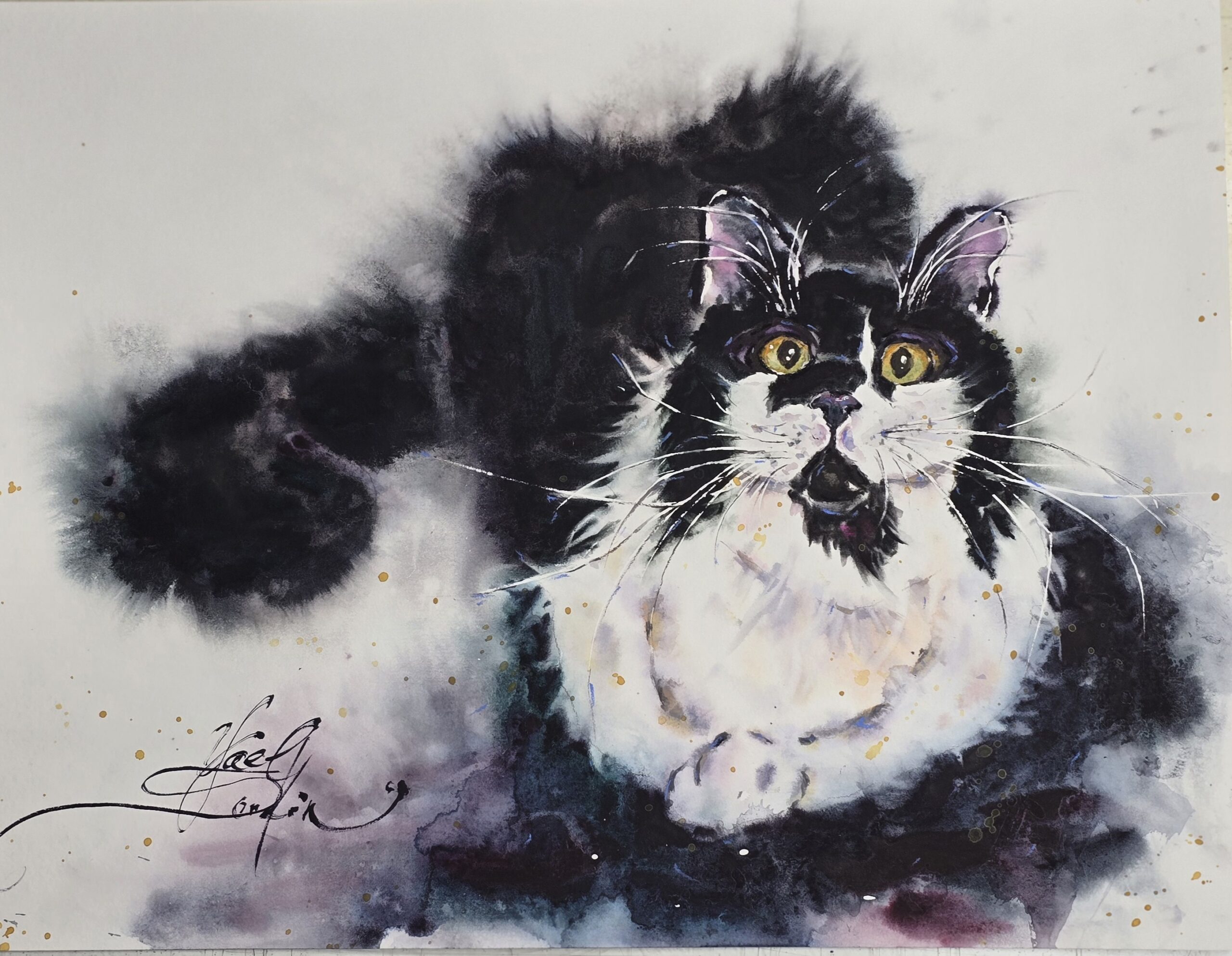 Black & Fluffy Cat – Original Watercolor Painting