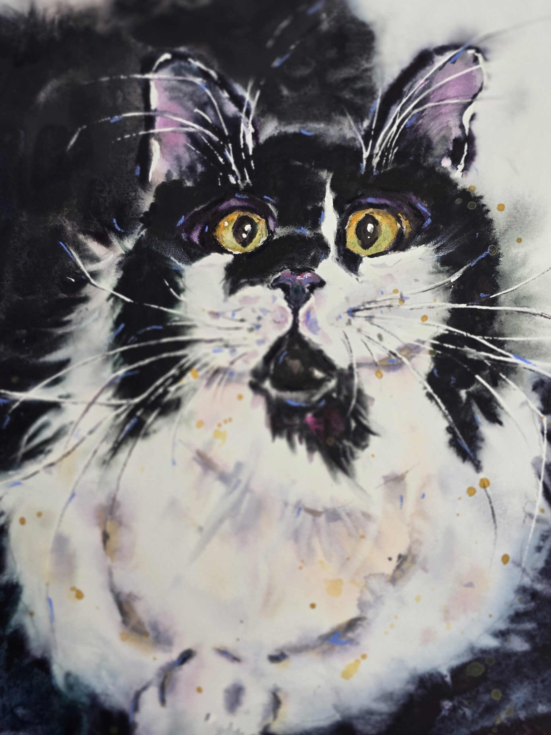 🎨This original watercolor painting captures the beauty and charm of a black fluffy cat with striking golden eyes.