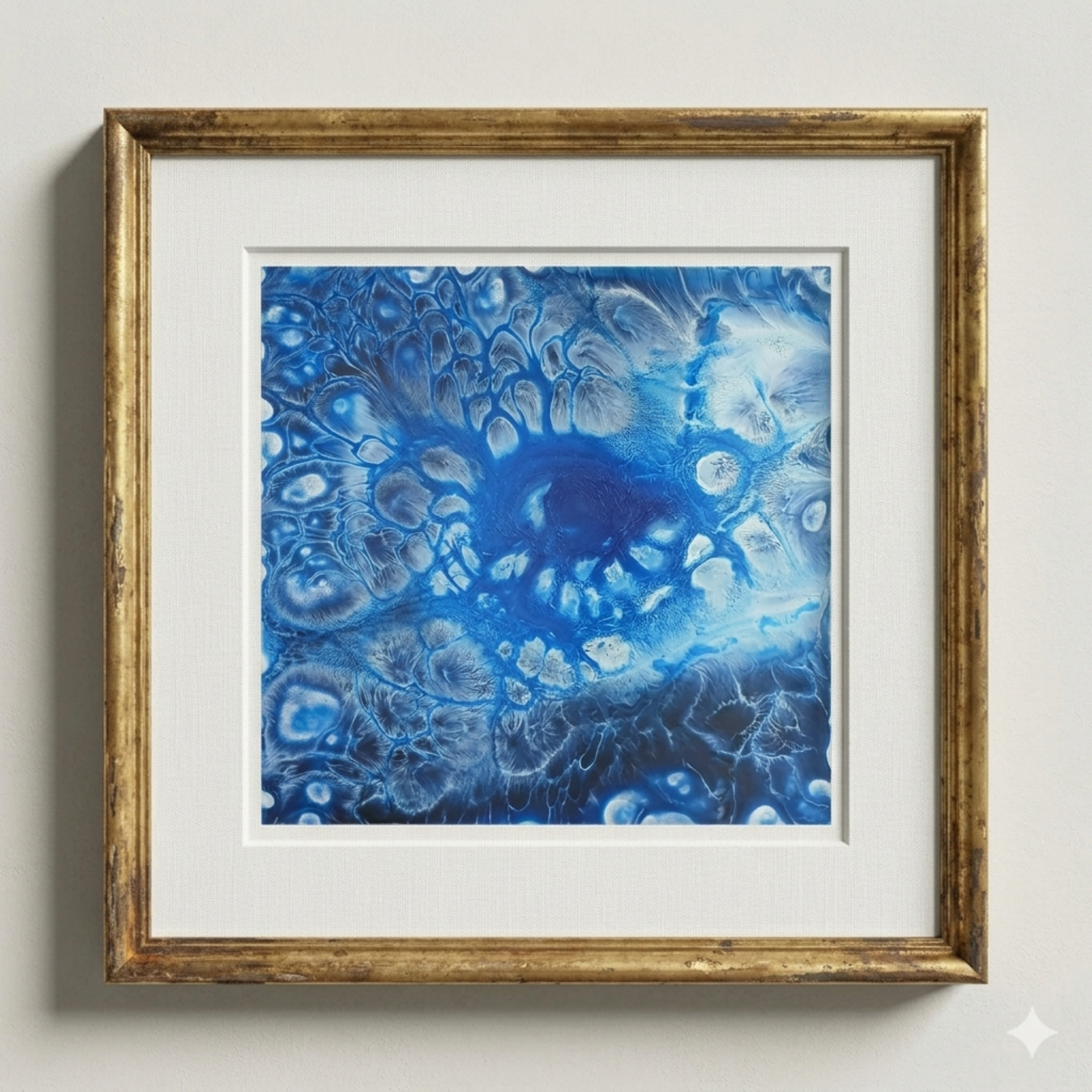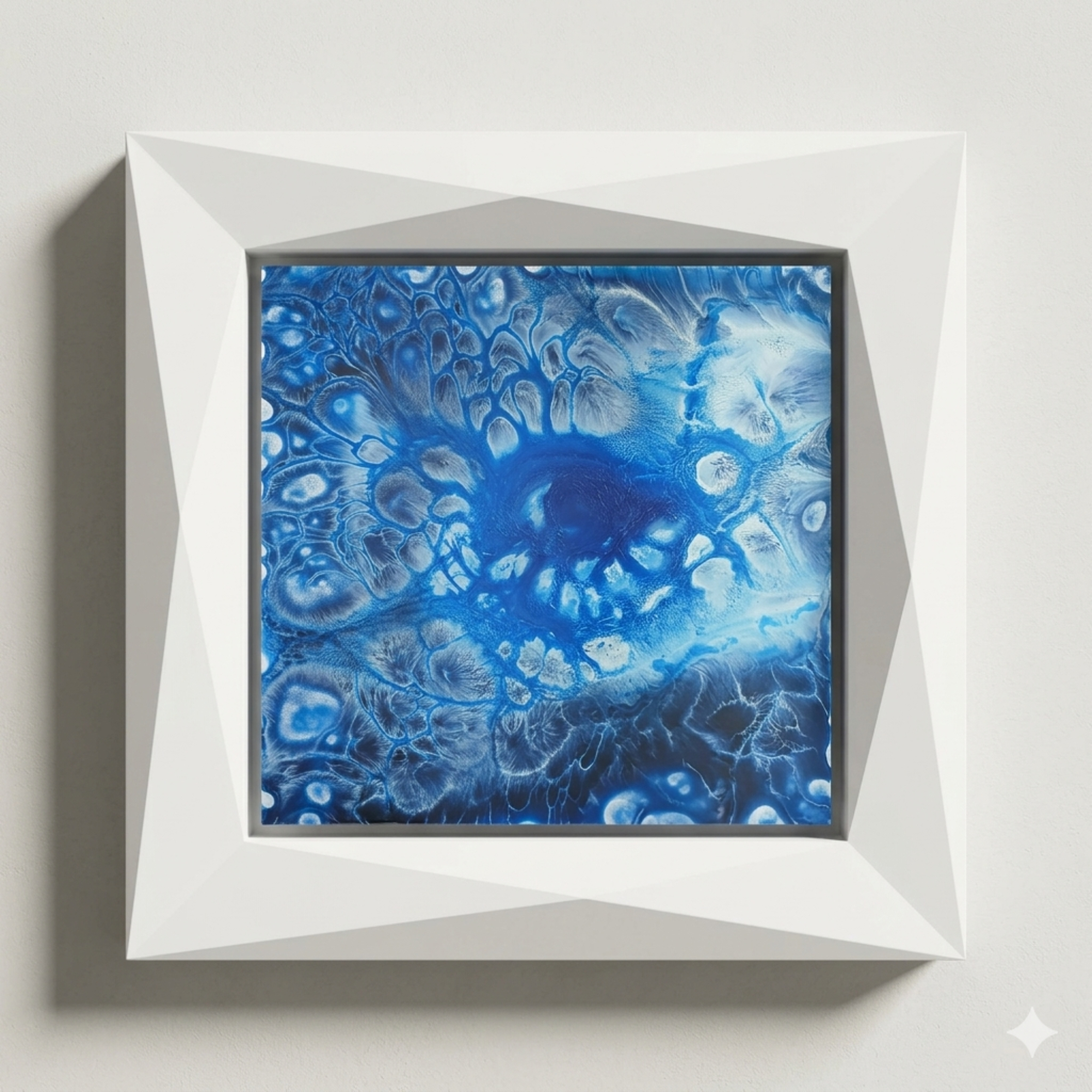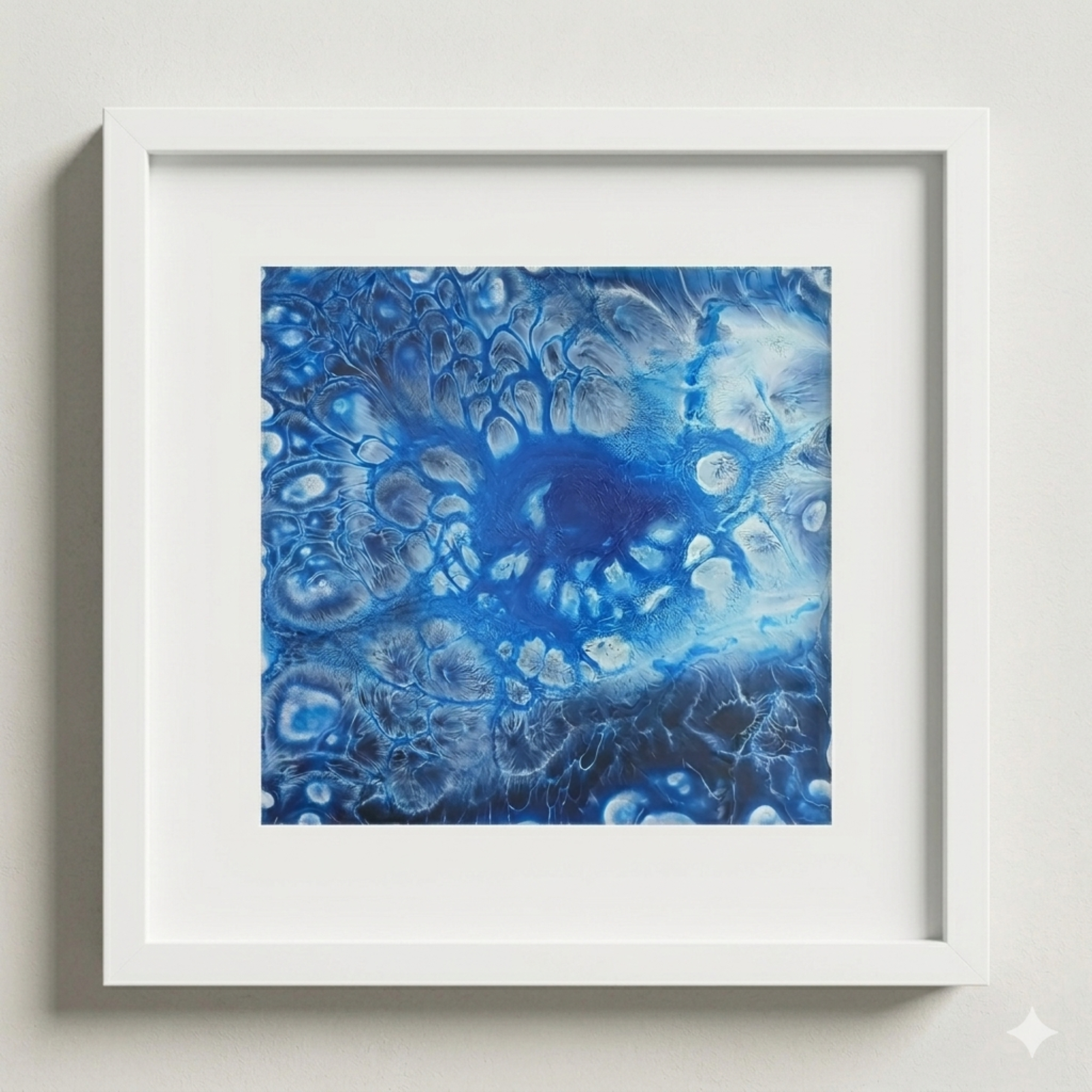 The artwork presents an organic, flowing structure created through fluid art techniques, where layers of blue, white, and soft gray tones naturally form eye-like patterns. The central focal point resembles an all-seeing eye, radiating outward with intricate cellular formations and soft transitions. This visual effect enhances the sense of depth and energy, making the piece feel both dynamic and meditative.