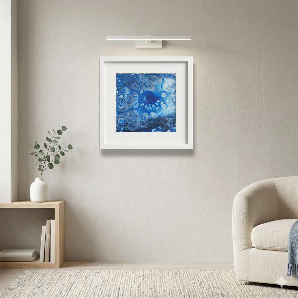 Created with acrylic on canvas, the painting reflects the aesthetics of abstract spiritual art, symbolic painting, and contemporary wall art. The fluid application of paint results in unique textures and natural patterns, ensuring that no element is repeated — reinforcing the artwork’s identity as a one-of-a-kind original painting. The cool blue palette is often associated with calmness, clarity, and protection, making this piece especially appealing for collectors seeking meaningful and атмосферное art.