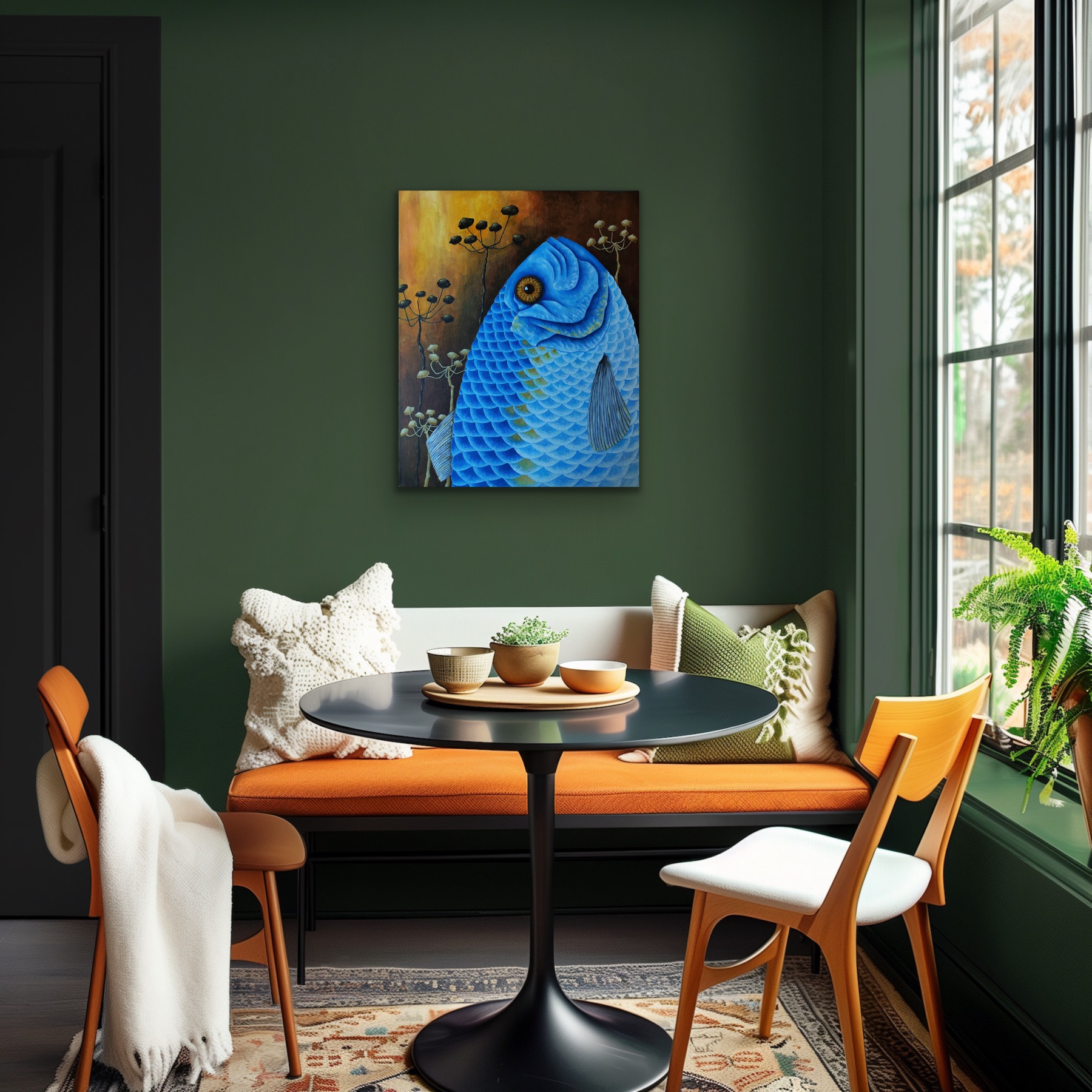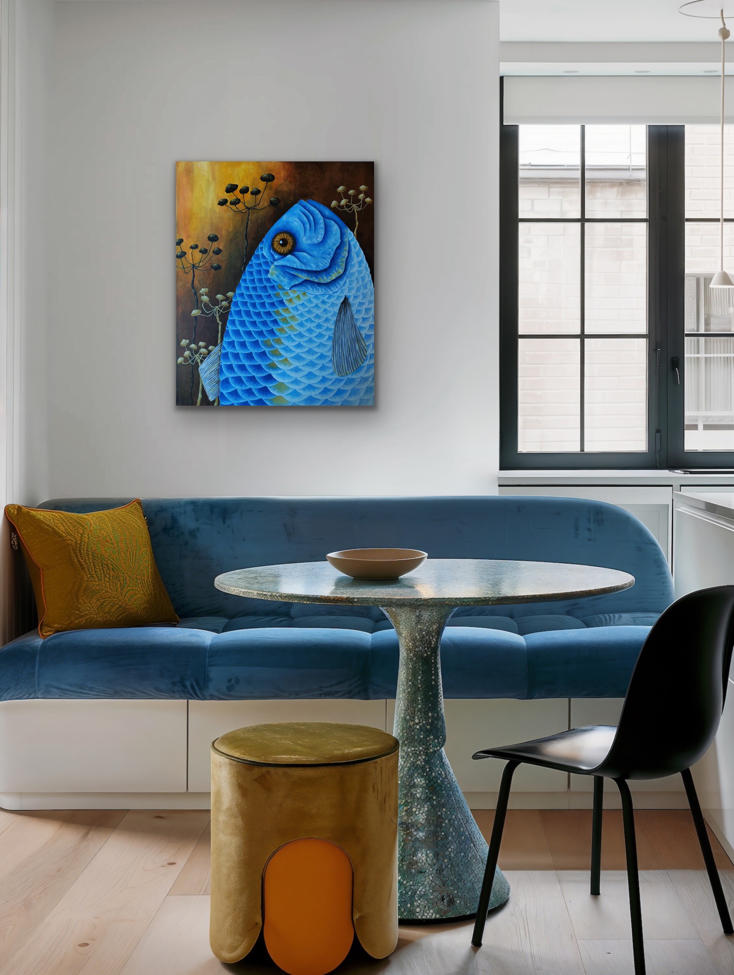 A large blue fish emerges from the canvas, shown not in full but in an intimate close-up that feels both serene and quietly surreal. Her scales shimmer in layered blues with soft touches of gold, while her amber eye appears watchful, reflective — as if she is paused in a moment that continues beyond the frame.