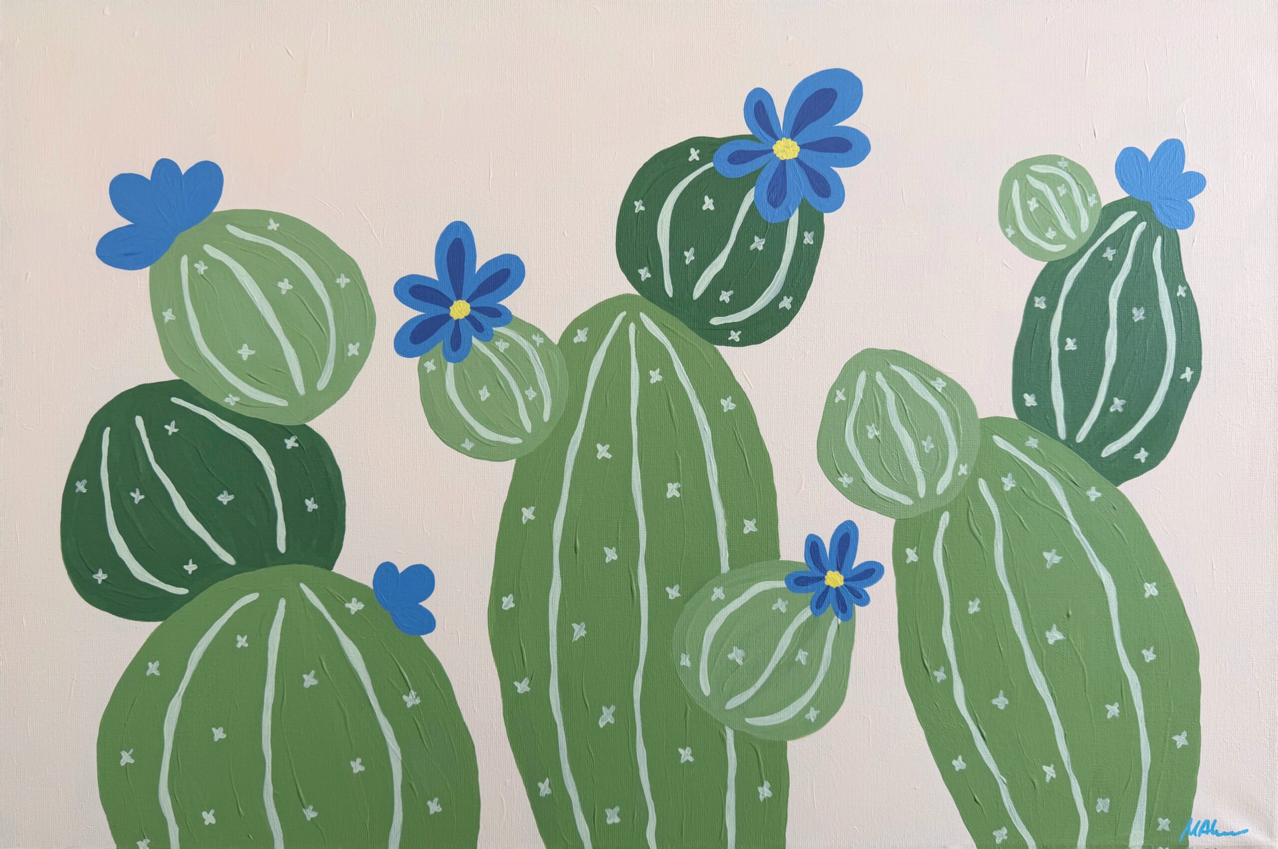 “Blue Flowers on Cactus”, acrylic on canvas, 40 x 60 cm, 2026, artist: Alena Masyutina.