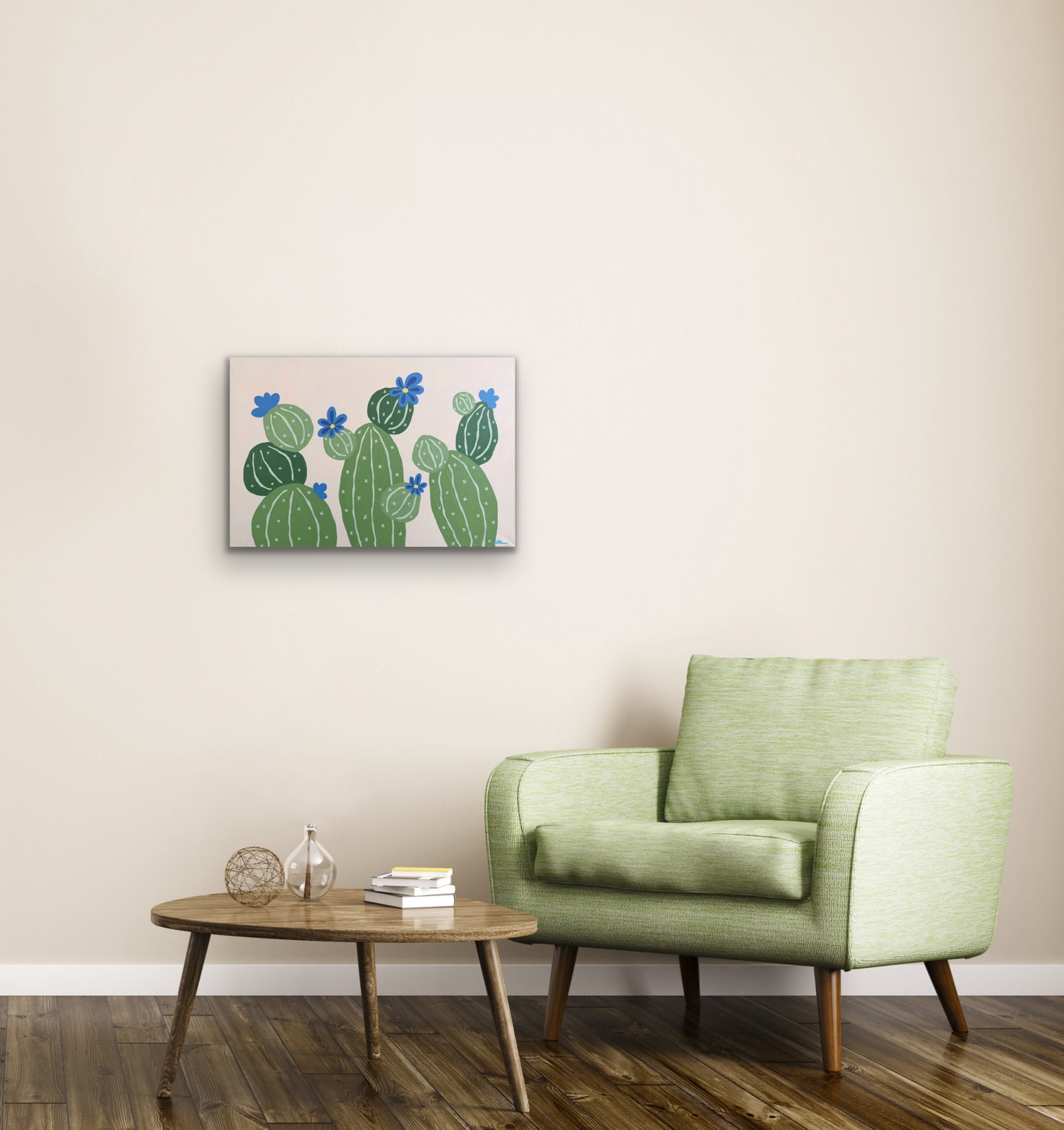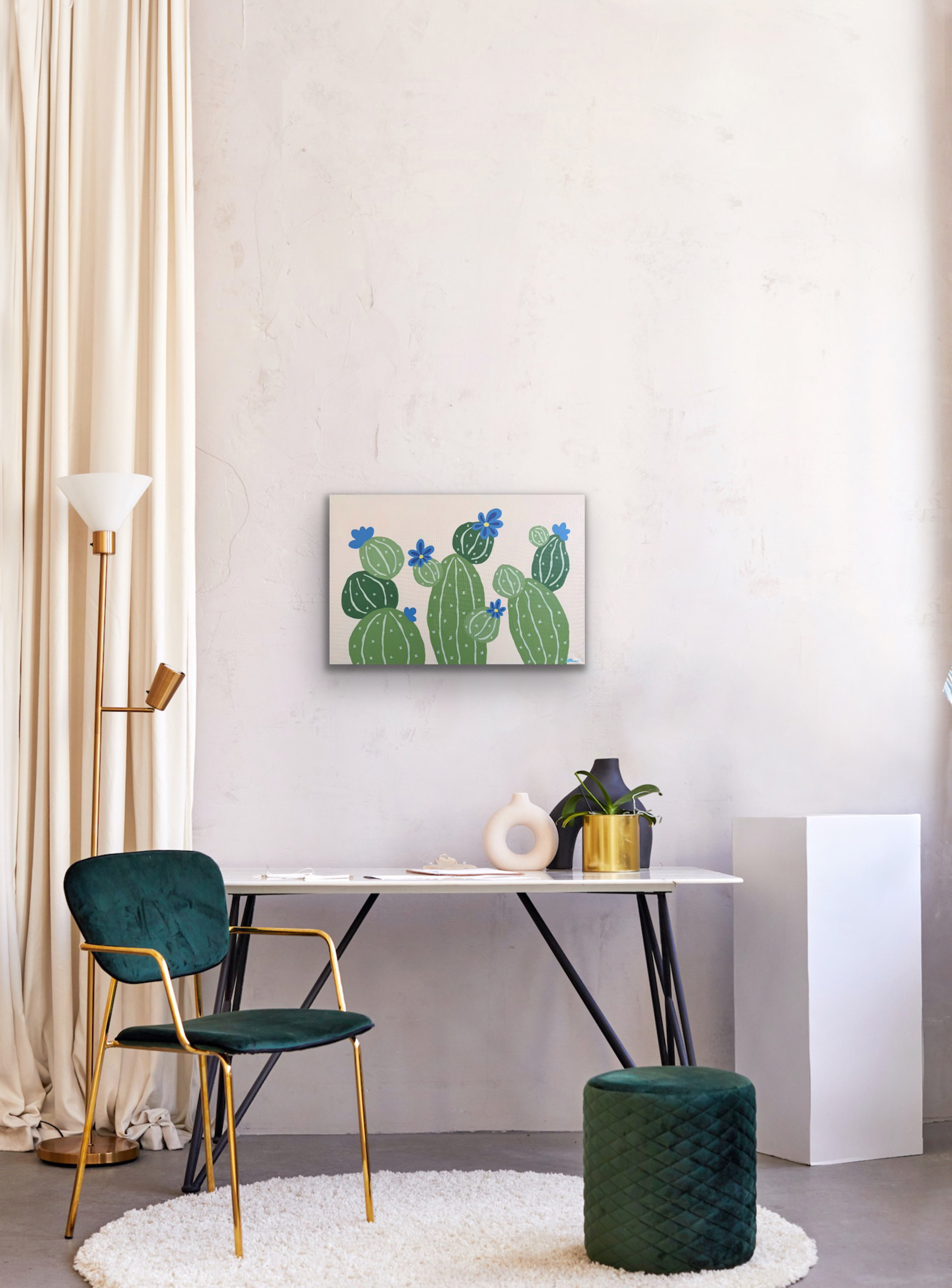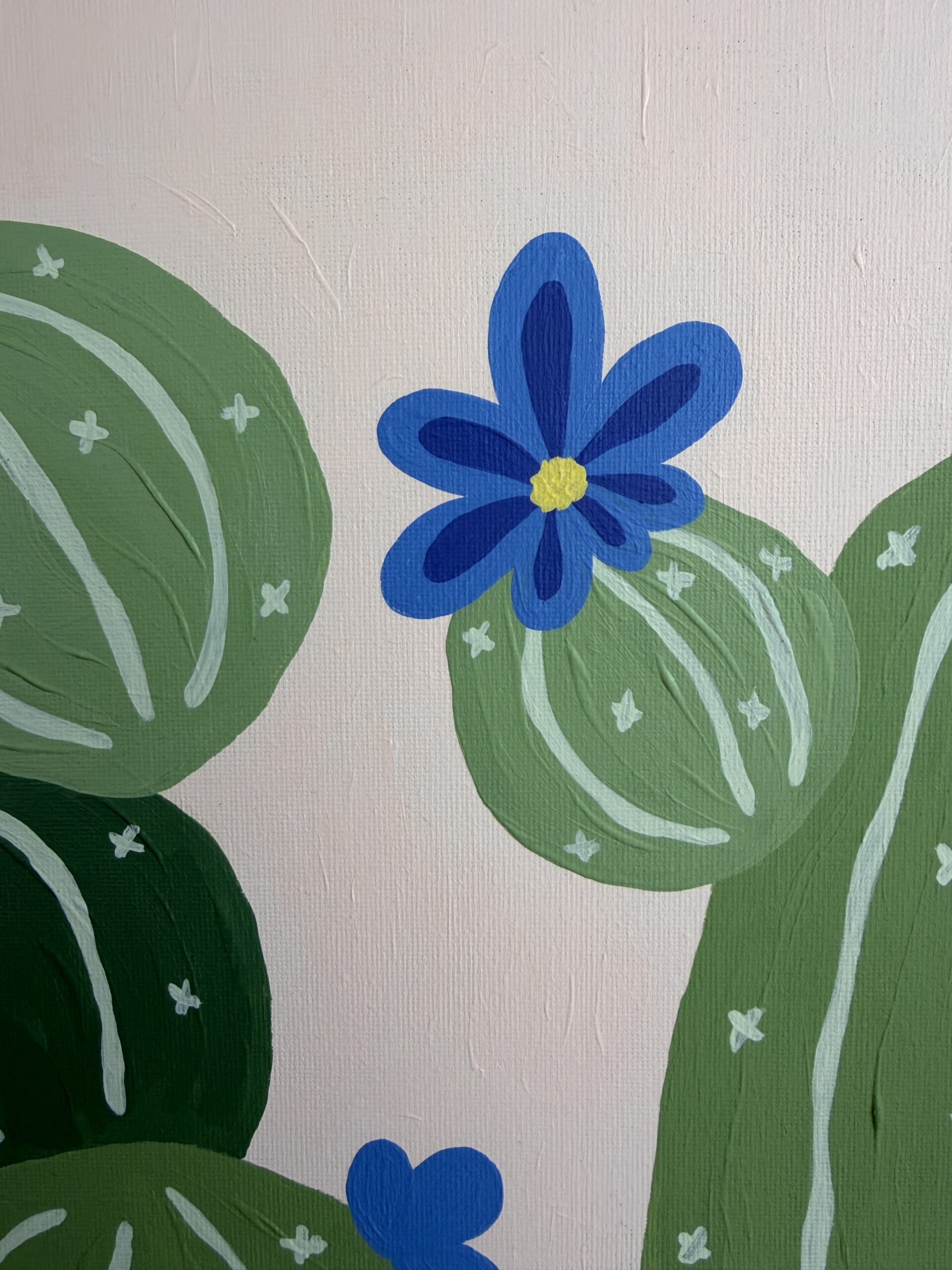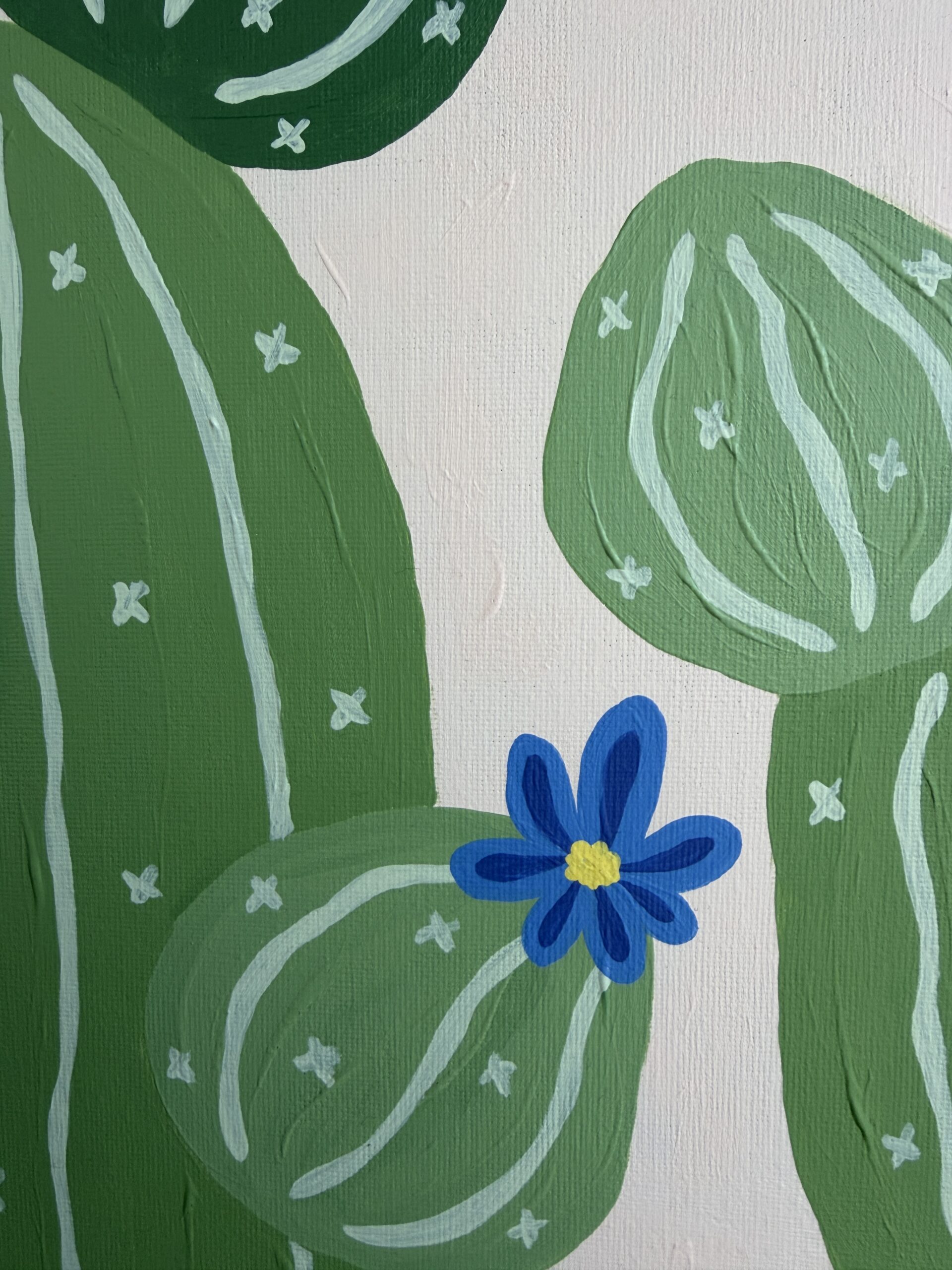 A calm, minimalistic painting of cactus plants with soft blue flowers. Simple organic shapes and a gentle color palette create a quiet, peaceful atmosphere. This artwork continues my series of imagined botanical forms, offering a small, tranquil space to pause and breathe.