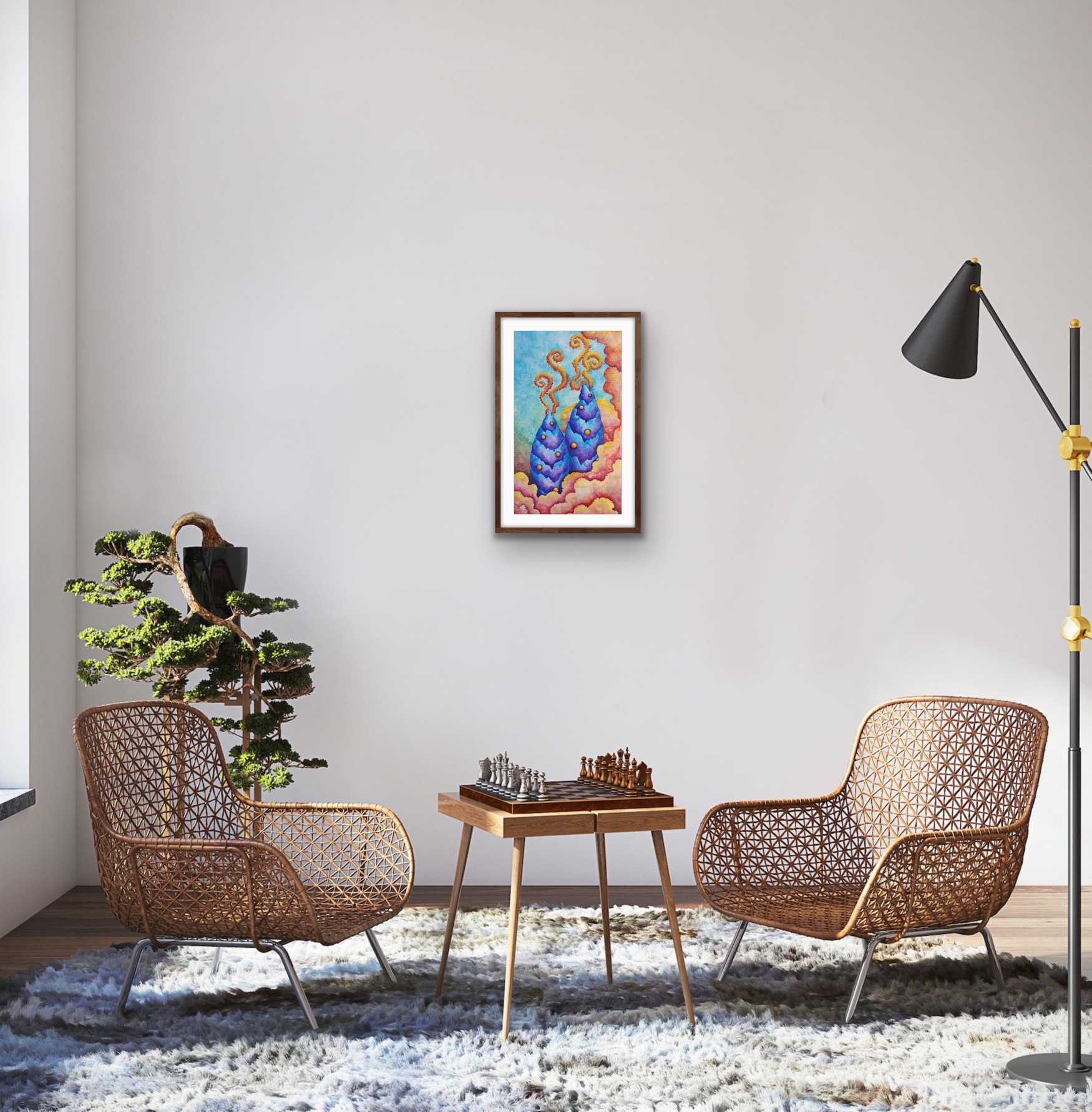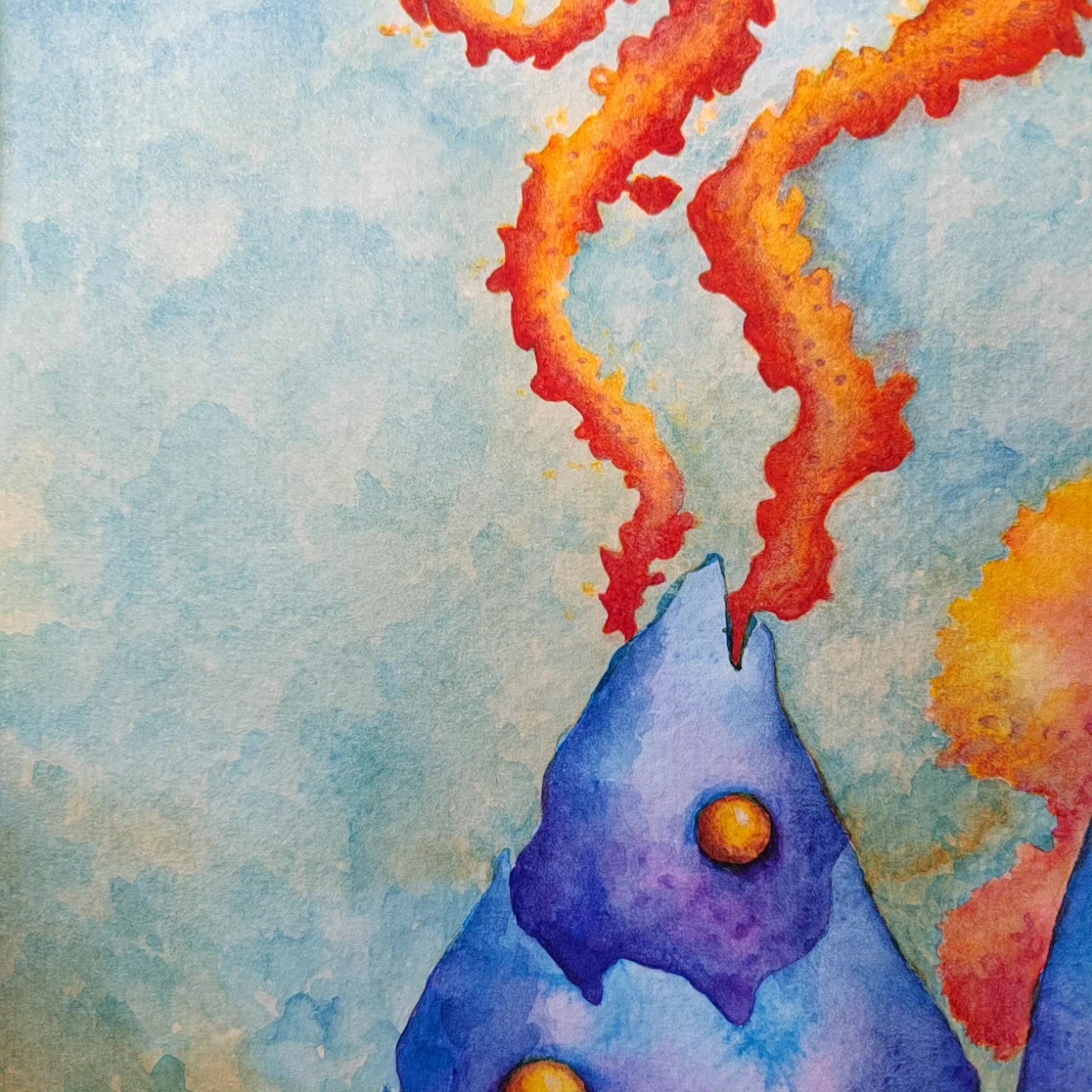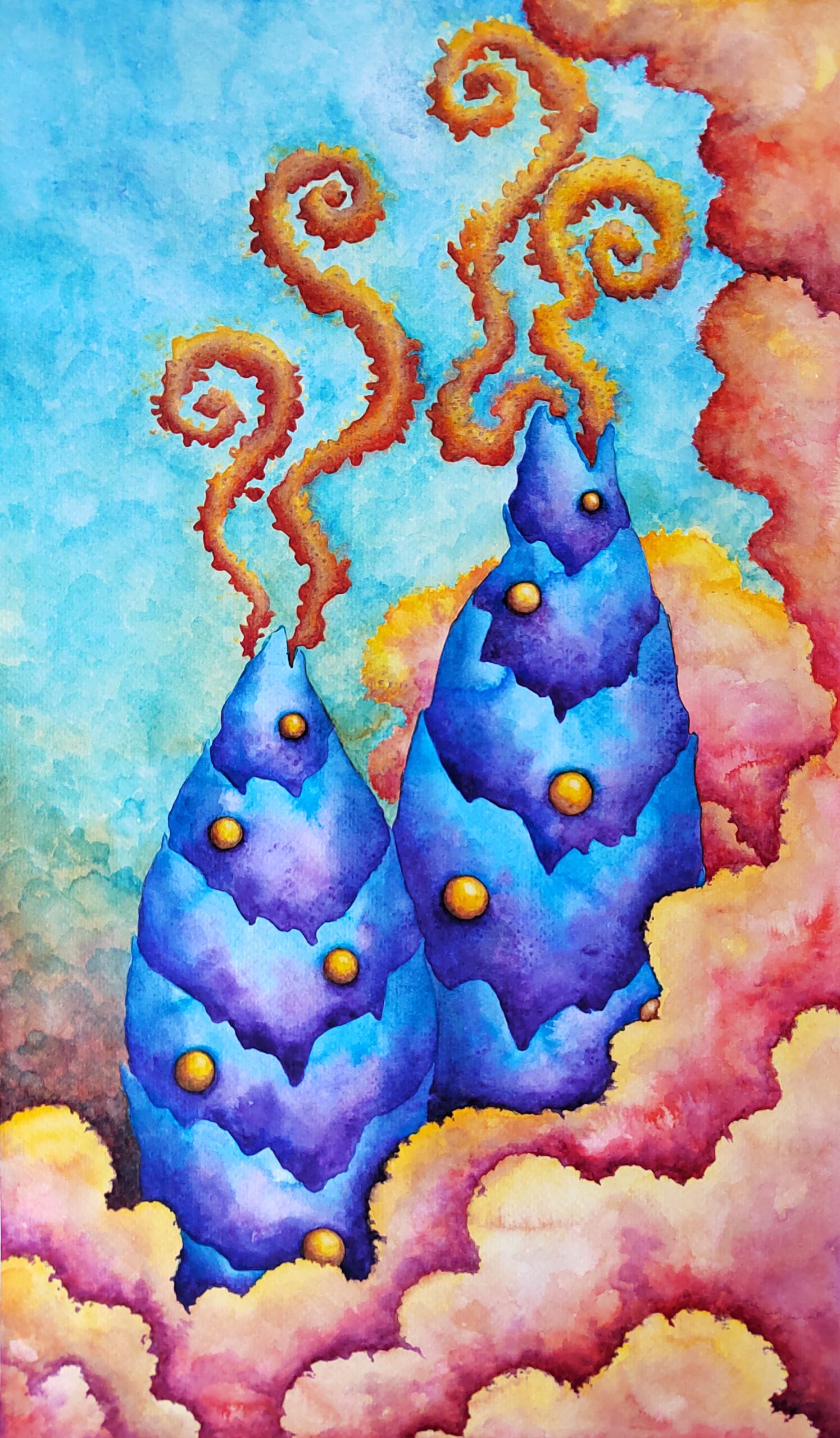 In Boundaries of One’s Sky, towering blue cone-shaped forms rise like dreamlike mountains, their peaks releasing spiraling trails of fiery smoke. Glowing golden orbs are scattered across their surfaces, while vibrant, swirling clouds in shades of pink, orange, and yellow envelop the scene. The vivid turquoise sky opens a window into an imaginative world where boundaries are fluid, and the sky is uniquely one’s own. This watercolor piece invites reflection on personal horizons, wonder, and the ever-shifting landscapes within.