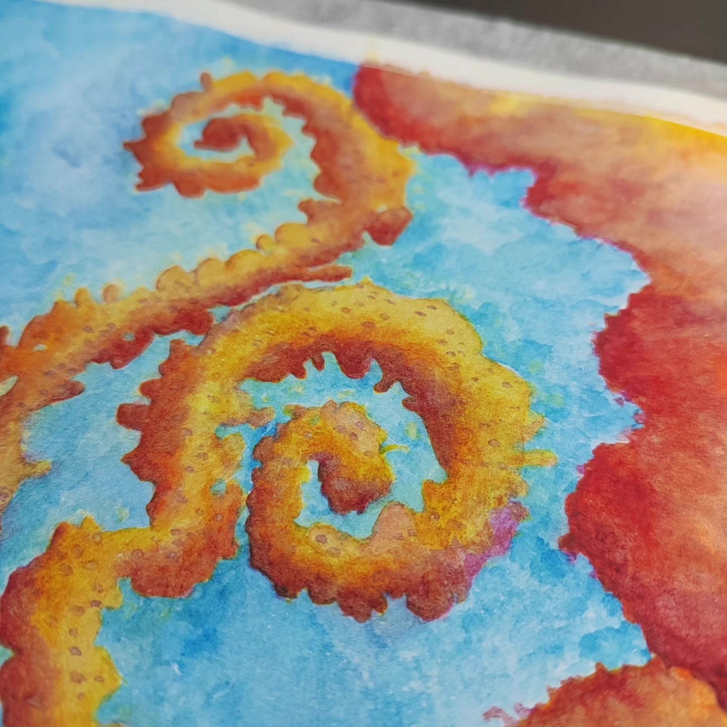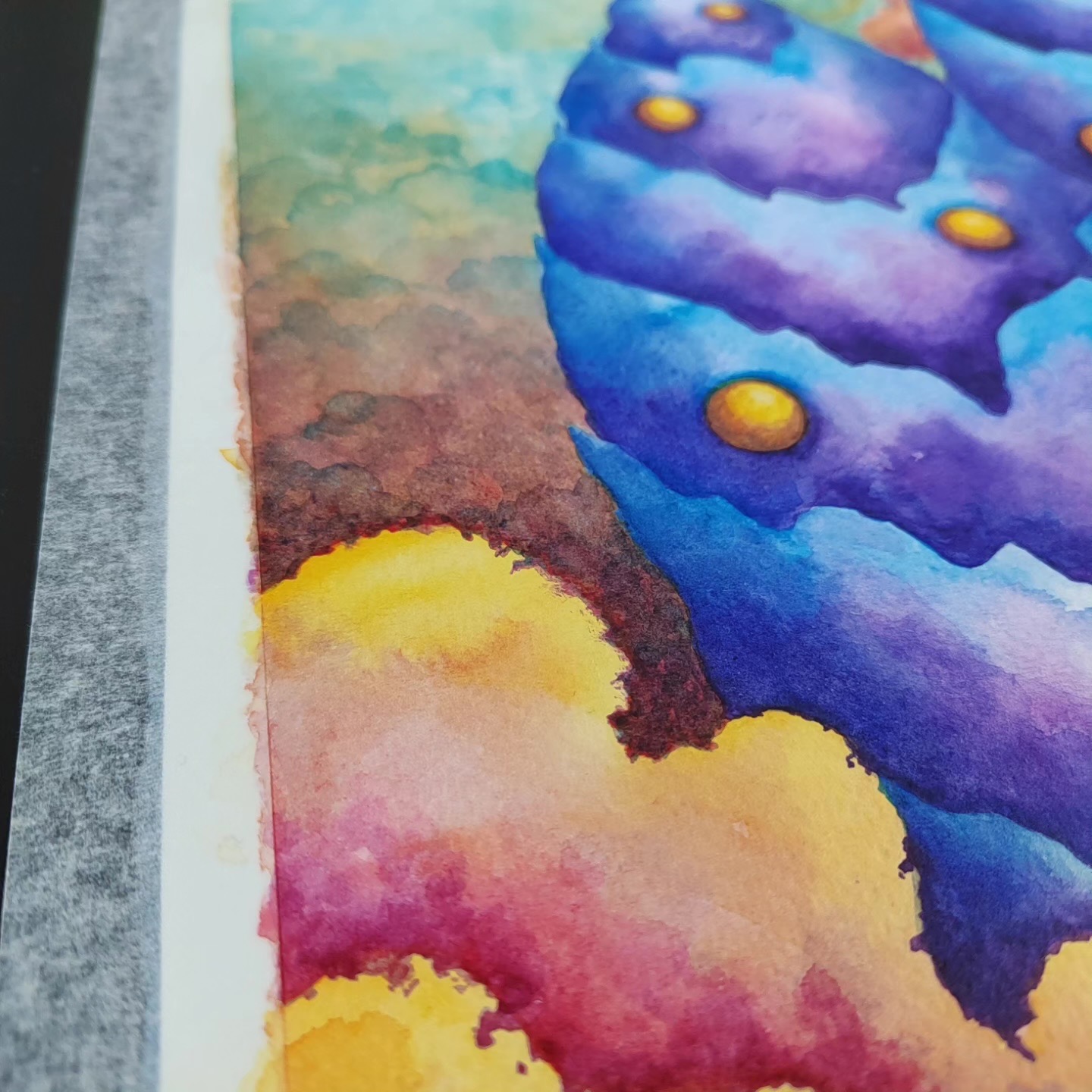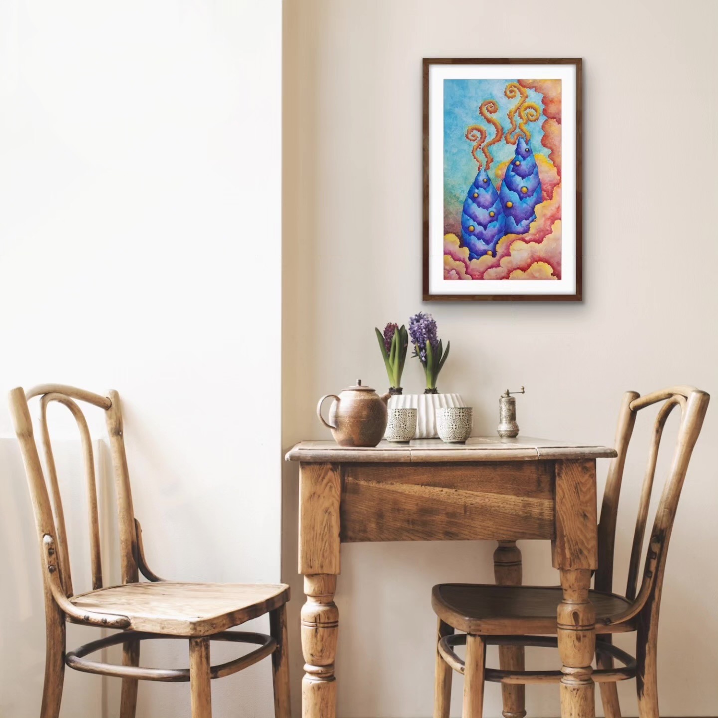 In Boundaries of One’s Sky, towering blue cone-shaped forms rise like dreamlike mountains, their peaks releasing spiraling trails of fiery smoke. Glowing golden orbs are scattered across their surfaces, while vibrant, swirling clouds in shades of pink, orange, and yellow envelop the scene. The vivid turquoise sky opens a window into an imaginative world where boundaries are fluid, and the sky is uniquely one’s own. This watercolor piece invites reflection on personal horizons, wonder, and the ever-shifting landscapes within.