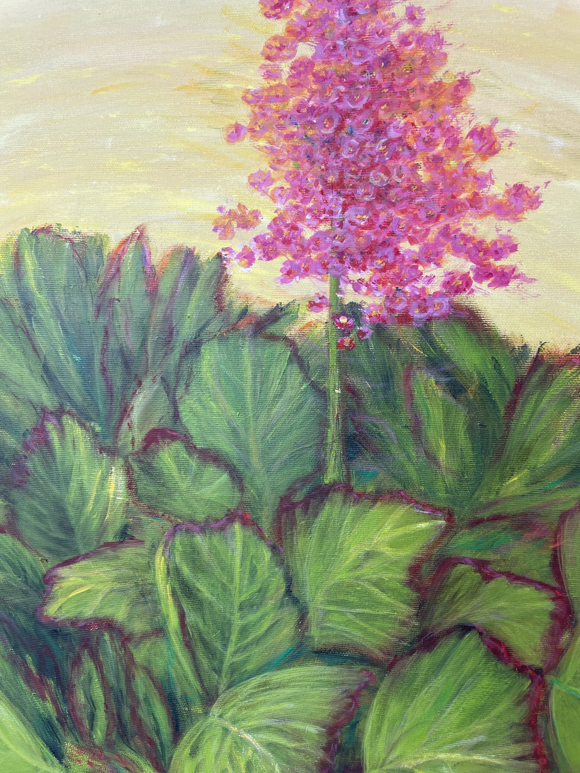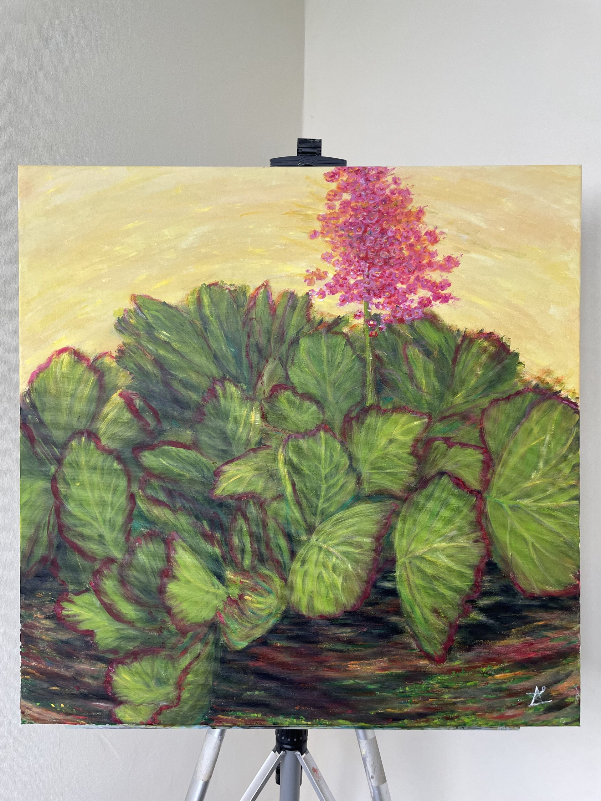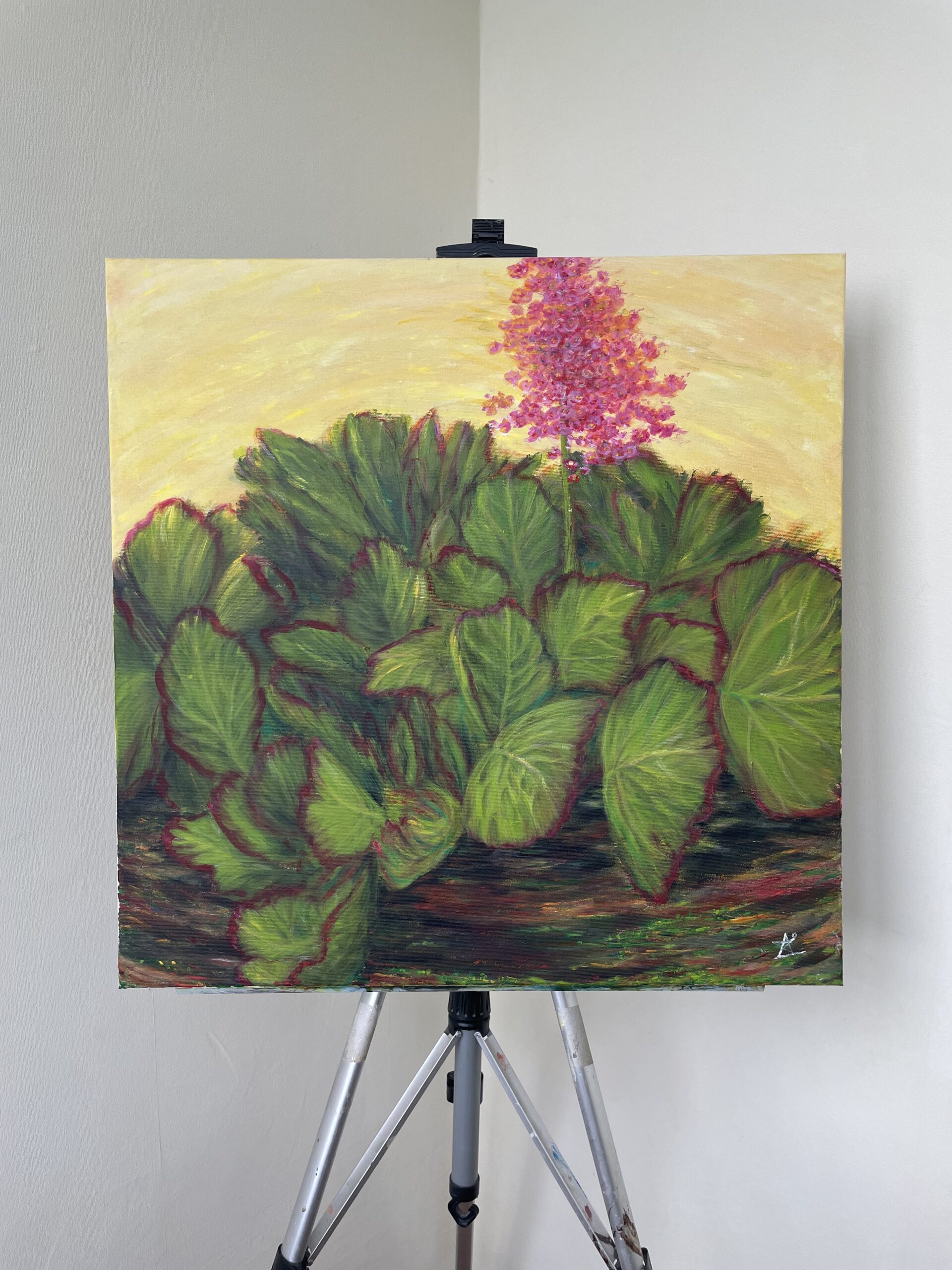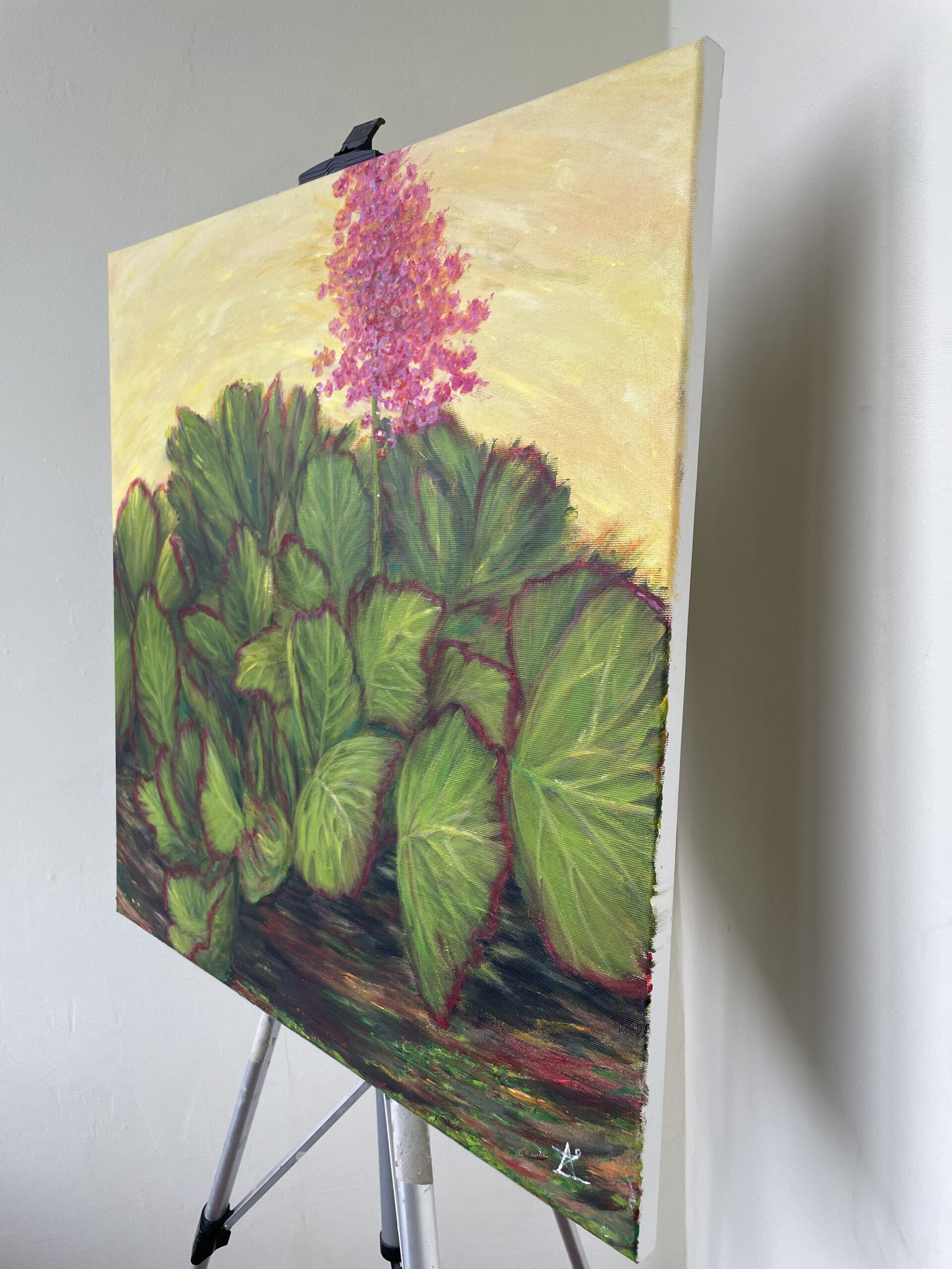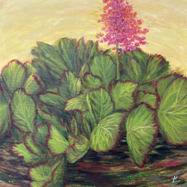 Sunlit bergenia on canvas – оригінал, vibrant, і full of life.