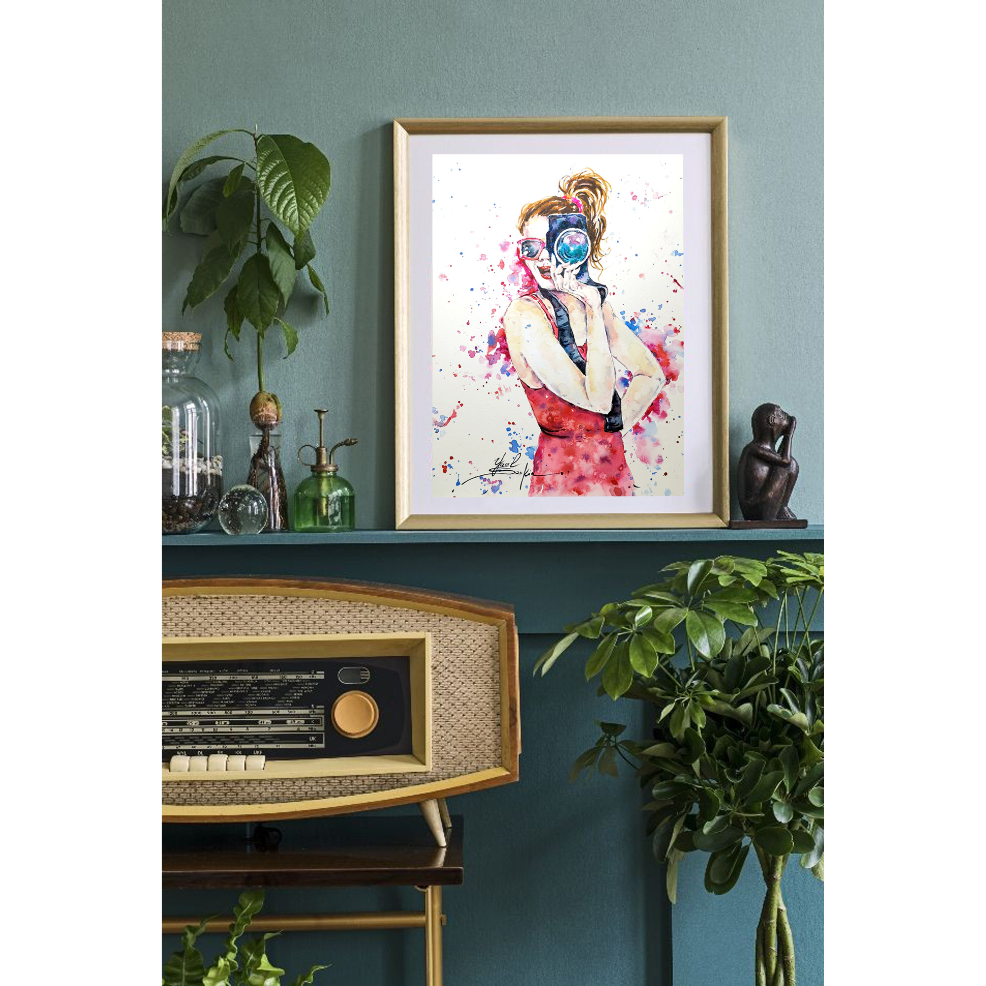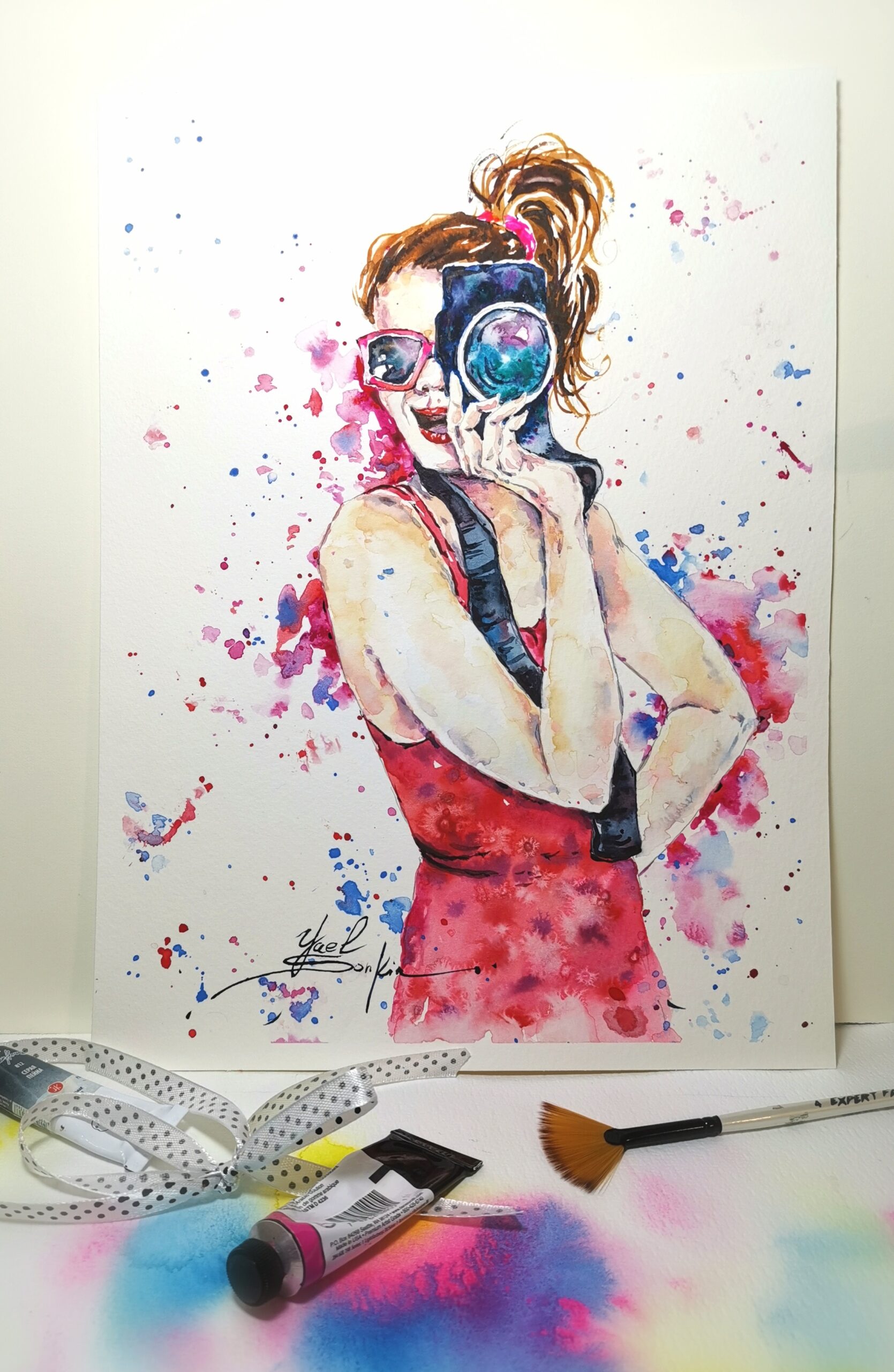 🎨This original watercolor painting features a young girl photographer with a camera, wearing a red dress and sunglasses.