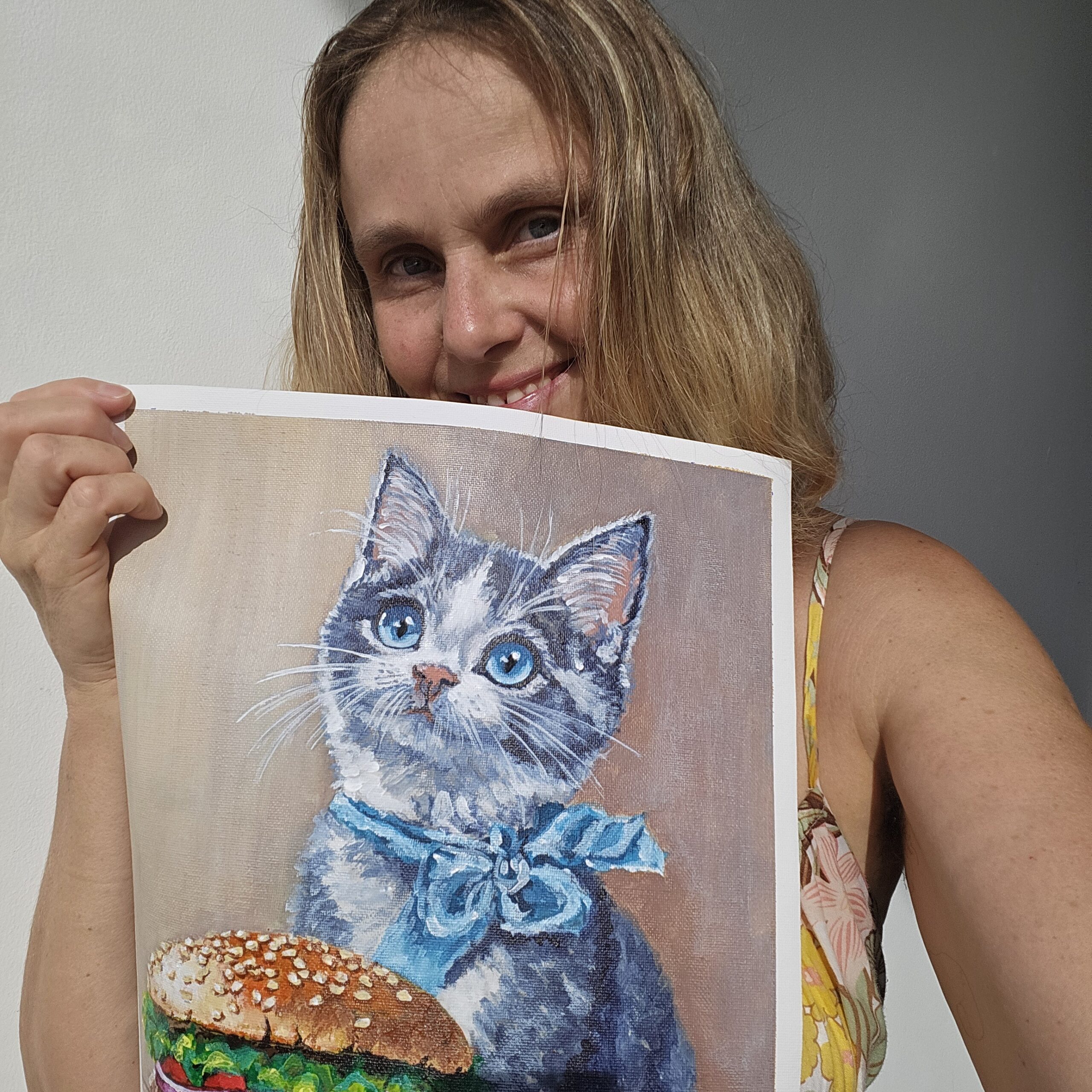 In this charming figurative artwork, a wide-eyed kitten with luminous blue eyes sits attentively beside an oversized burger. A delicate turquoise ribbon tied around its neck introduces the artist’s beloved palette of blue and oceanic tones — colors that frequently appear throughout her original art and reflect clarity, openness, and emotional sincerity.