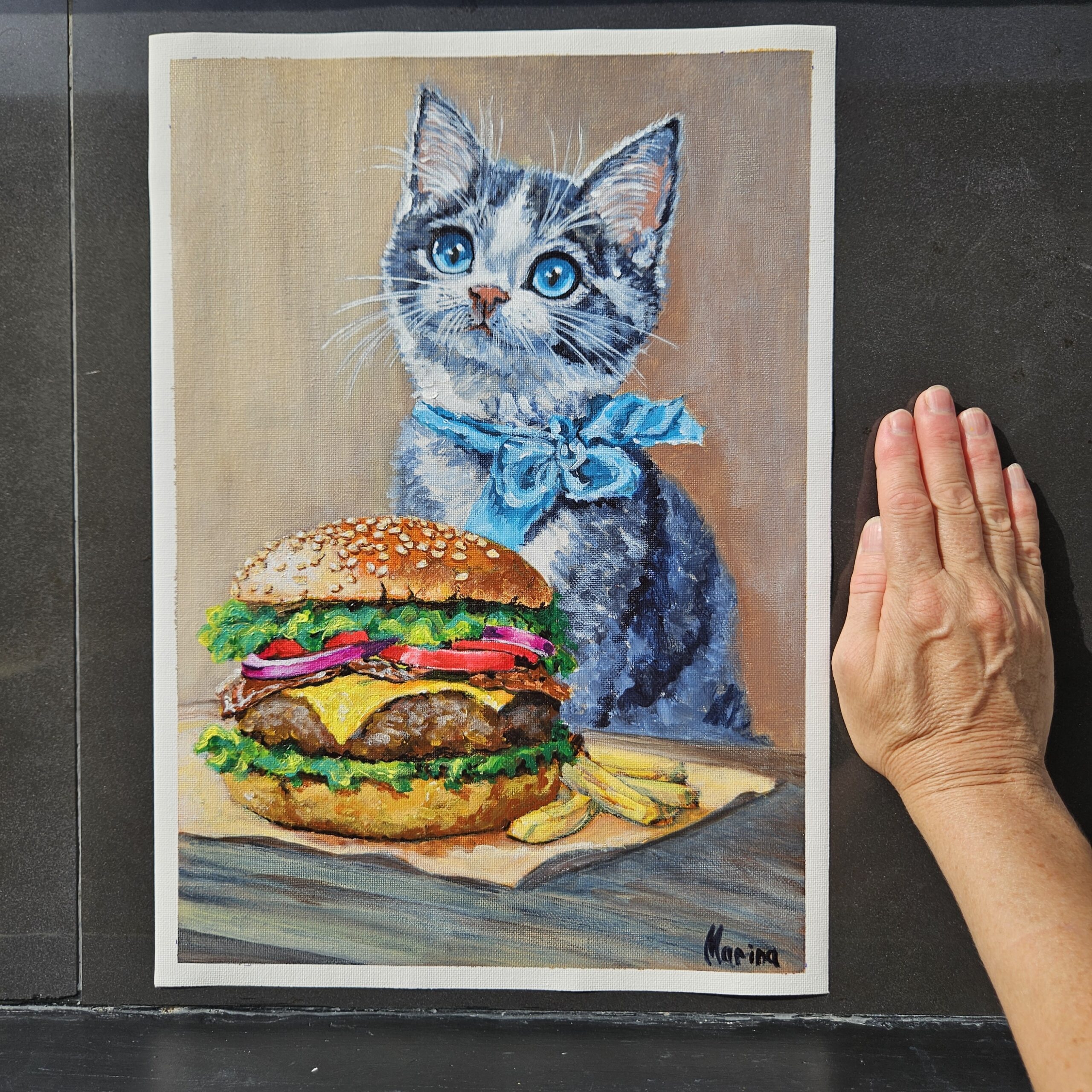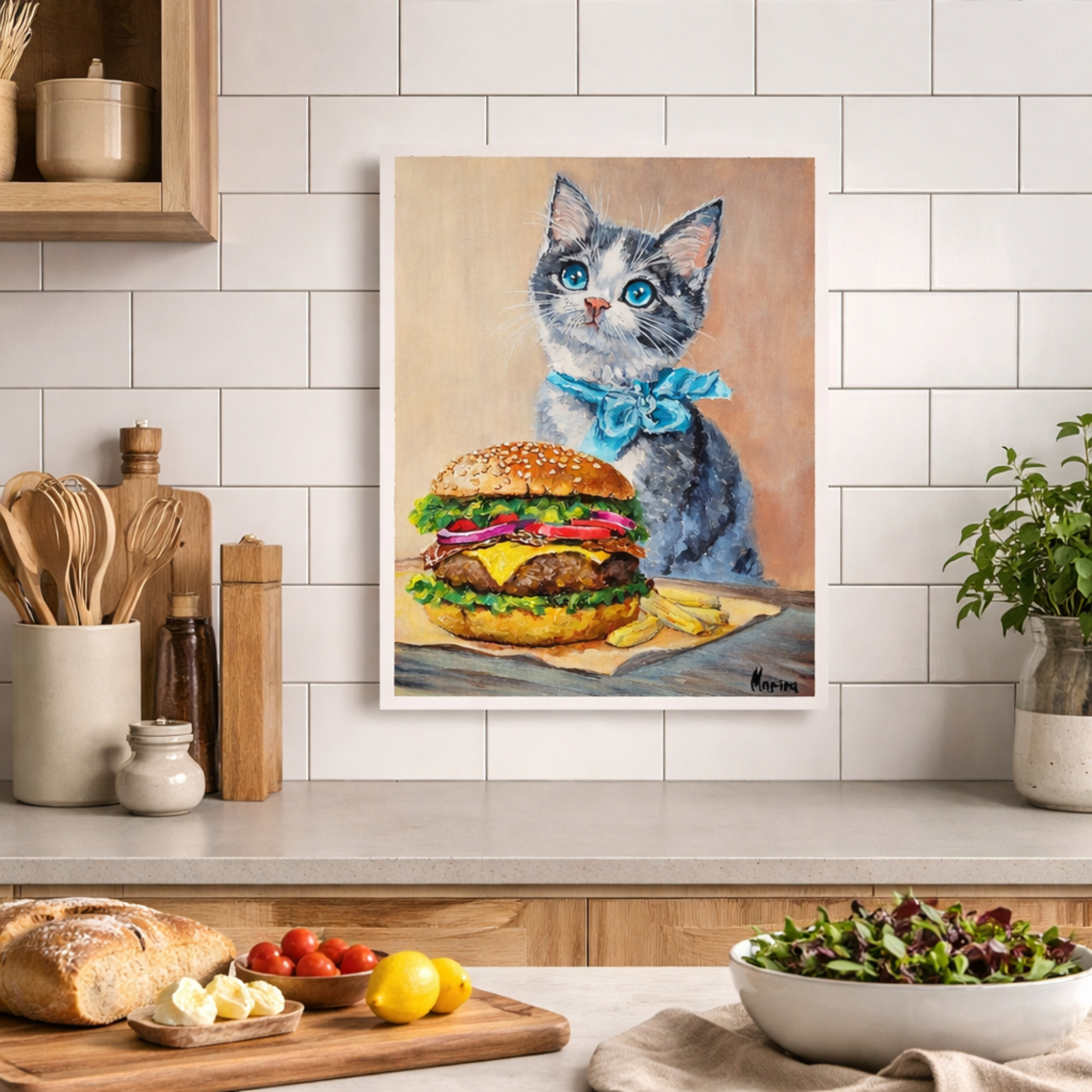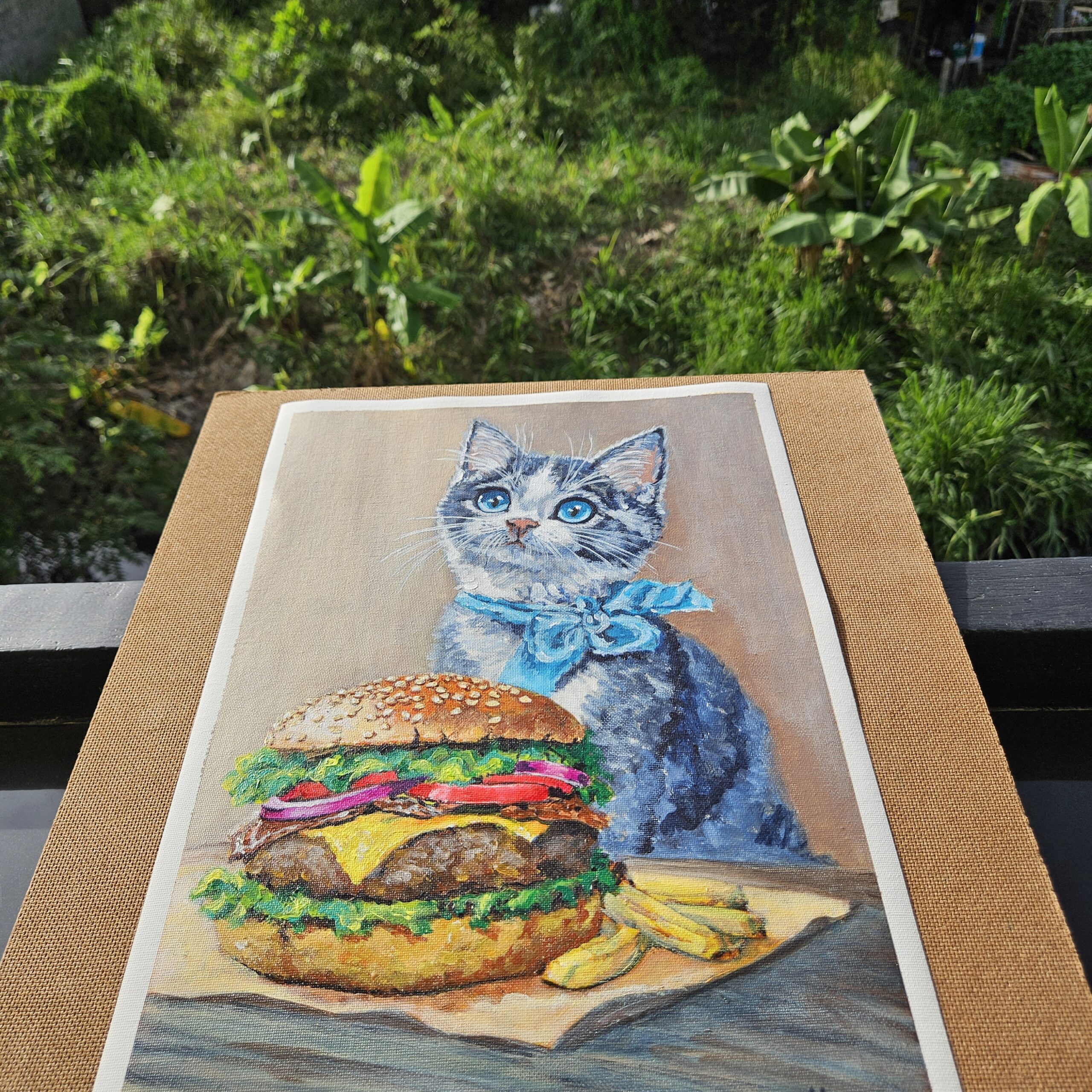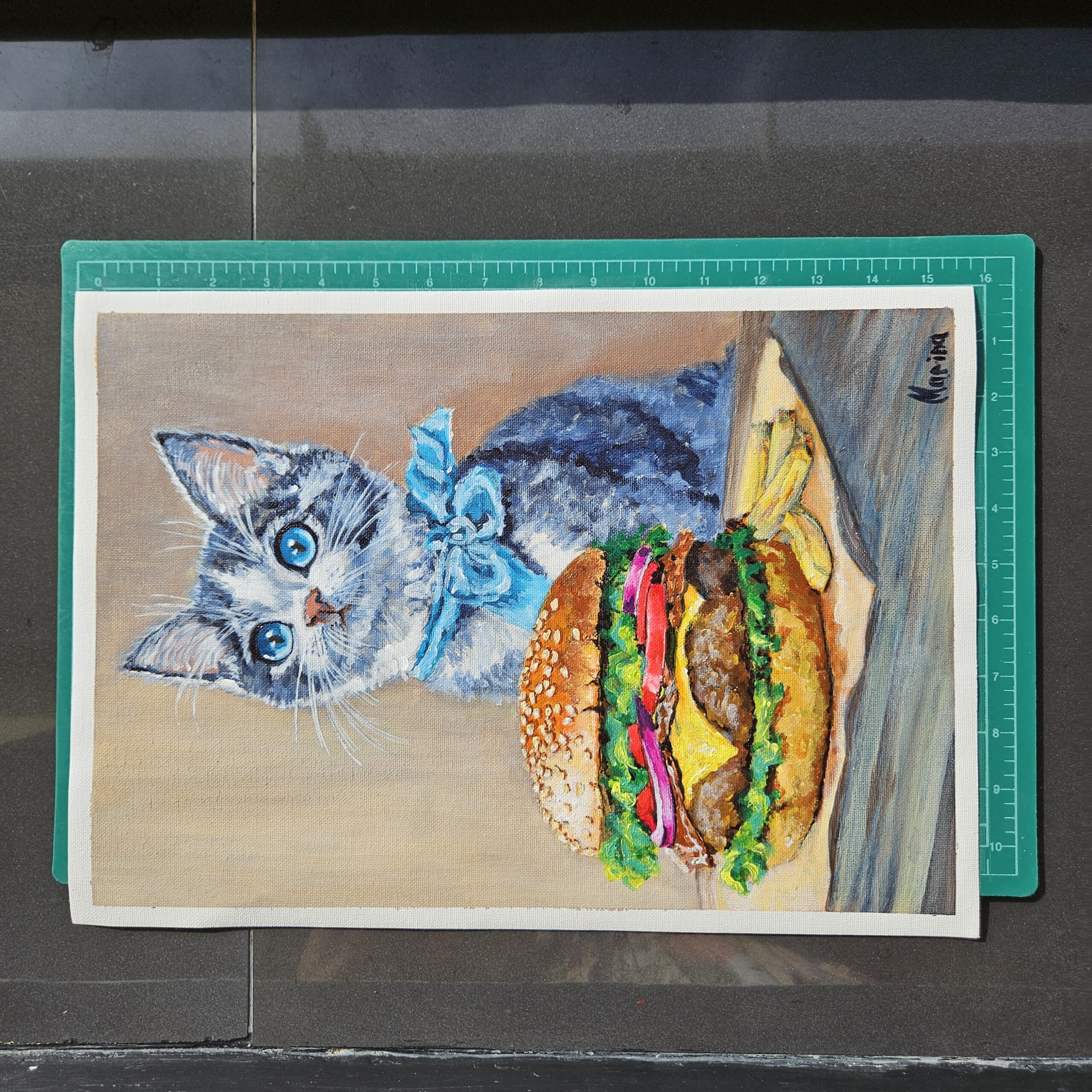 The kitten’s innocent gaze contrasts humorously with the richly colored burger placed in the foreground. While the artist herself does not eat burgers, she is fascinated by their visual abundance — golden browns, vibrant reds, fresh greens, and warm toasted textures. Within this original artwork, the burger becomes less a food object and more a painterly study in color harmony and visual rhythm.