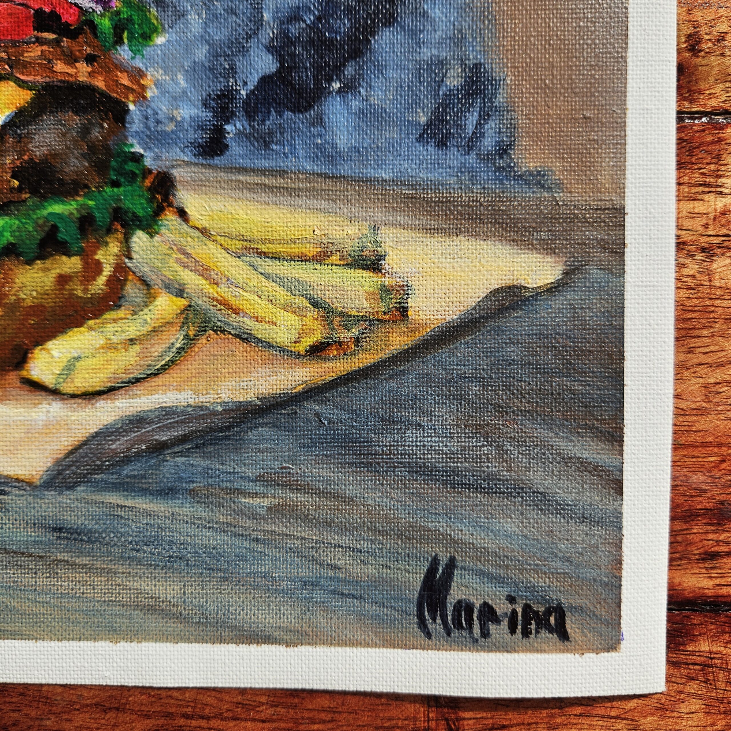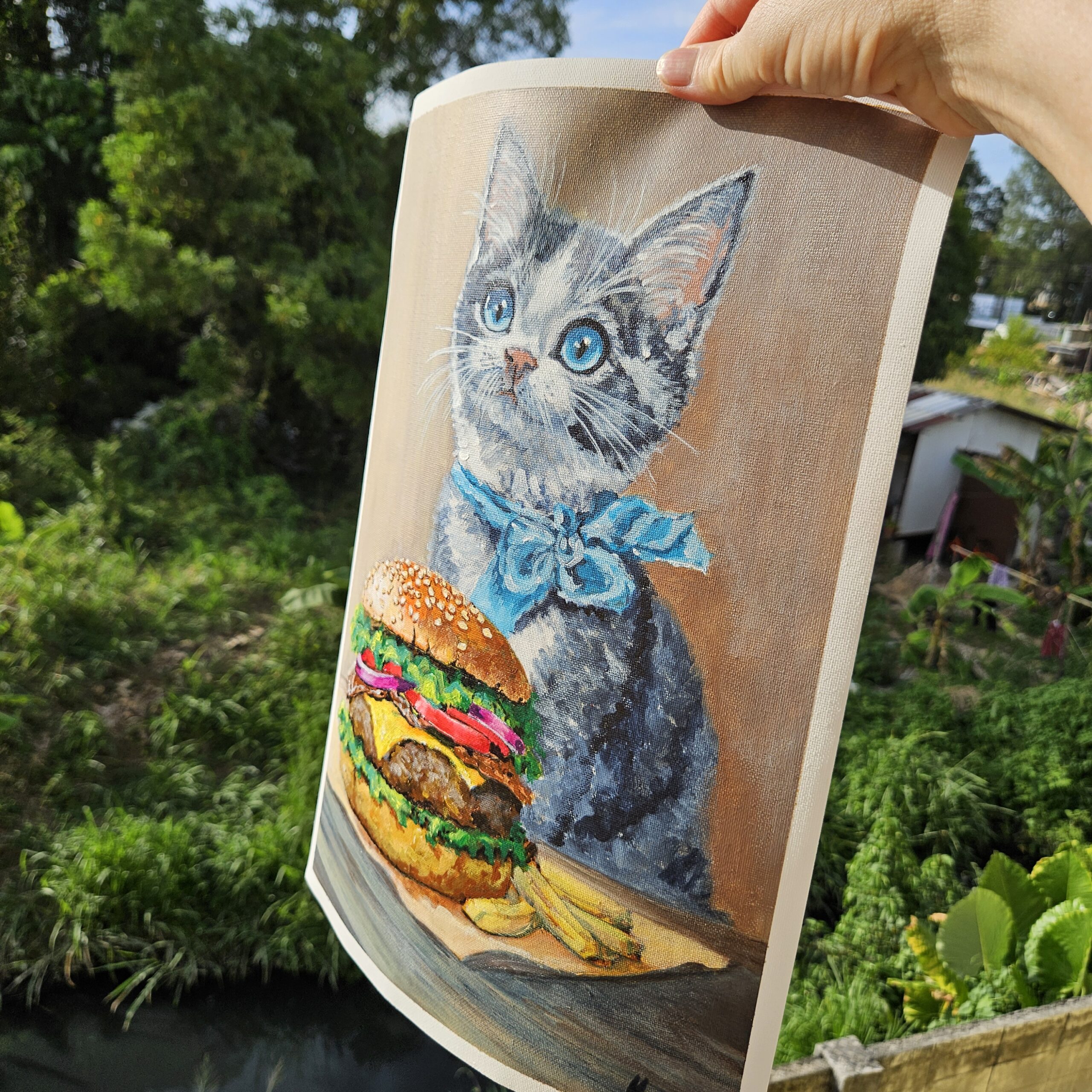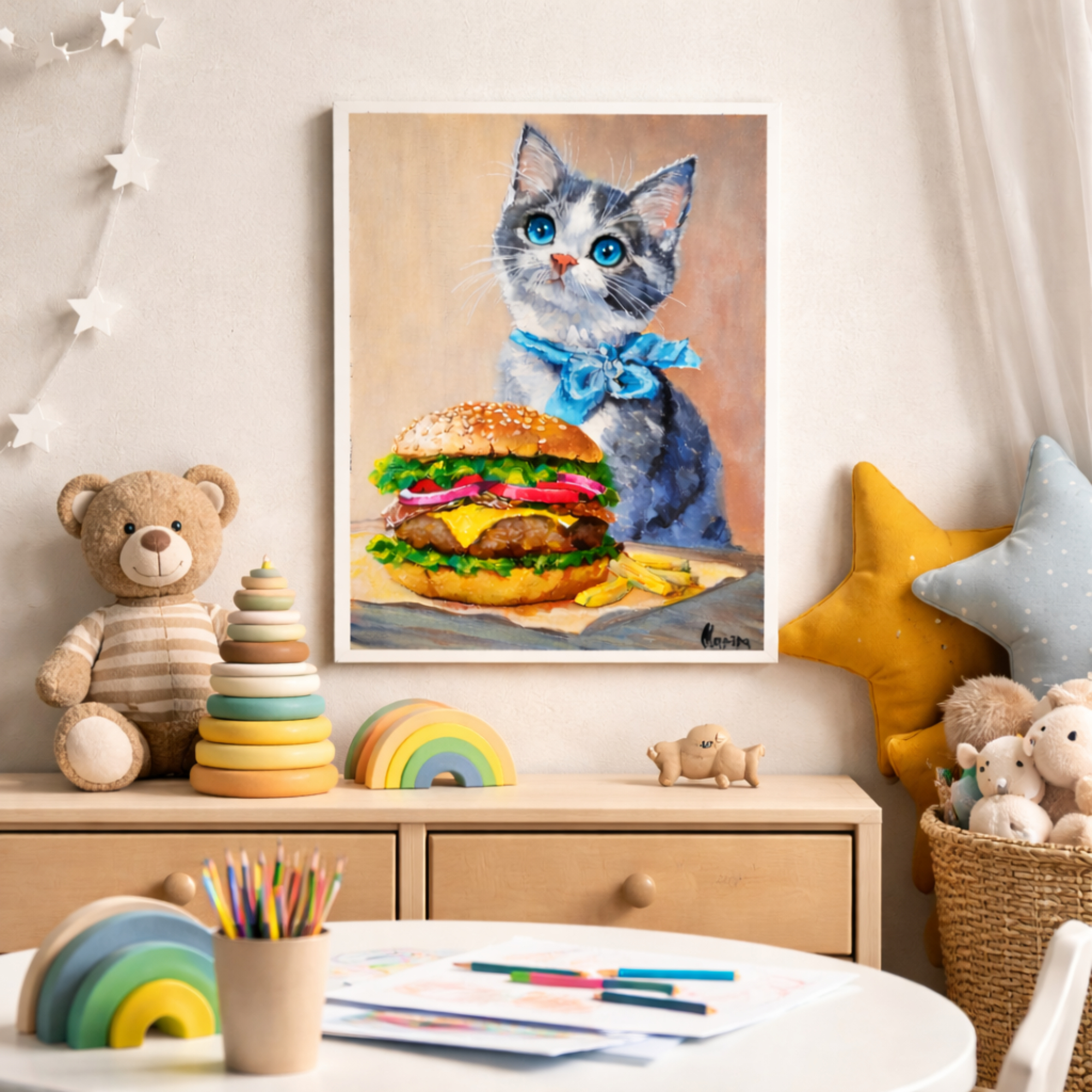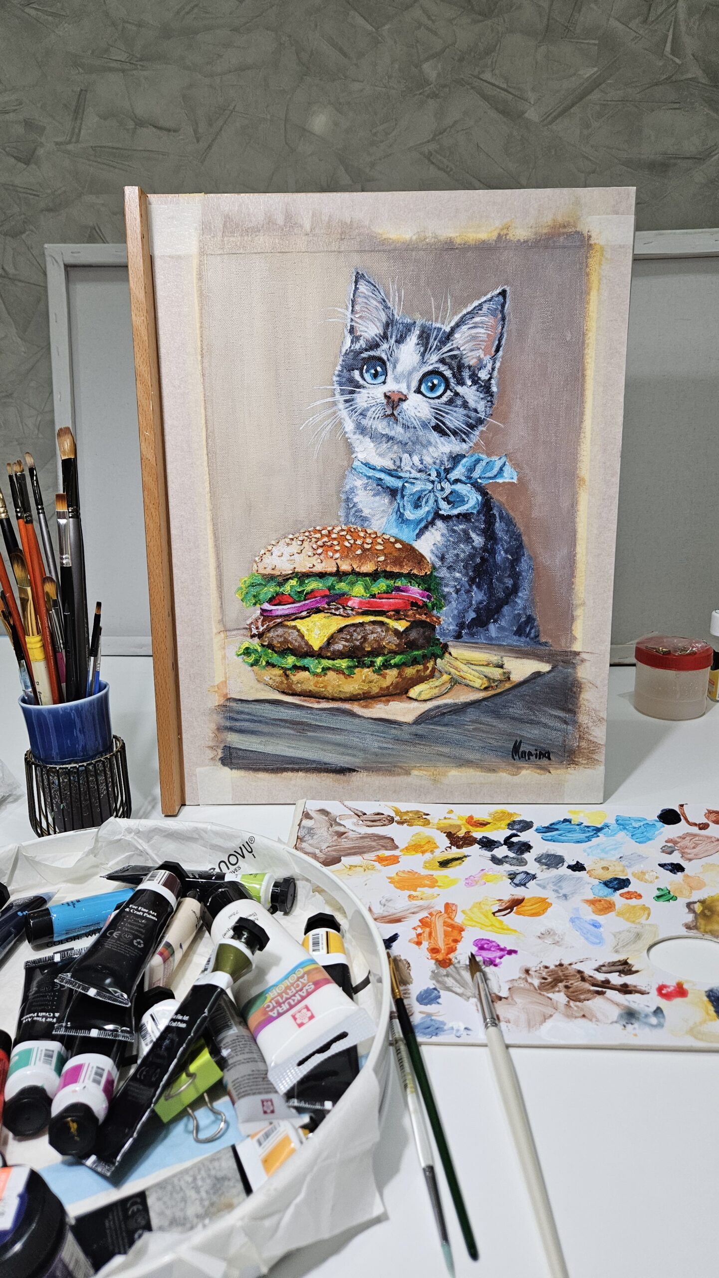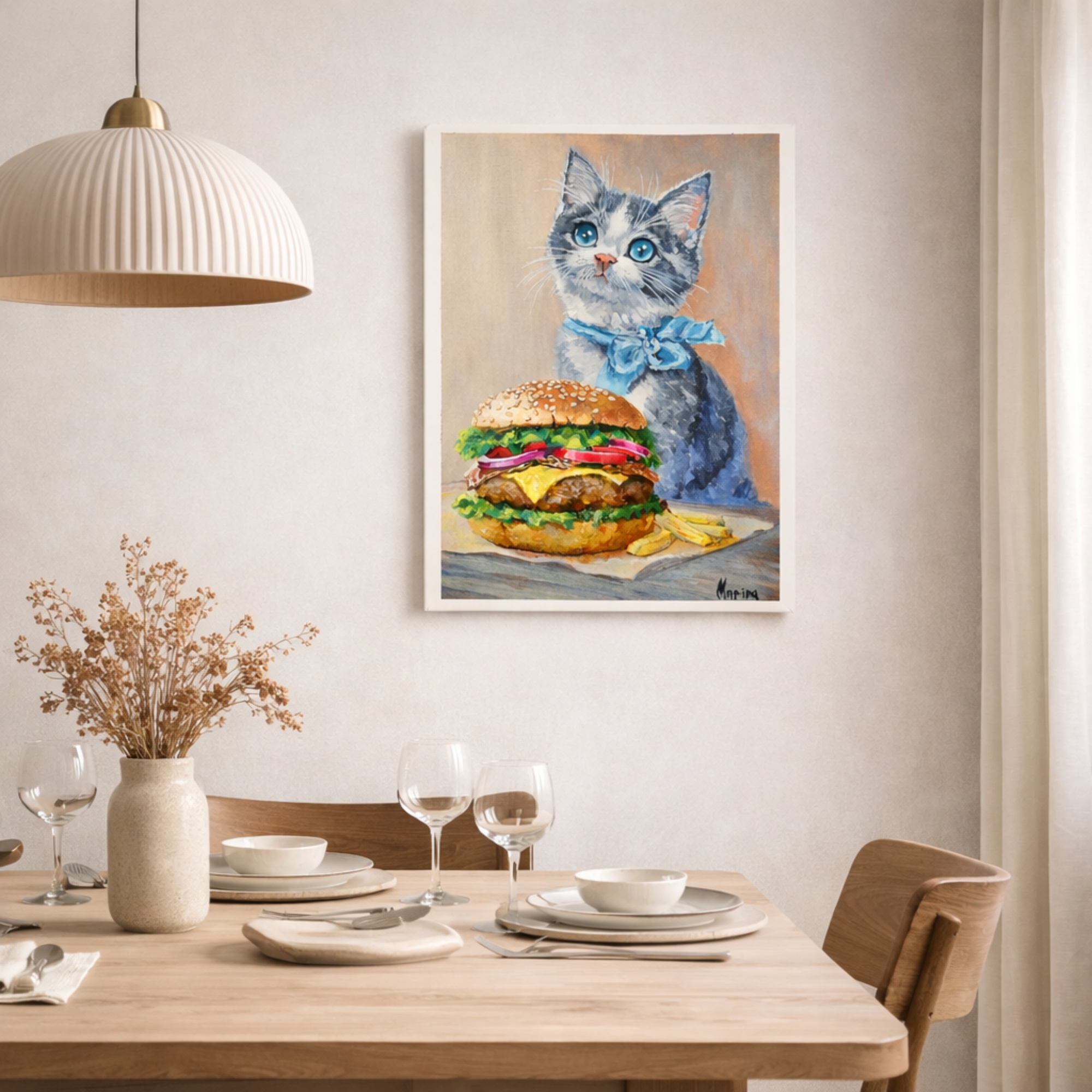The kitten’s innocent gaze contrasts humorously with the richly colored burger placed in the foreground. While the artist herself does not eat burgers, she is fascinated by their visual abundance — golden browns, vibrant reds, fresh greens, and warm toasted textures. Within this original artwork, the burger becomes less a food object and more a painterly study in color harmony and visual rhythm.