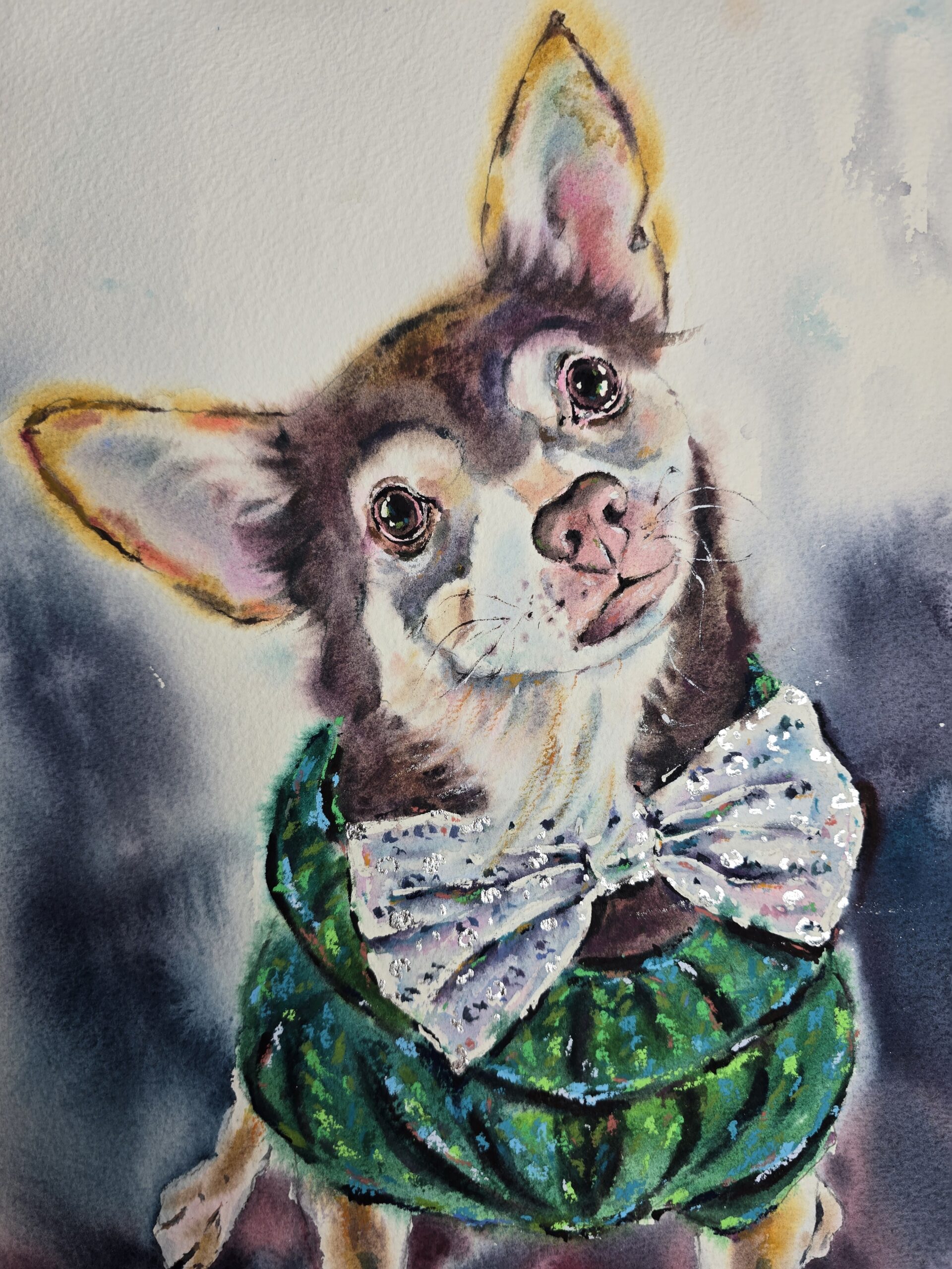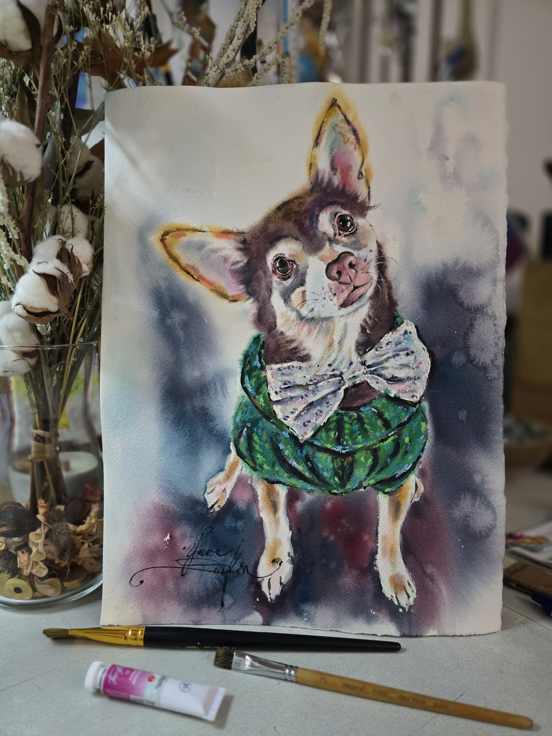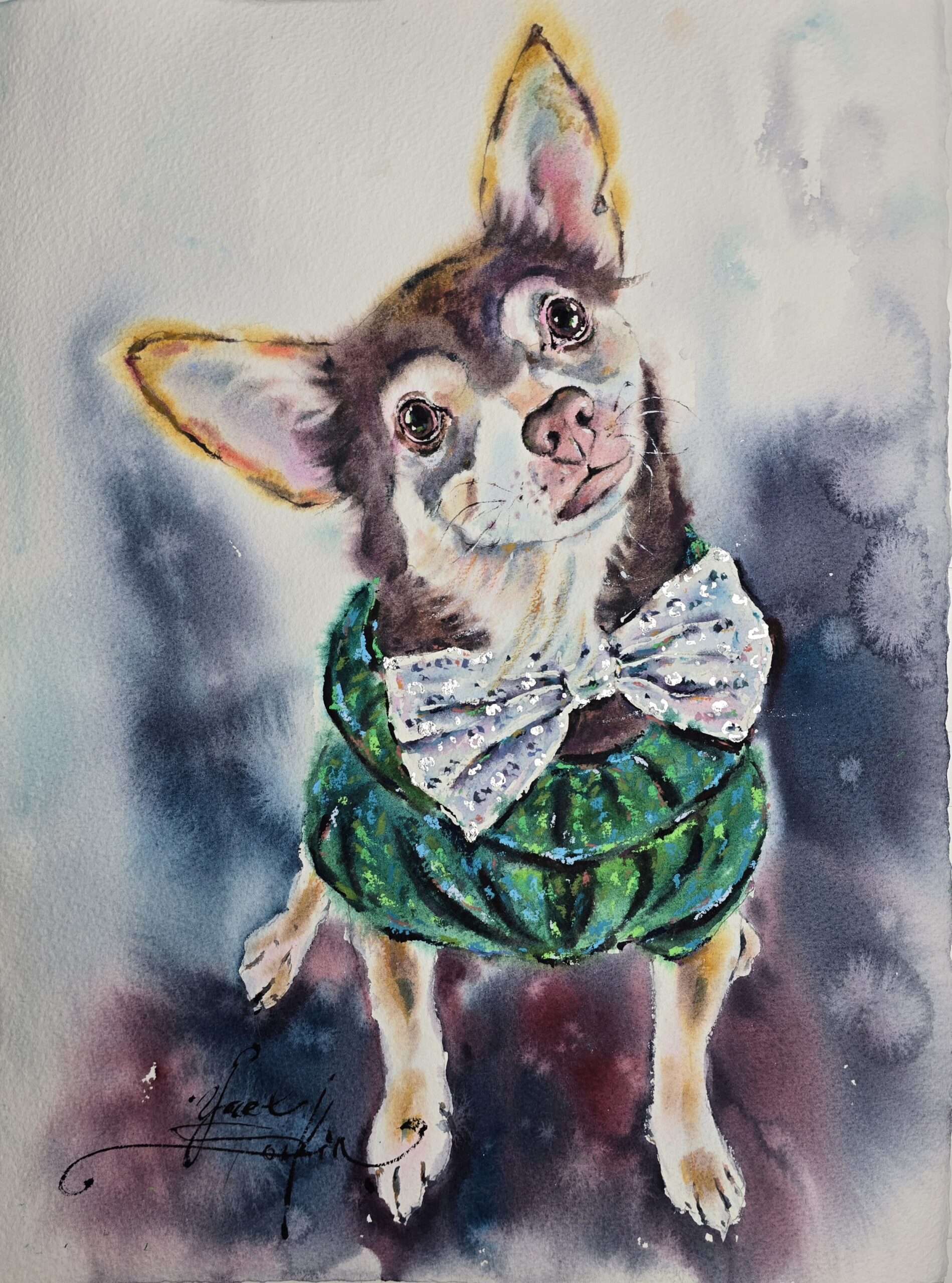 🎨This original Chihuahua dog portrait captures the playful and elegant charm of a small dog dressed in a green outfit with a sparkling bow. Painted with professional watercolors, the artwork highlights the expressive eyes and lively personality of this adorable companion.
