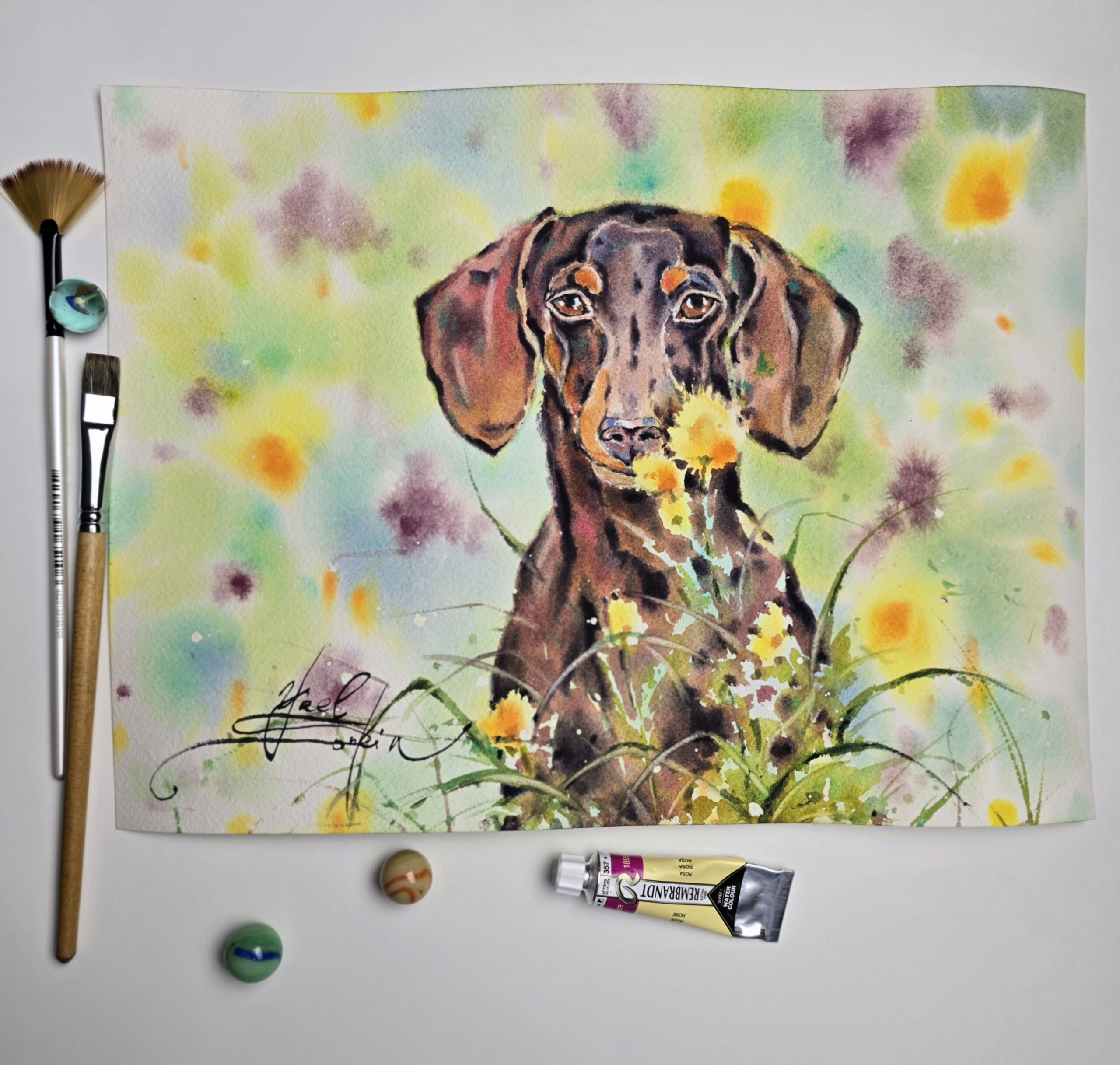 🎨This original watercolor painting features a sweet dachshund surrounded by colorful flowers, painted with soft washes and vibrant tones.