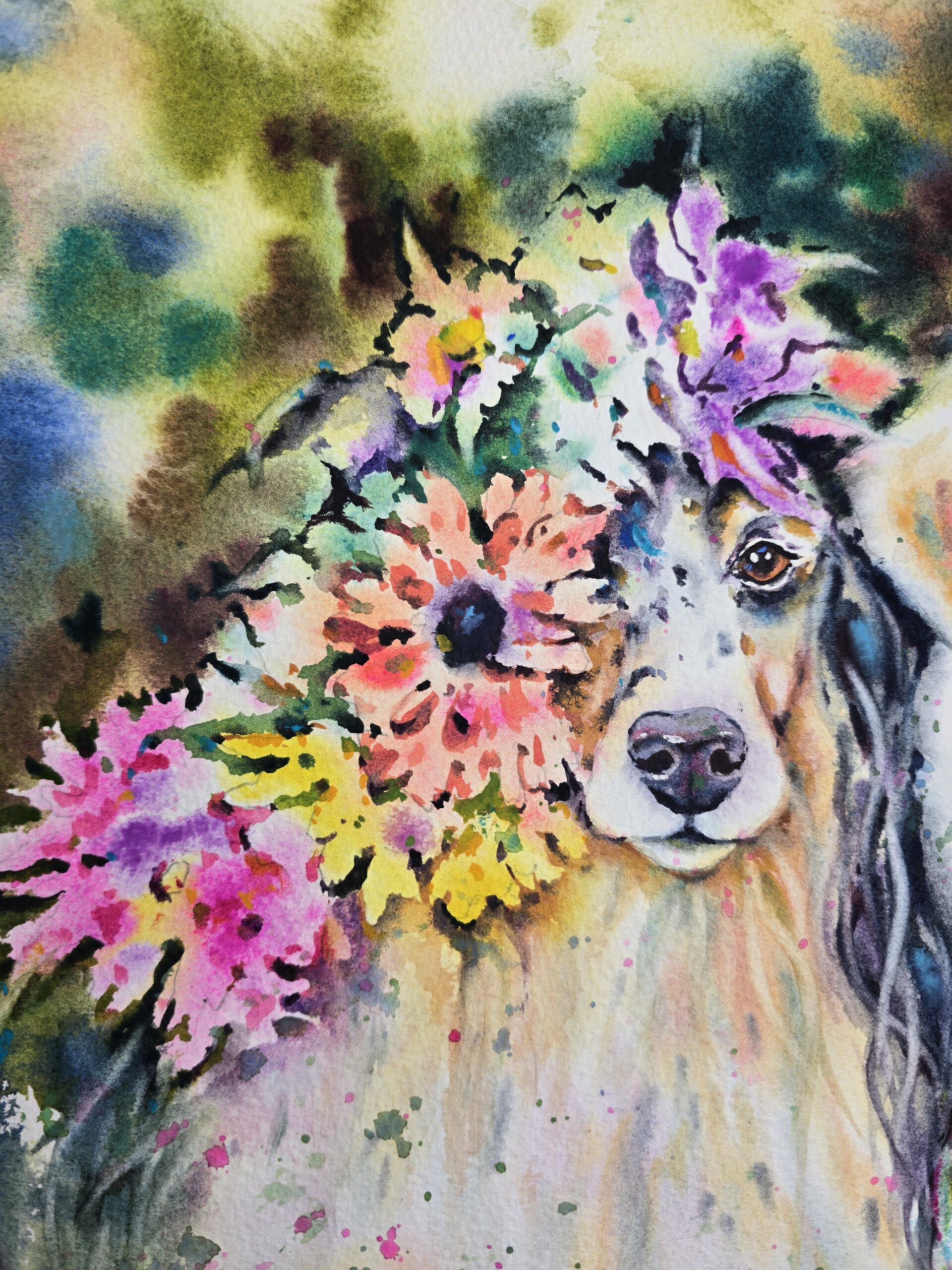 Dogs & Flowers – Original Watercolor Painting