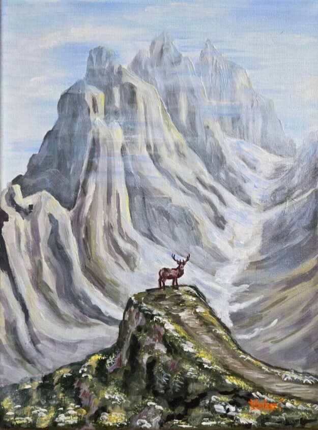 In the very center of the painting is a proud deer. He stands motionless, like a sculpture, against the backdrop of smoky mountains. His slender body is tense, his ears are alert, and his luxurious branched antlers seem to emphasize his strength and nobility. The deer’s gaze is directed forward – into the distance, beyond the canvas, as if he is listening to something invisible, knowing more than the viewer.