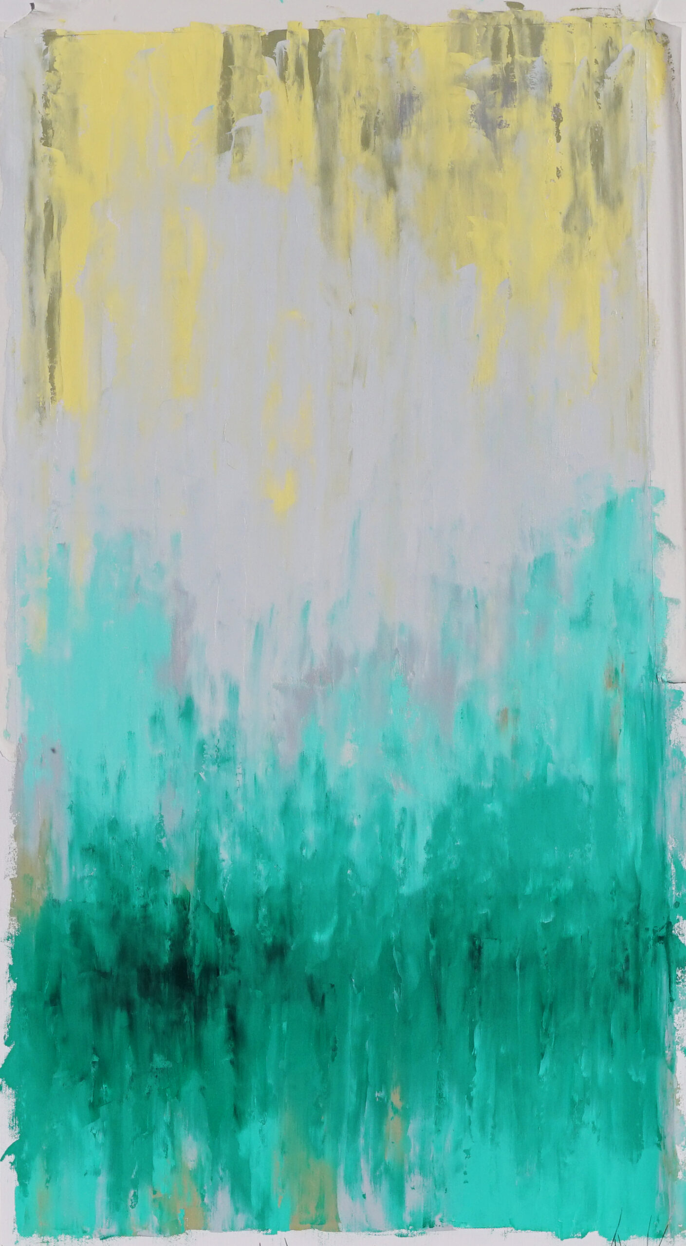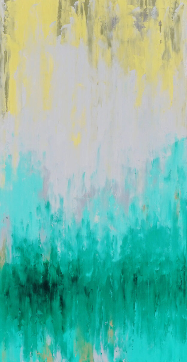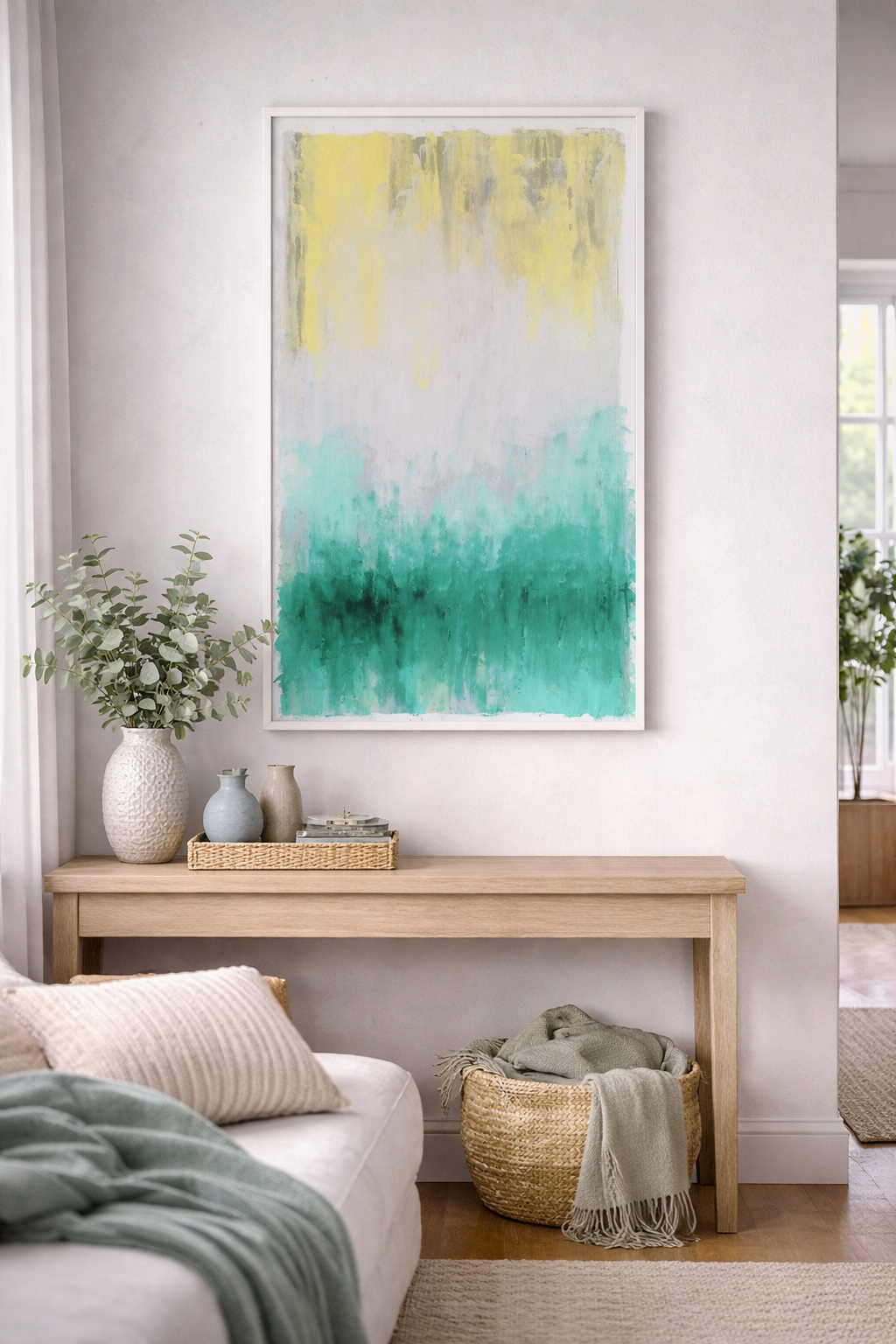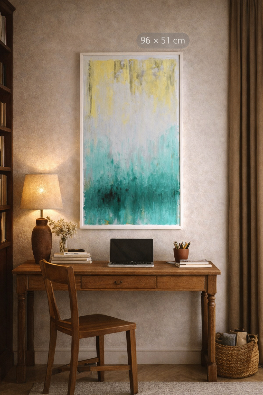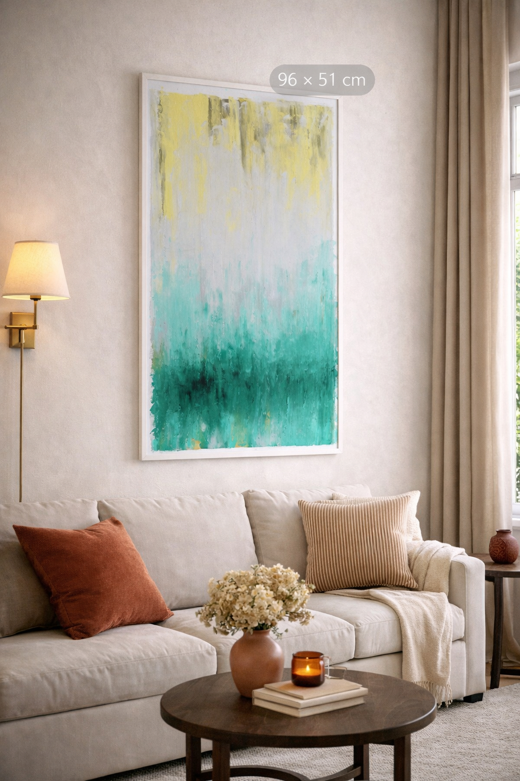 This atmospheric original oil painting on canvas explores the expressive language of contemporary abstraction. The composition blends luminous yellow tones with deep emerald and turquoise greens, creating a layered visual field that evokes a horizon of light dissolving into color and movement. The vertical flow of pigment and soft transitions between shades give the artwork a sense of natural rhythm and emotional depth.