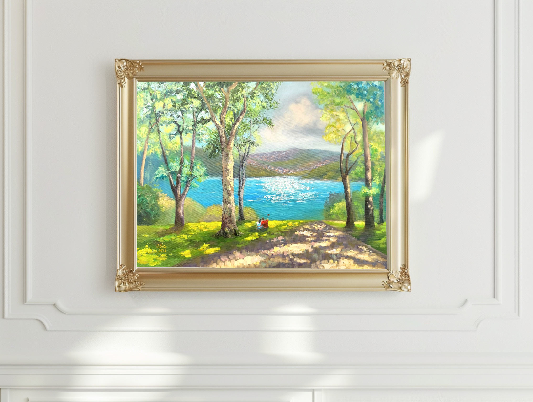 This painting was inspired by the natural beauty of Istanbul, particularly the majestic plane trees found in Emirgan Park. These ancient trees can live for thousands of years and are known for their distinctive khaki-and-white bark, which peels away in layers. Towering and lush, the plane tree provides cool, dense shade in the summer, sheltering colorful birds like green parrots whose song fills the park with a sense of peace and wonder. In the painting, a couple is captured taking a selfie in front of this beautiful tree — a quiet moment of joy in a garden that feels almost otherworldly.