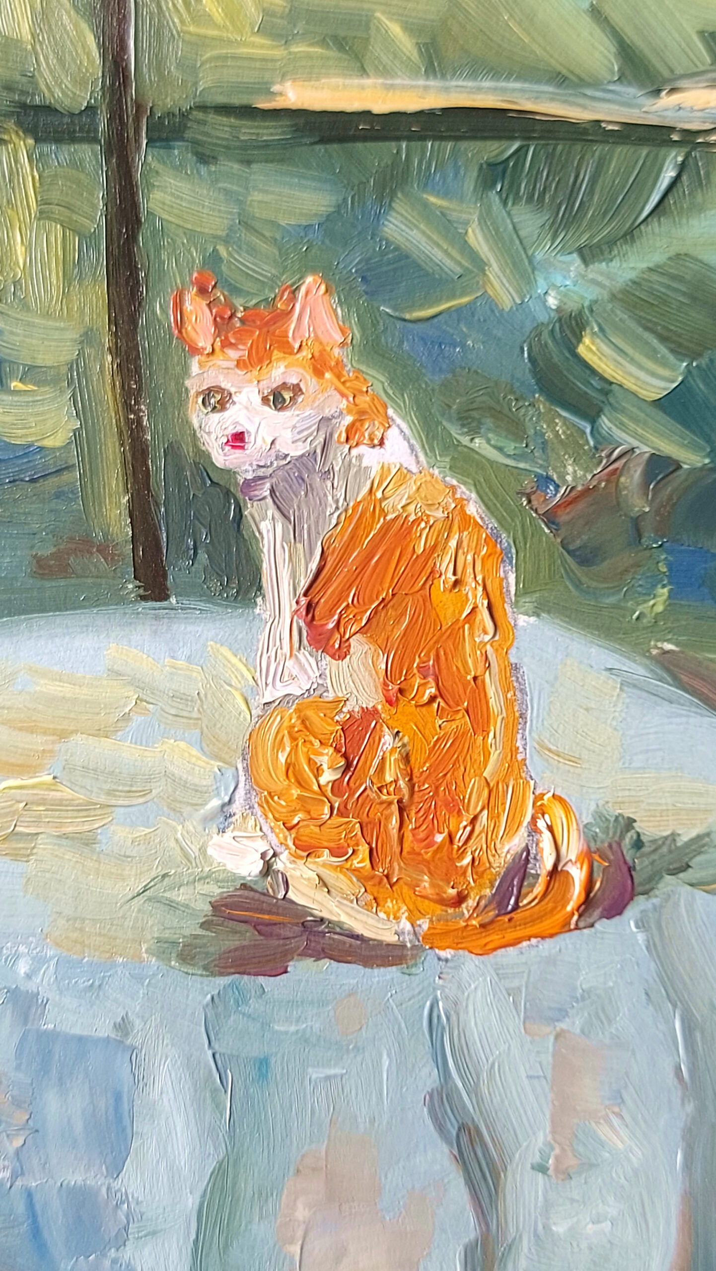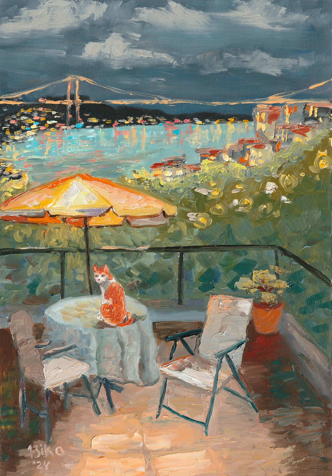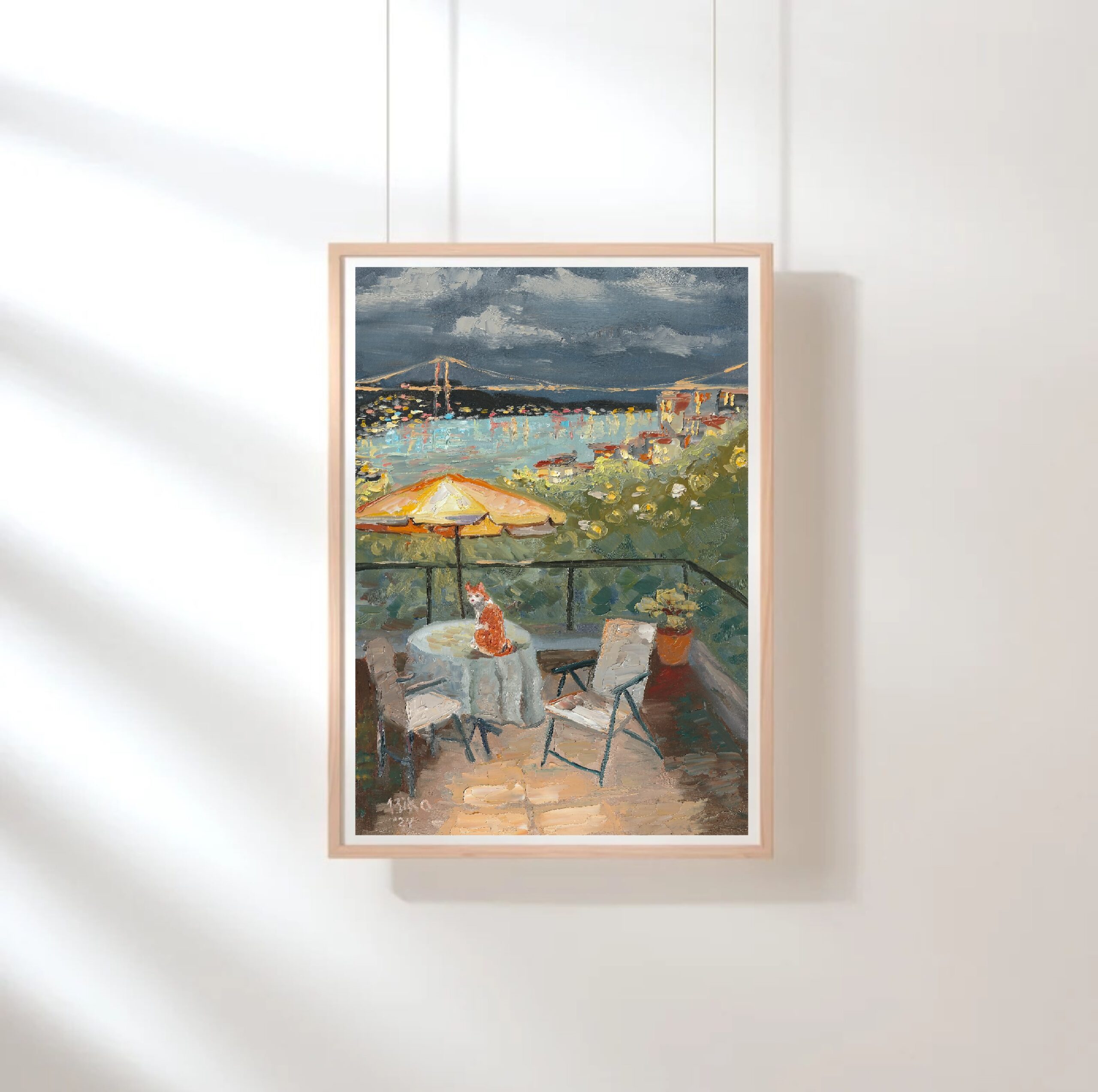 A quiet evening unfolds over Istanbul as warm city lights meet the deep blue of the Bosphorus. A solitary cat watches the scene, adding a poetic touch to this impressionistic oil painting. Rich textures and atmospheric color blend to capture the charm of the city at dusk. Painted on high-quality 290 gsm artist paper, this original artwork is signed by the artist on both sides and comes with a certificate of authenticity.