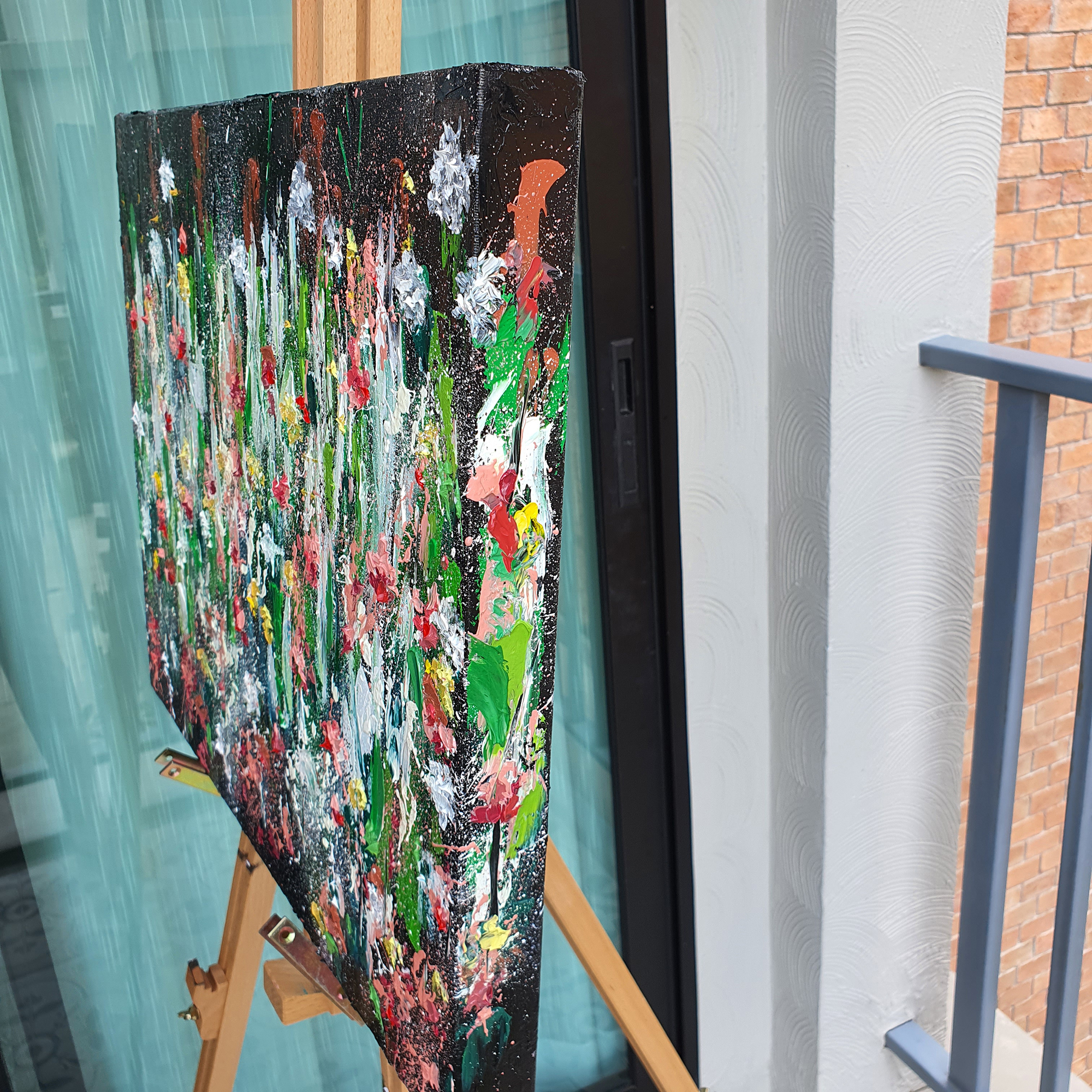 This abstract flower garden painting is an ideal choice for collectors seeking original art, impasto oil paintings, and statement wall art with strong texture and expressive color.