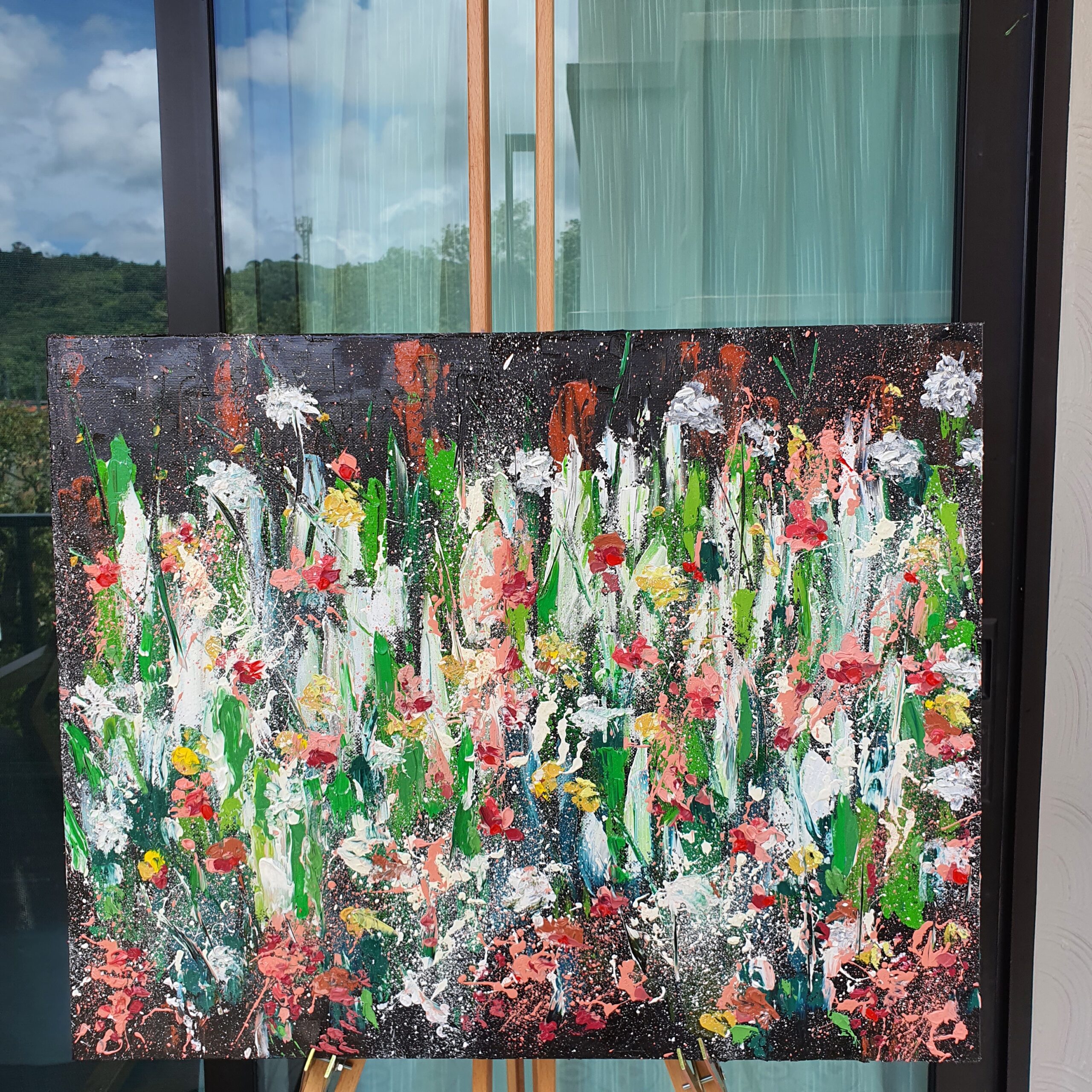 The composition evokes the feeling of walking through a dense, lively garden at the height of its bloom—where flowers, stems, and light dissolve into one another. Thick applications of oil paint form sculptural textures on the canvas surface, giving the piece a tactile, almost three-dimensional quality. This impasto floral painting emphasizes spontaneity and emotion, aligning with contemporary abstract art and modern expressionist approaches.