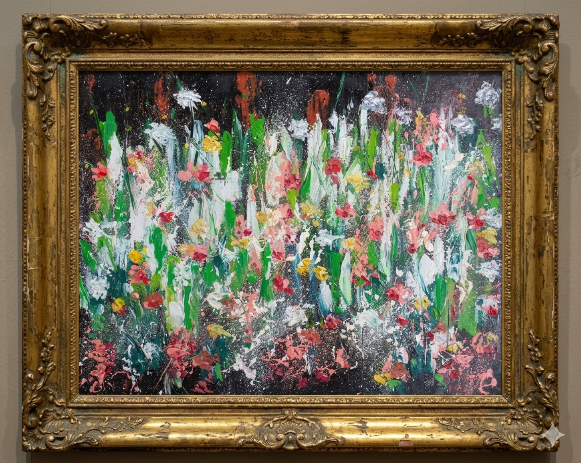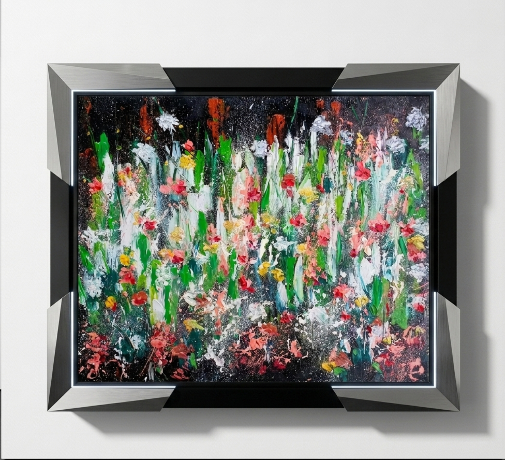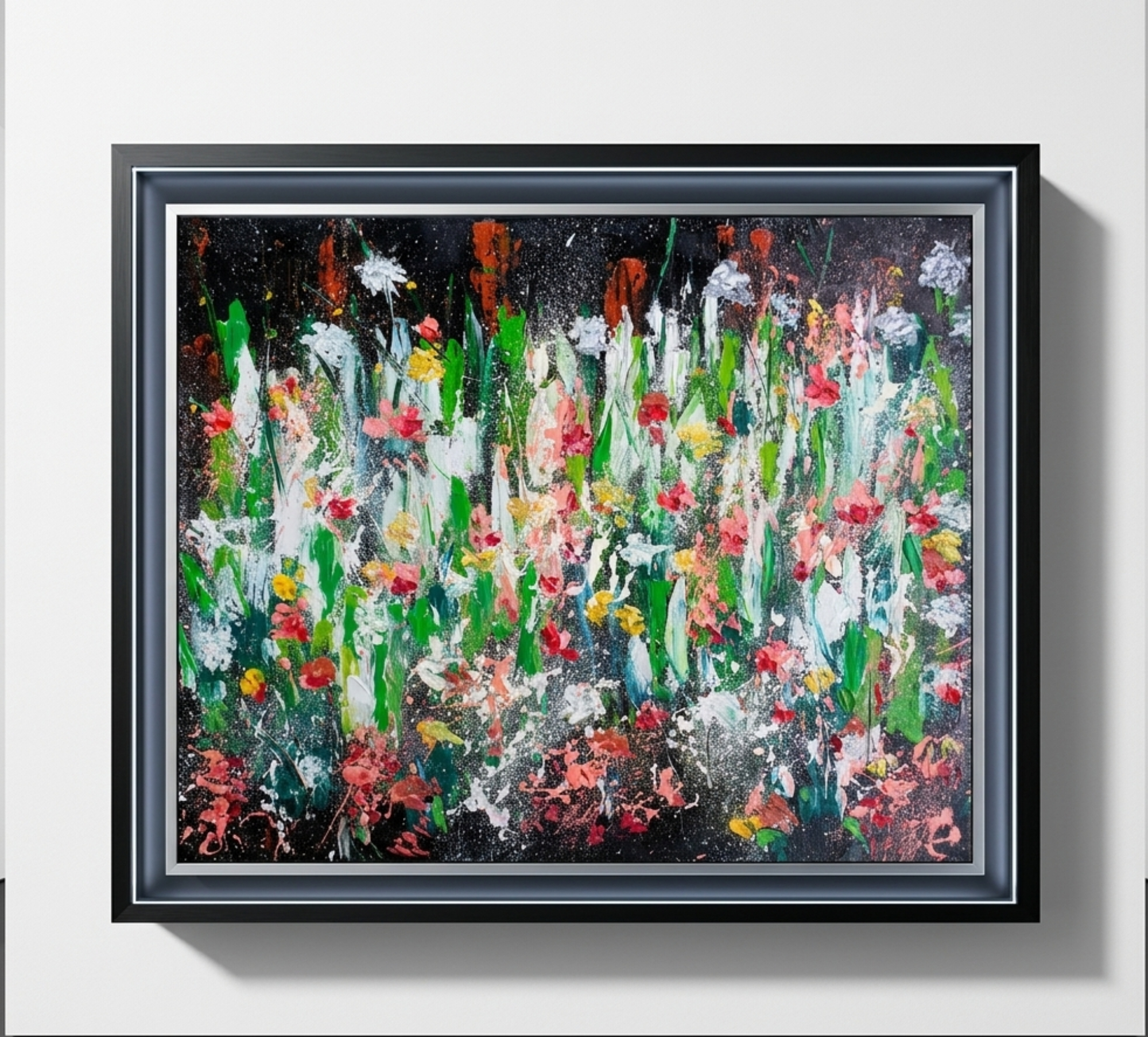 This original abstract floral painting captures the energy and richness of a blooming garden through a bold impasto technique and expressive brushwork. Rather than depicting a literal landscape, the artwork translates the essence of a flower garden into dynamic layers of color, texture, and movement. Vibrant greens, soft pinks, warm reds, and touches of white emerge from a deep, contrasting background, creating a sense of depth and atmospheric complexity.