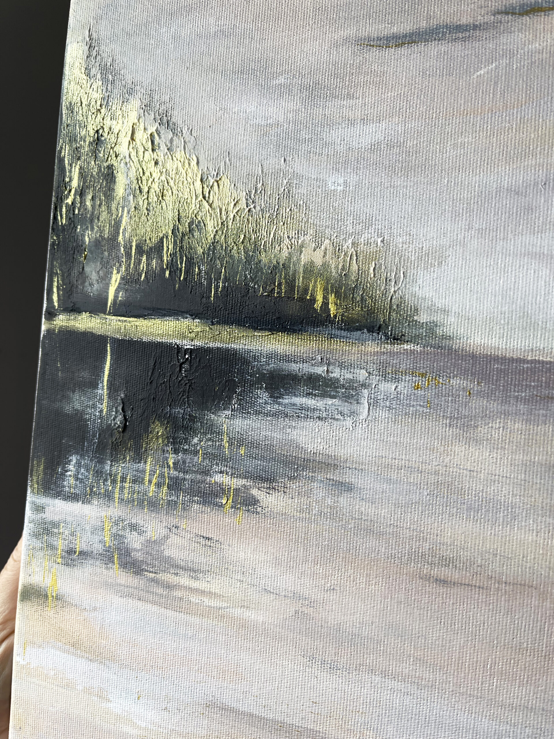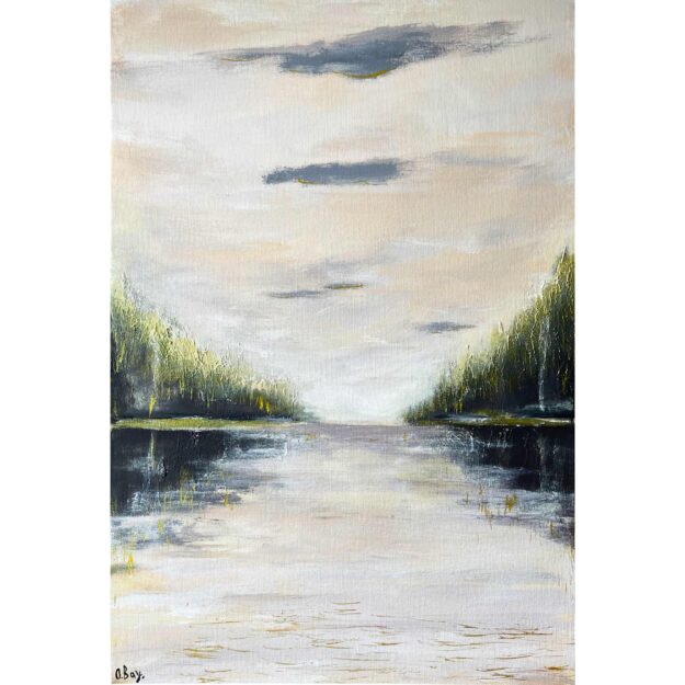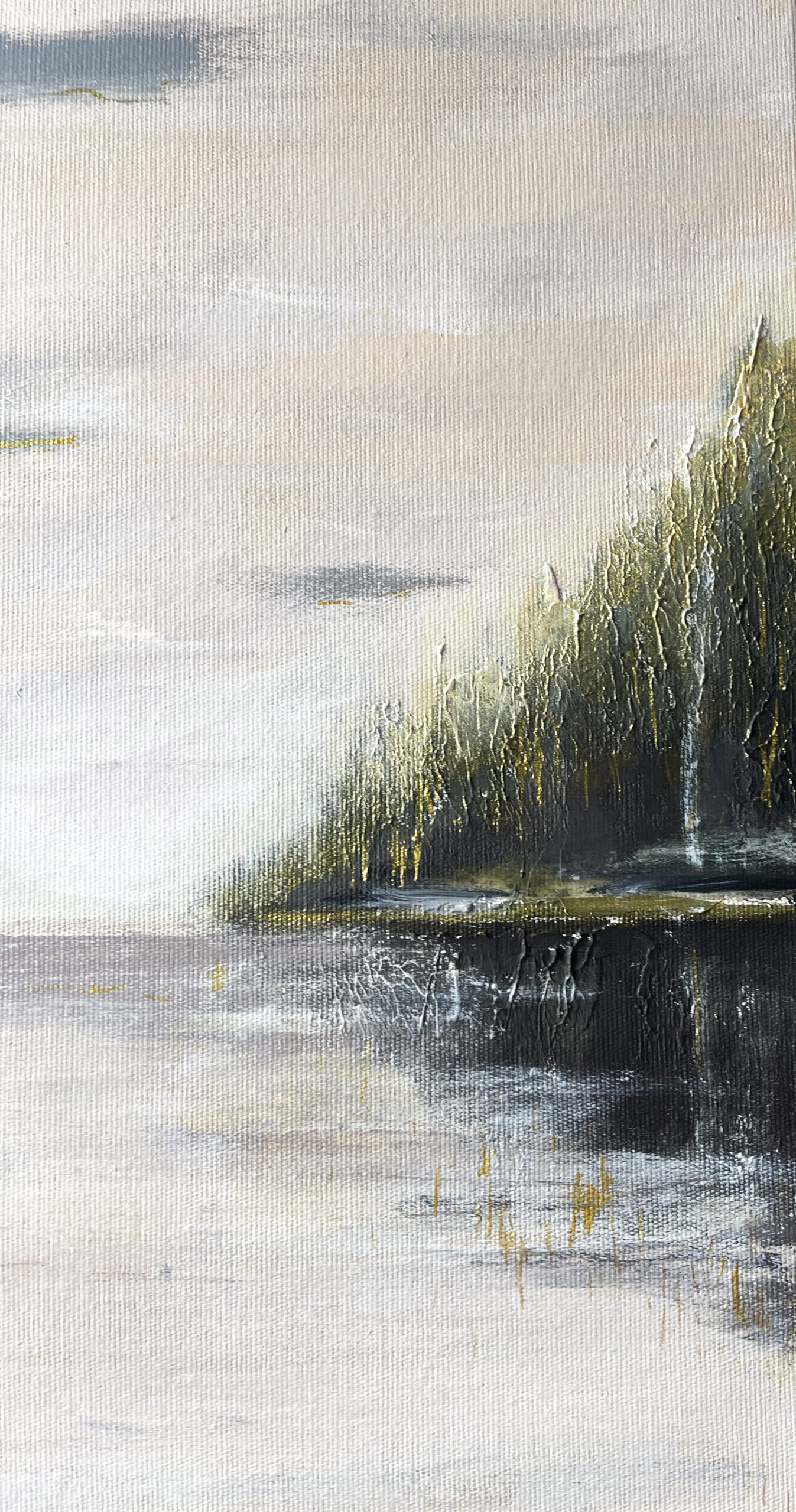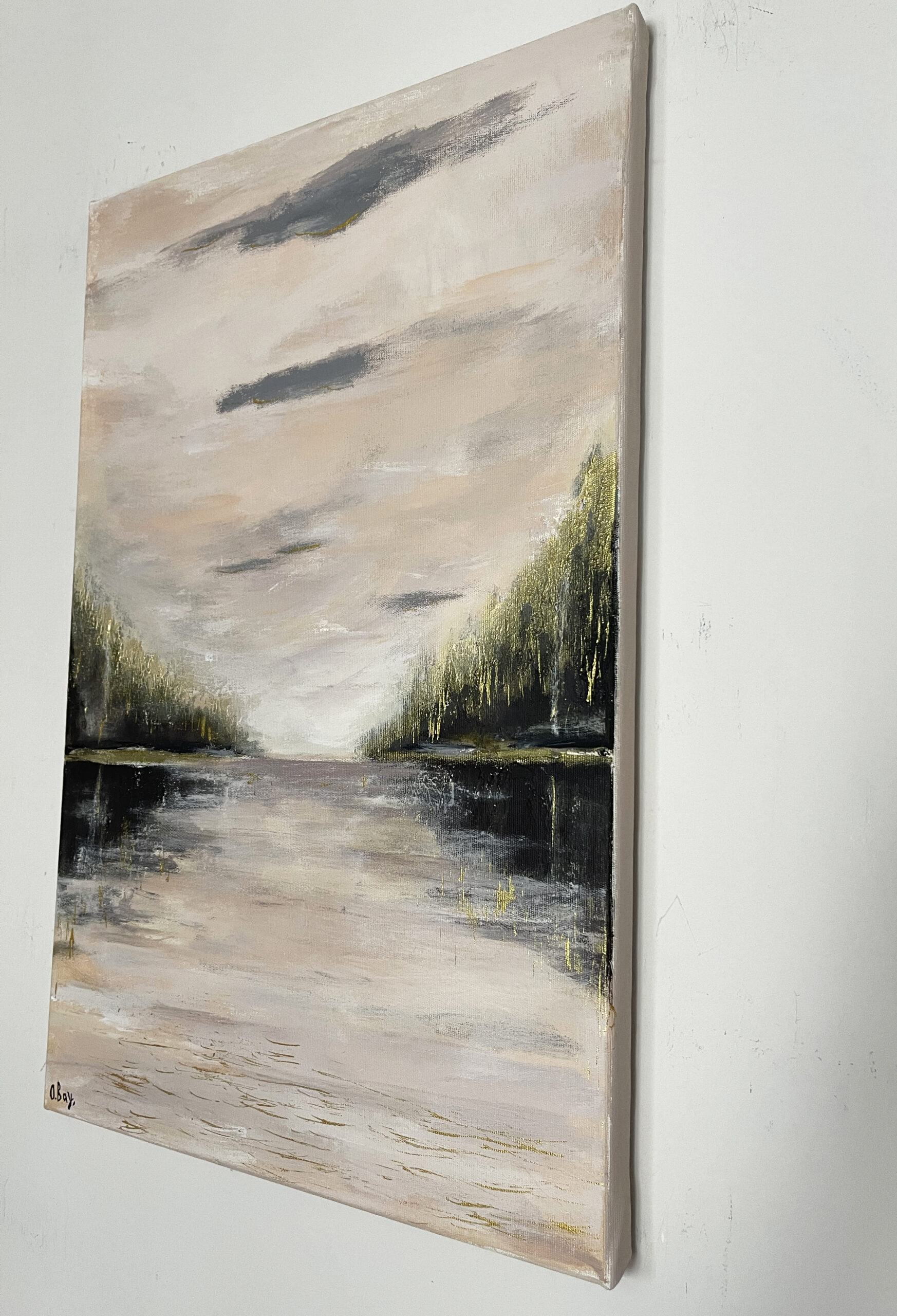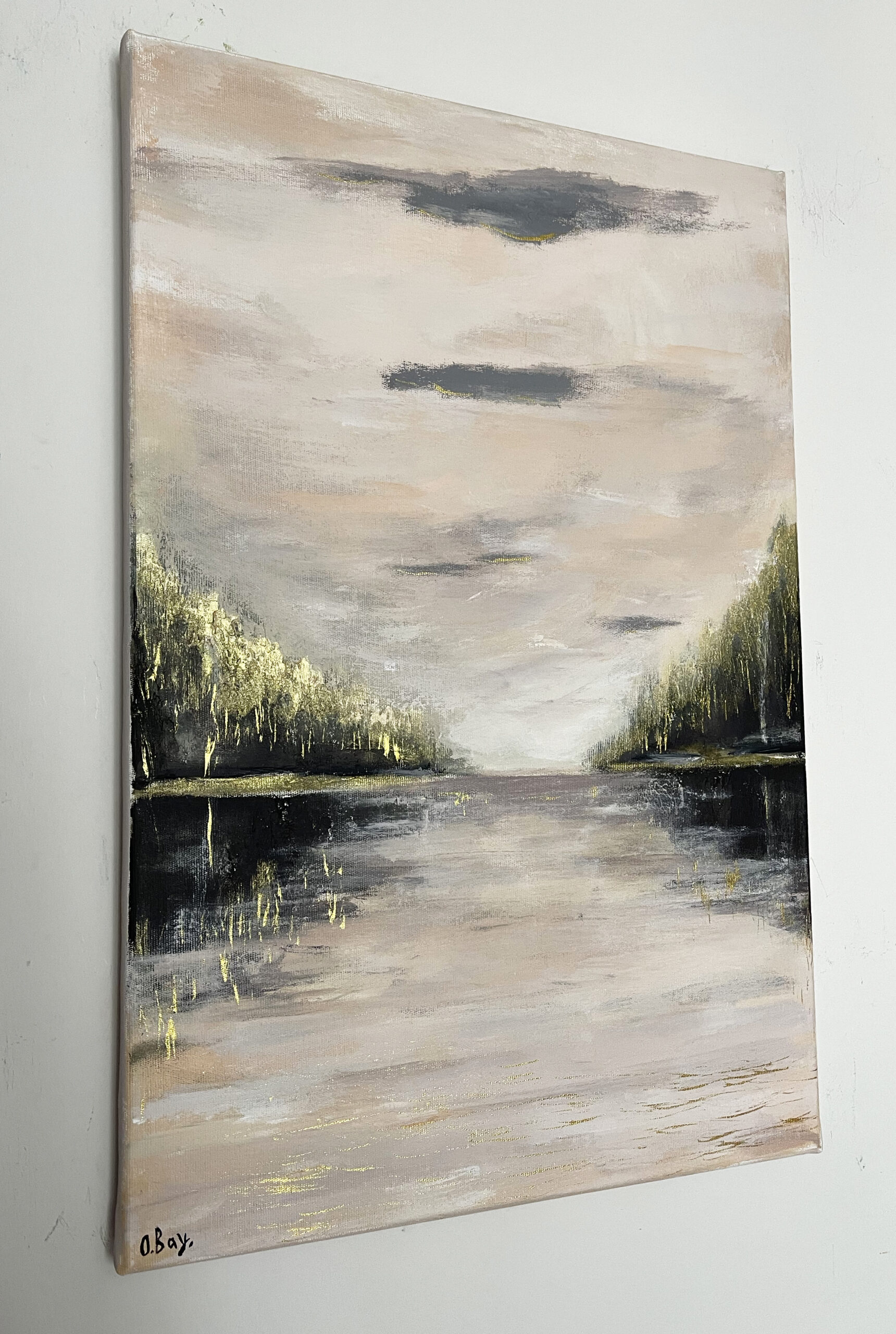 This modern acrylic painting depicts a mirror-like lake at dusk, framed by trees dissolving into soft light. Muted beige-grey, olive, and graphite tones create a work of calm art with a serene mirrored reflection. As contemporary art, it captures silence and the gentle whisper of nature deeply peaceful and meditative.