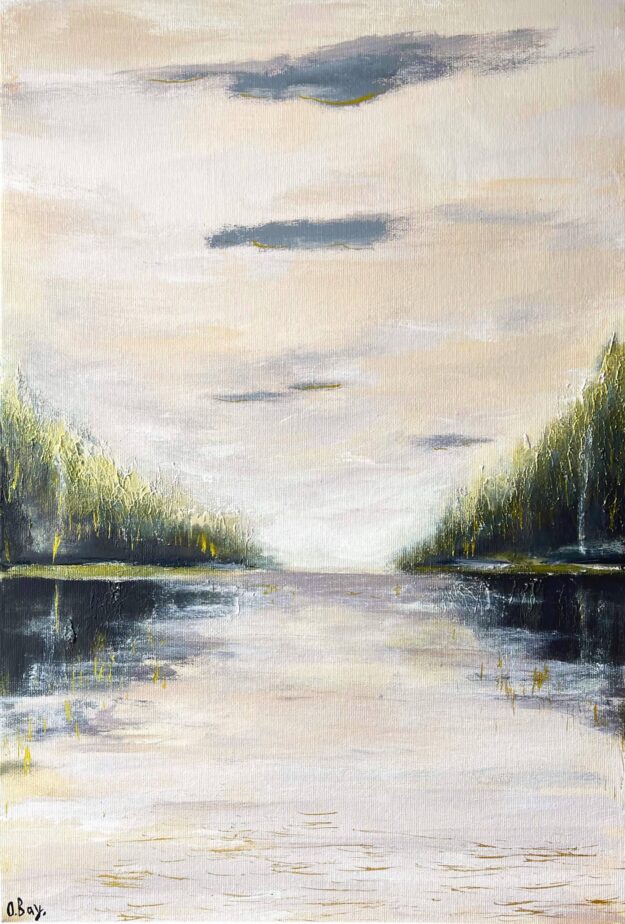 Forest Landscape Golden Sunset is an original, one-of-a-kind acrylic painting on canvas, signed on the front and back sides. The artwork captures a mirror-like lake at dusk, framed by trees dissolving into soft light. Muted beige-grey, olive, and graphite tones create a work of calm art with a serene mirrored reflection. This painting conveys a state of gratitude to yourself.
