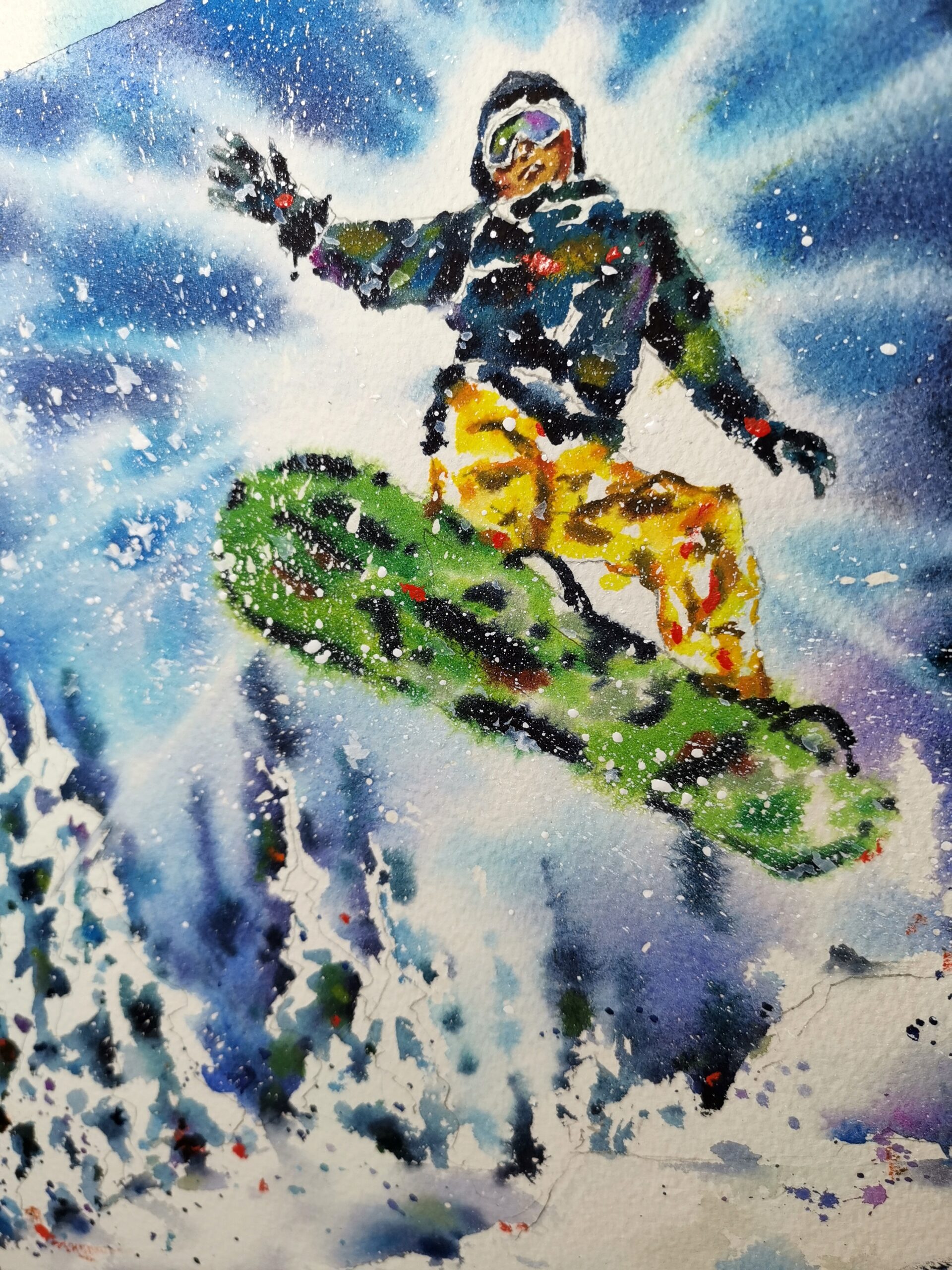 🎨Bring the energy and excitement of winter sports into your home with this original watercolor snowboard painting. Titled “Freedom in the Snow”, this dynamic artwork captures a snowboarder soaring high above snowy mountains, surrounded by sparkling snow and vibrant colors.