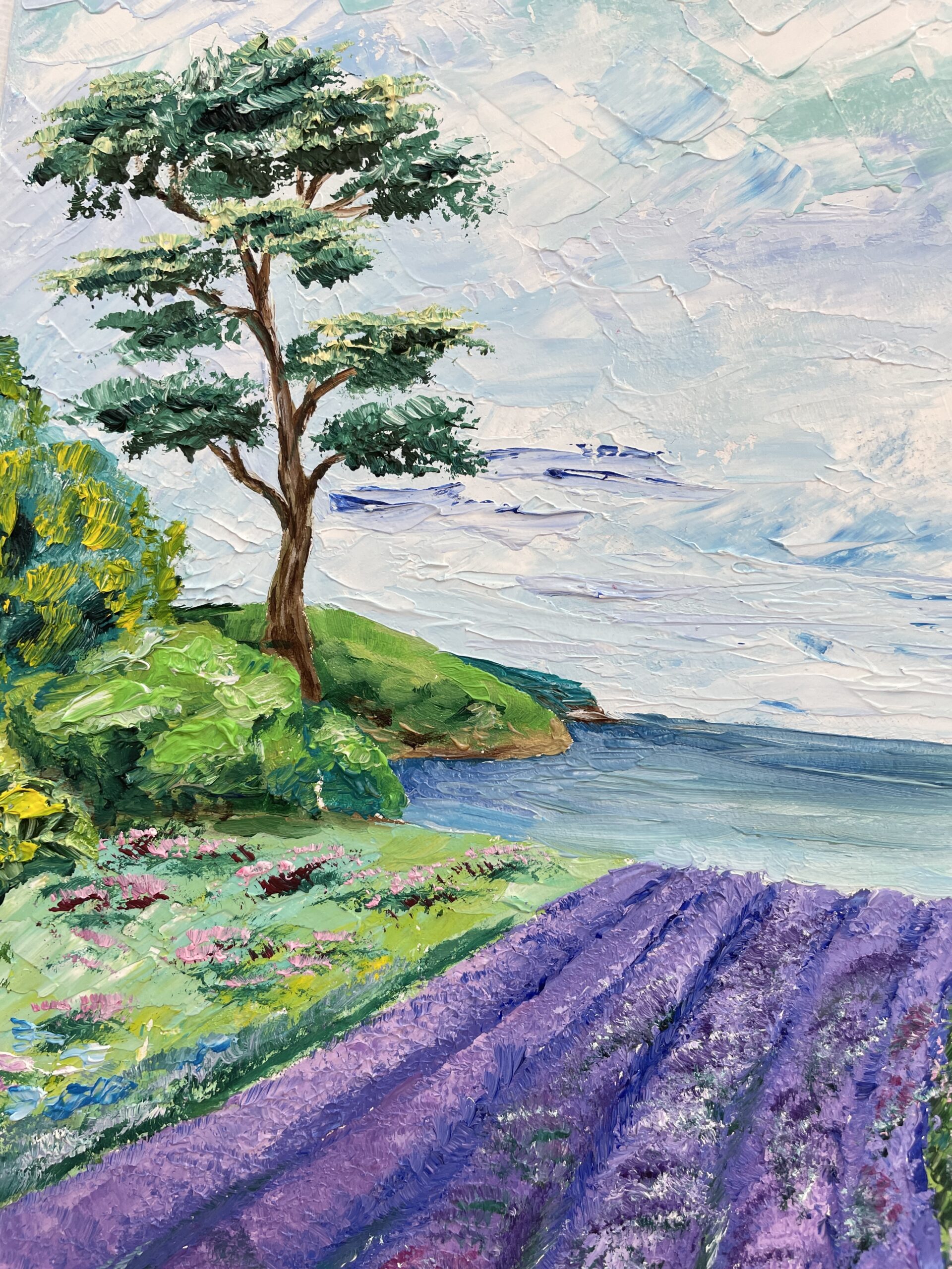 At the foreground, there are long lines of lavender flowers, going very far into the distance, almost reaching the sea. The sea itself can be only seen from an angle, and has subtle blue and greenish colors in the atmospheric perspective.