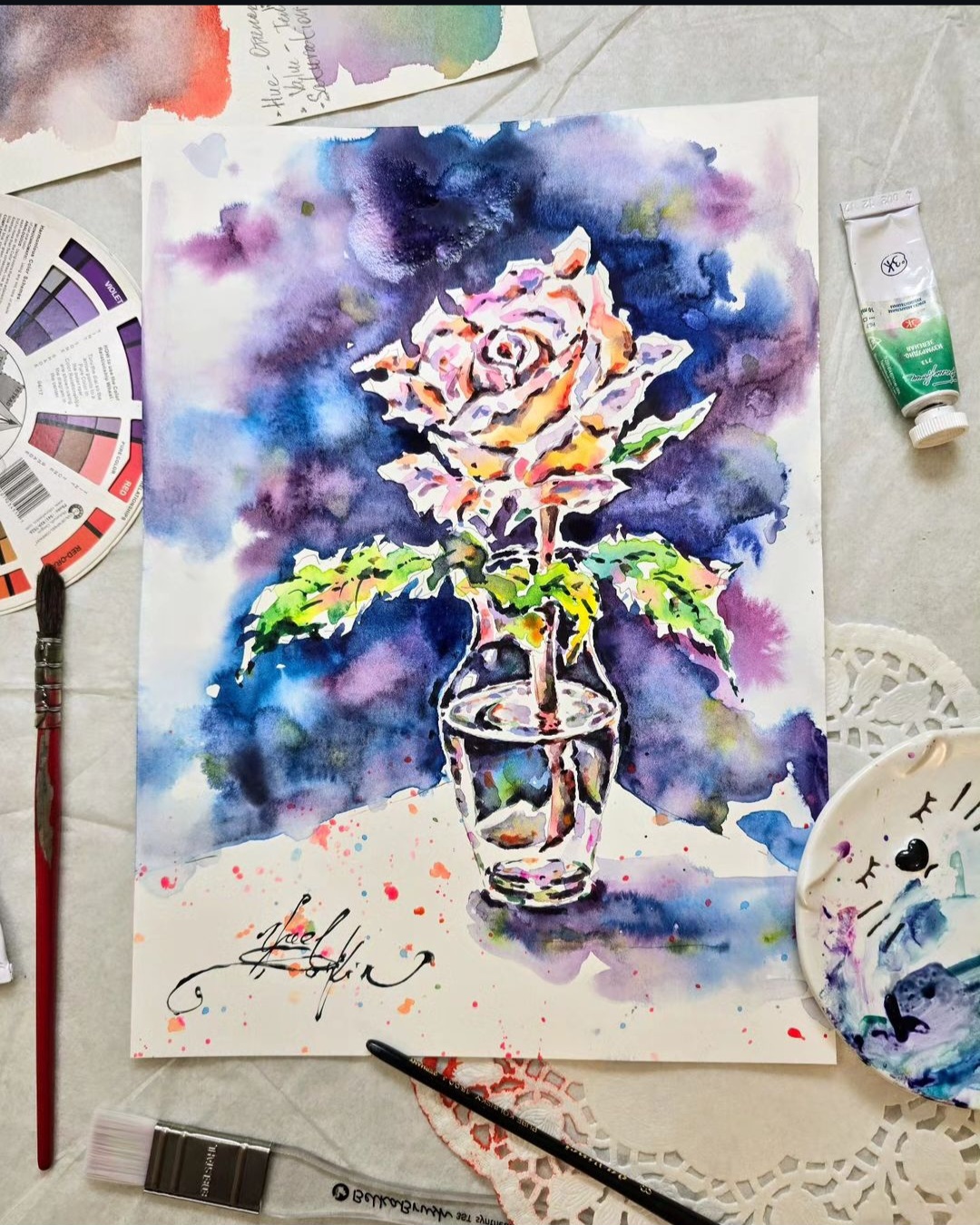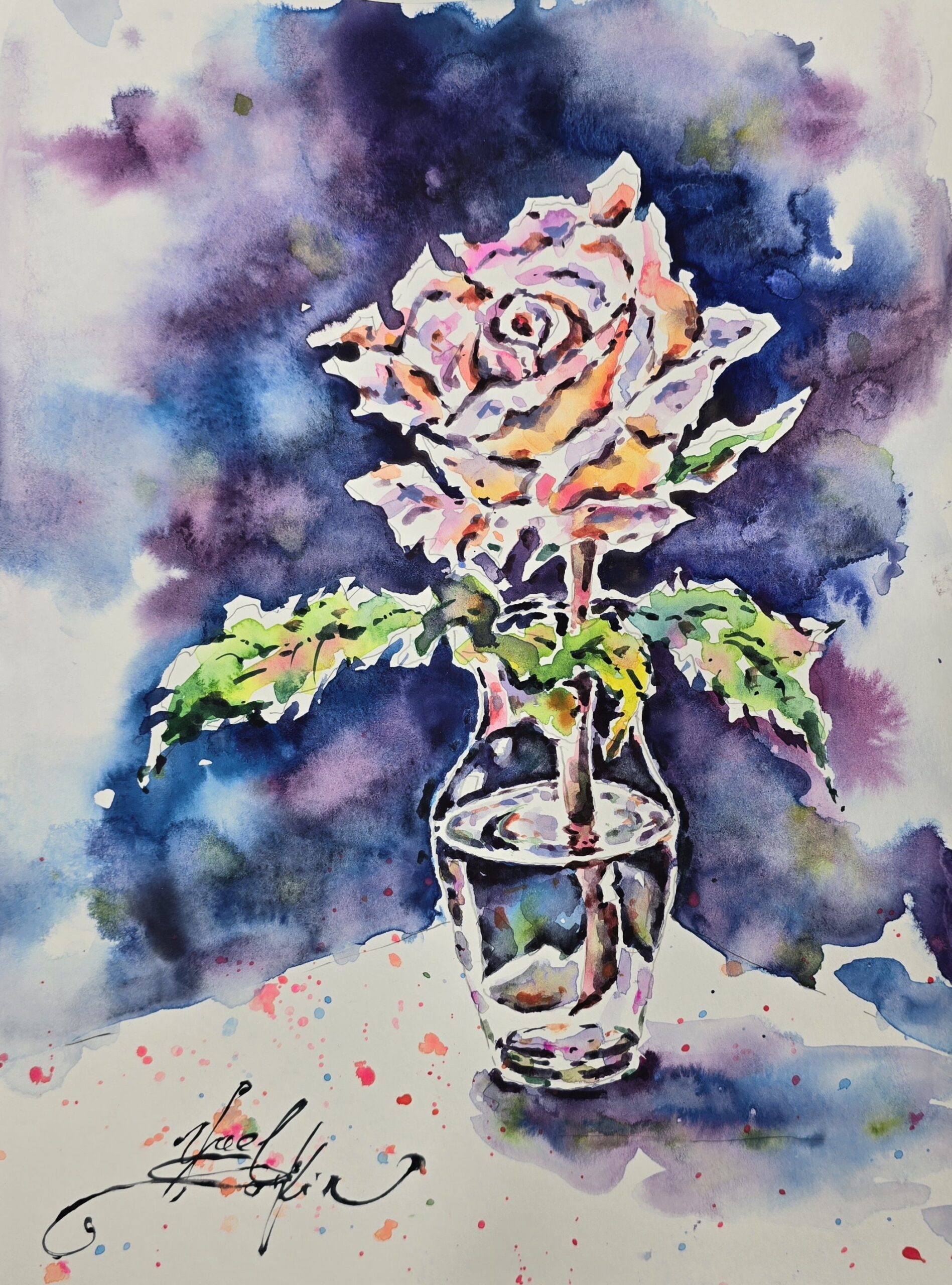 🎨This original watercolor painting of a single rose in a glass vase captures the timeless beauty and elegance of the flower. Painted in vibrant shades of pink, orange, and green against a deep, expressive background, the rose seems to glow with life and emotion. The glass vase adds a touch of transparency and light, making the composition both delicate and powerful.