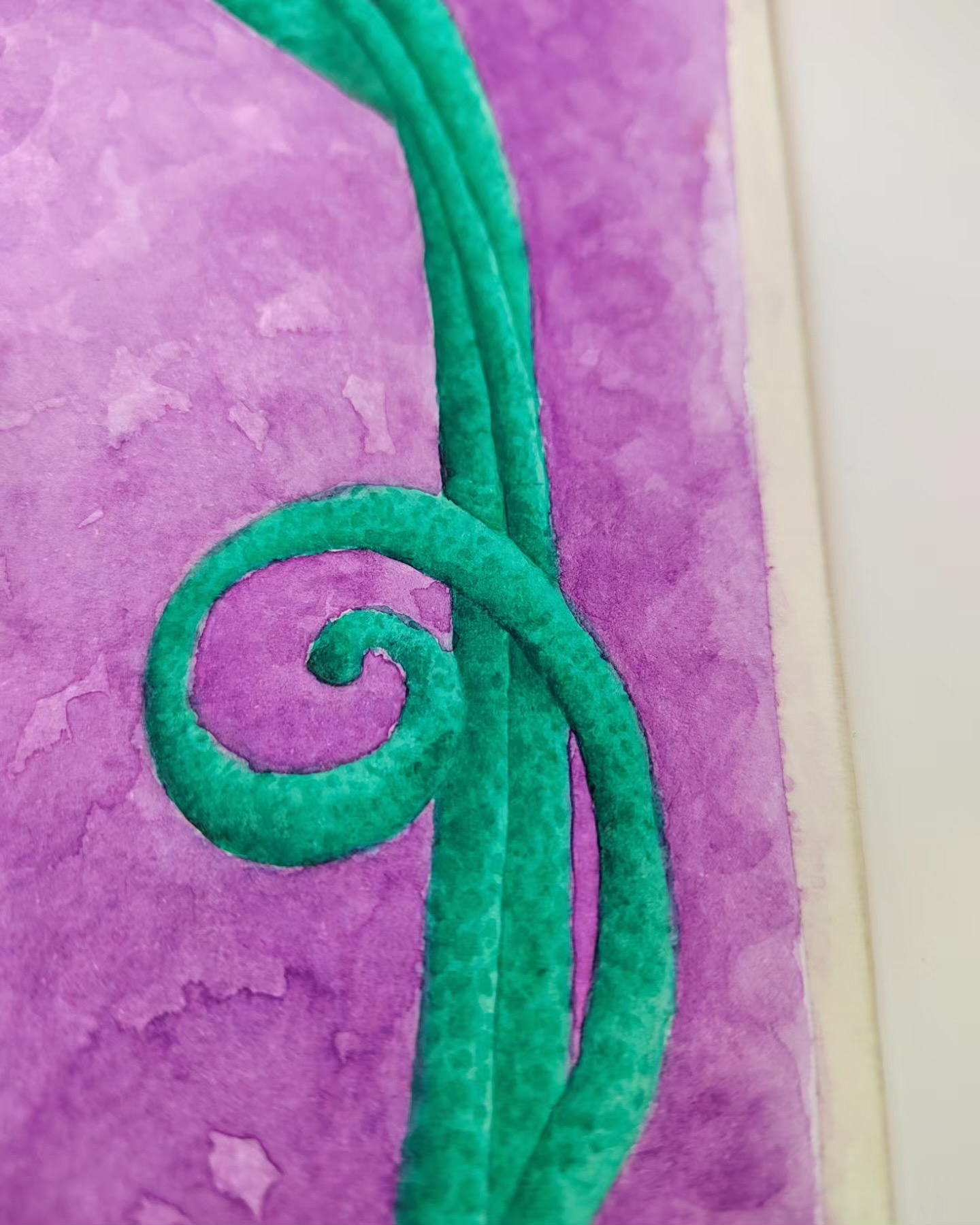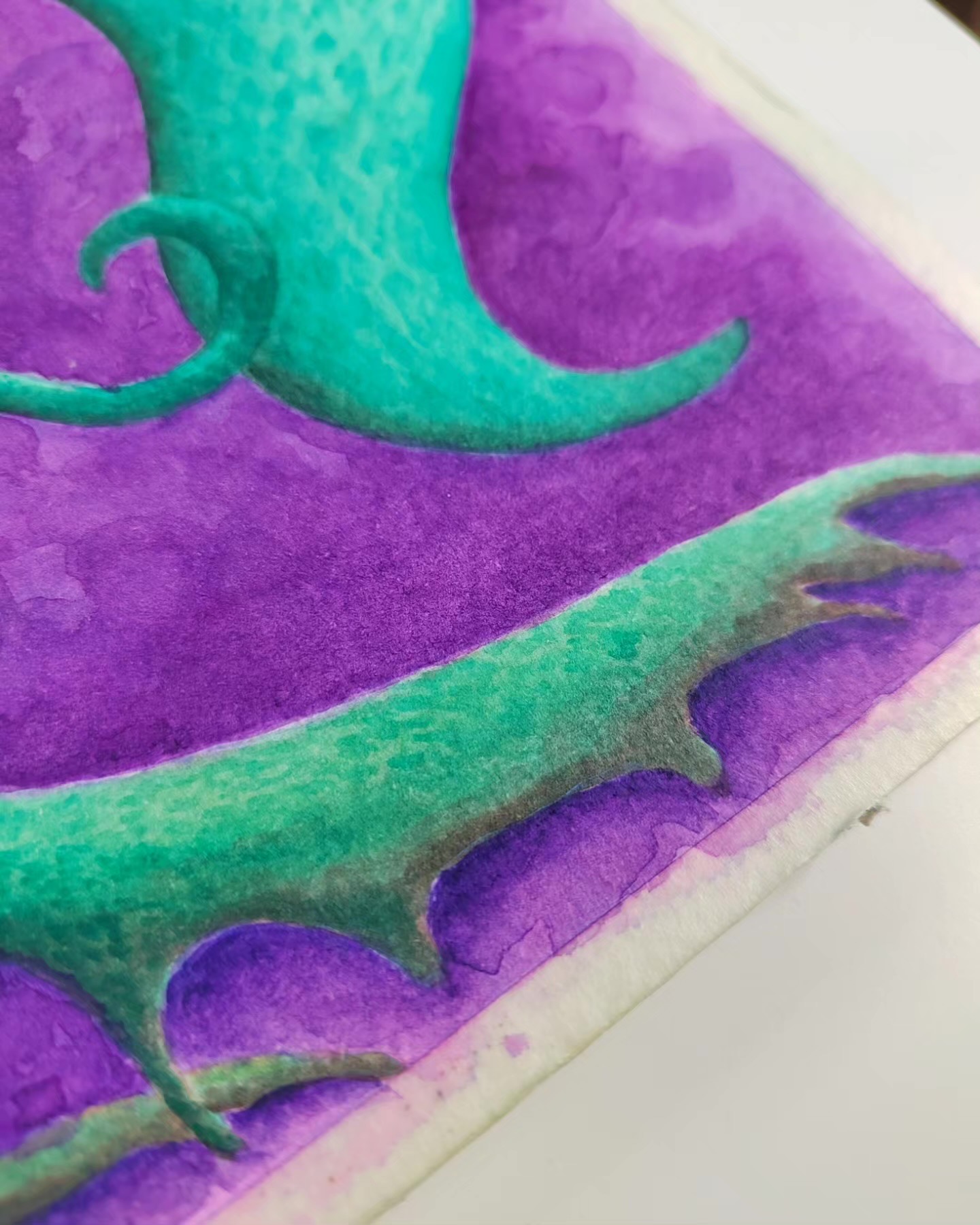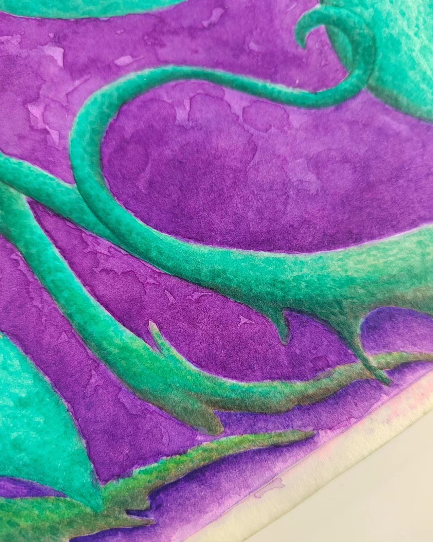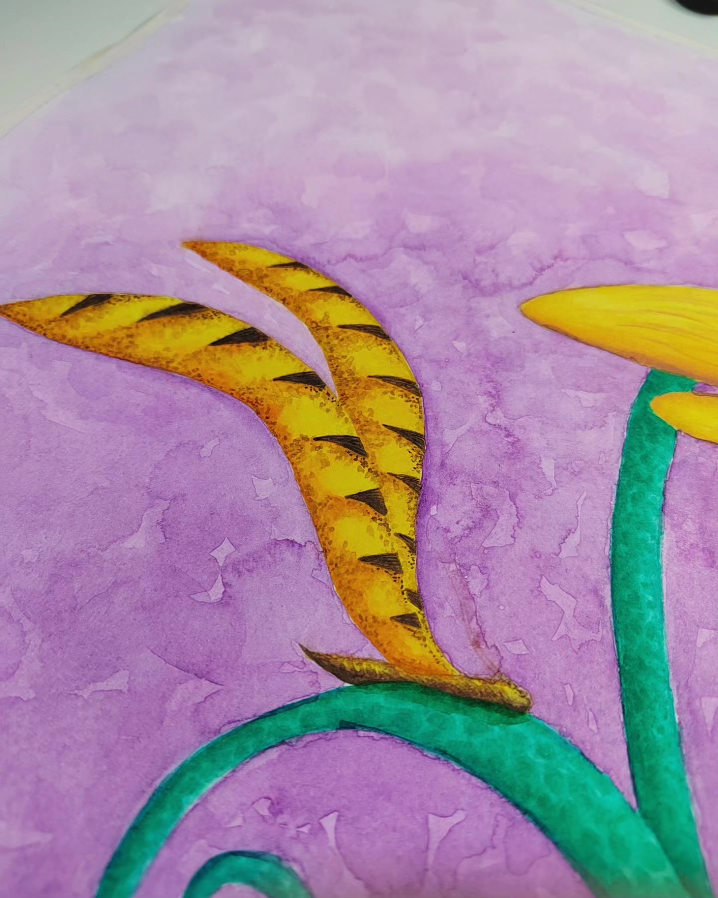 “Fruit” is a surreal and vibrant watercolor painting that merges fantasy with nature. At its heart lies a golden, textured fruit, its scaly surface shimmering with an almost mystical quality. Surrounding it, curling green vines and lush leaves intertwine, while bright yellow flowers extend their delicate petals, as if shielding and nurturing the central fruit. Their warm glow contrasts beautifully against the rich, textured purple background, enhancing the sense of depth and wonder. This artwork evokes a world where nature is both protective and enchanting, celebrating the harmony between the organic and the imaginary.
