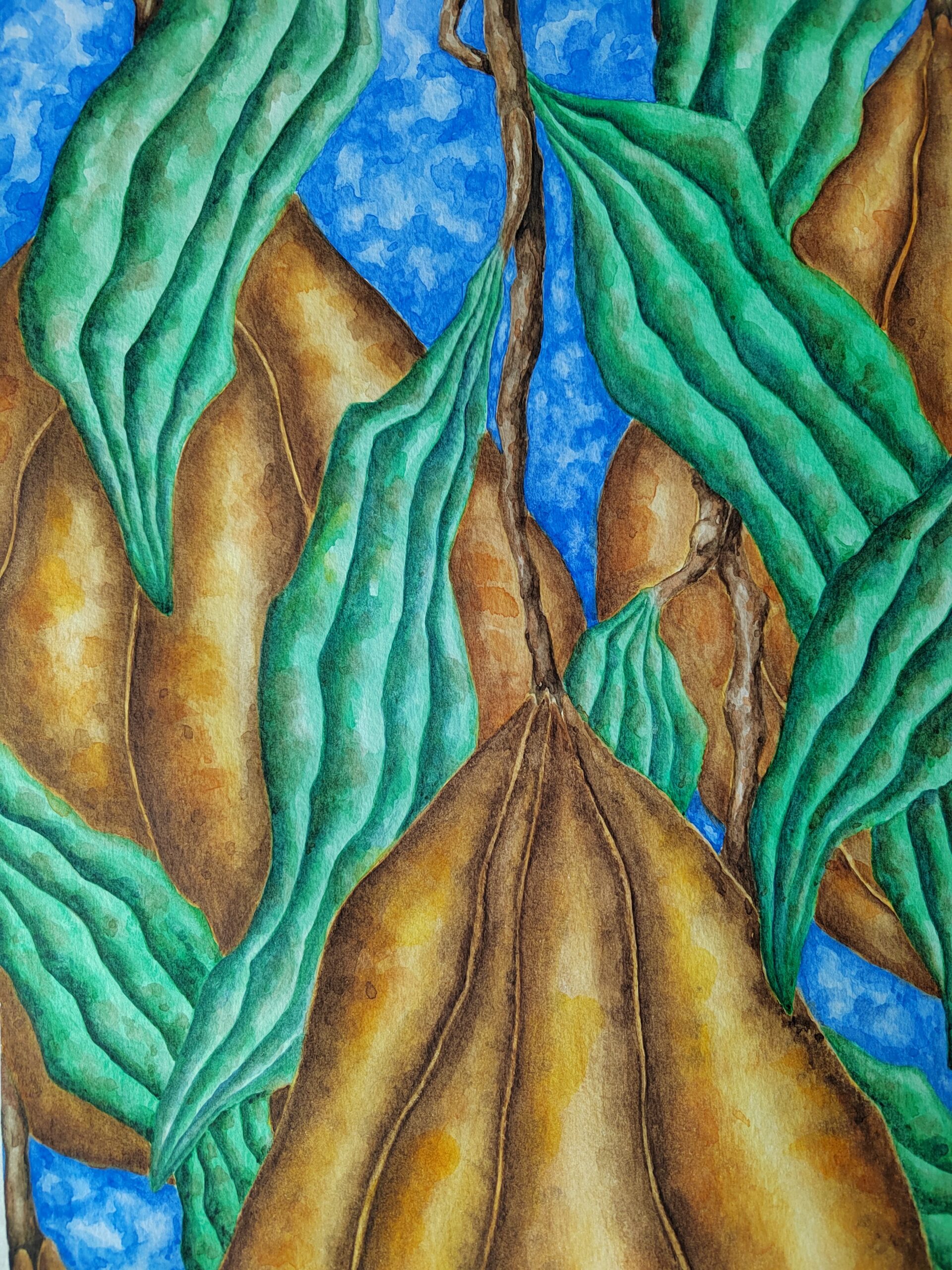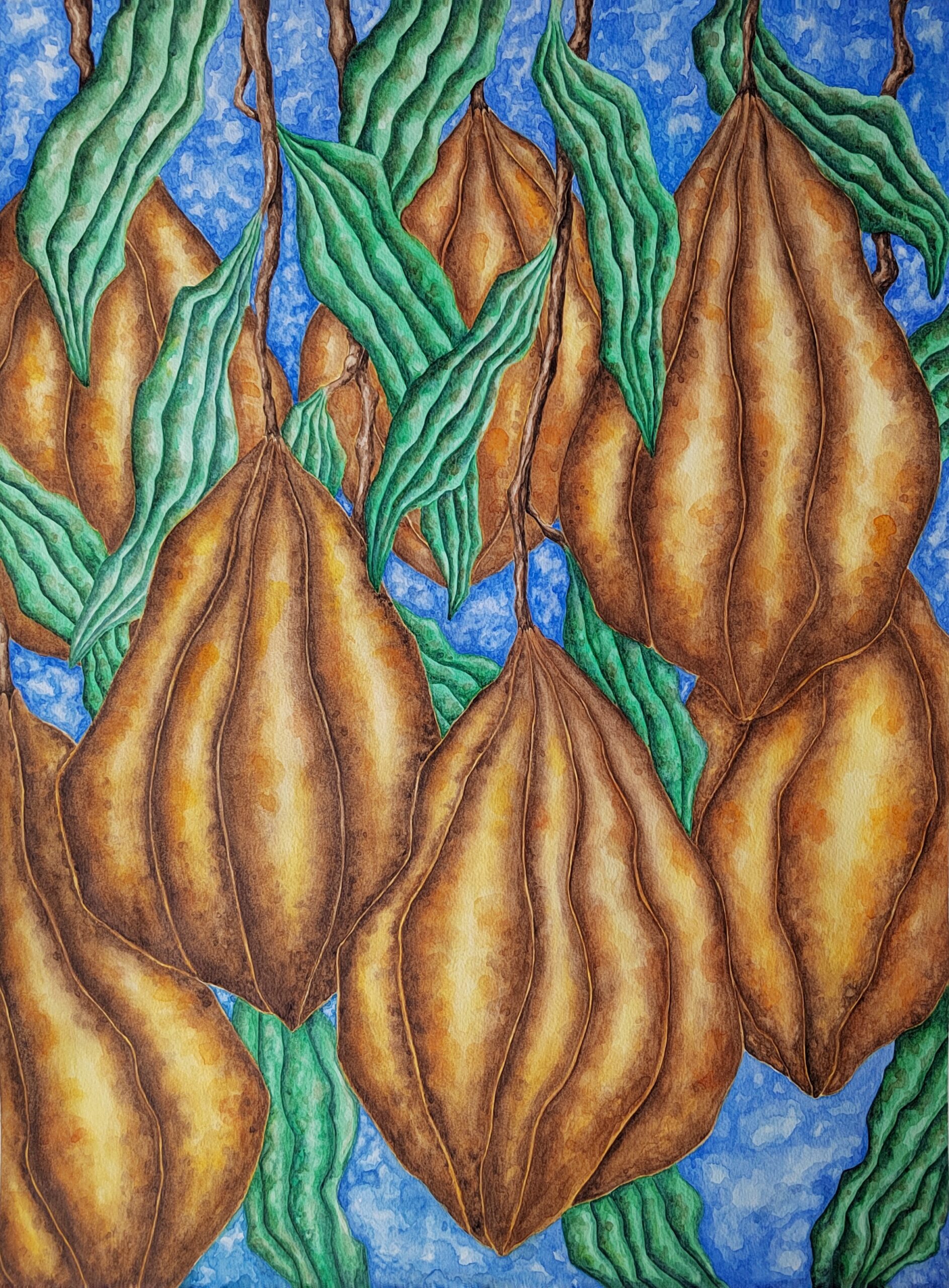 Step into a world of organic beauty with this captivating painting, where massive, hanging fruits sway gently on delicate branches, surrounded by lush green leaves. Their smooth surfaces glow with warm hues of amber, bronze, and mocha, echoing the richness of nature’s cycles. Set against a soft blue sky, they seem to float in a space between dream and reality. This artwork invites contemplation on ripening, time, and the inevitable changes that shape our world.