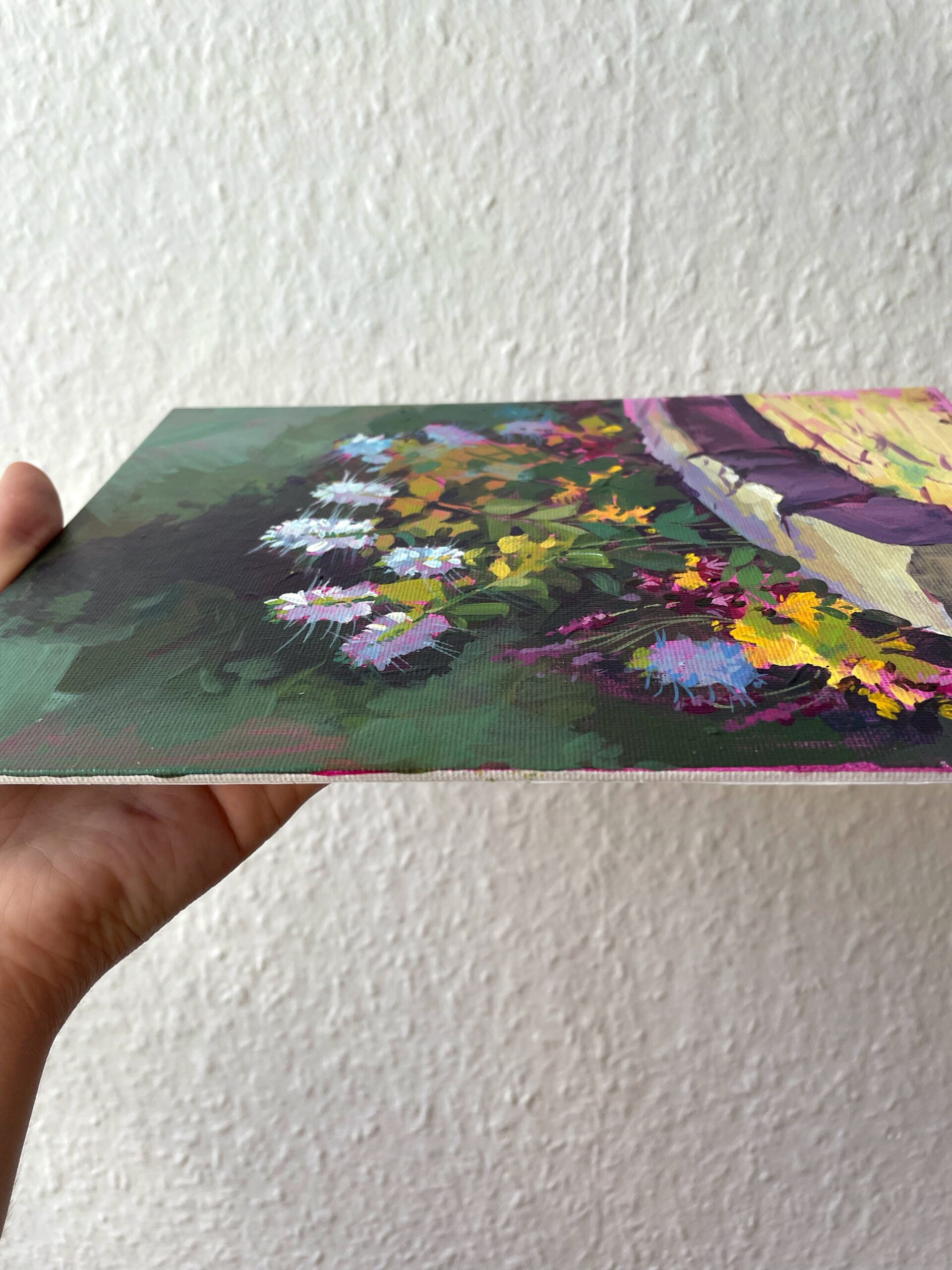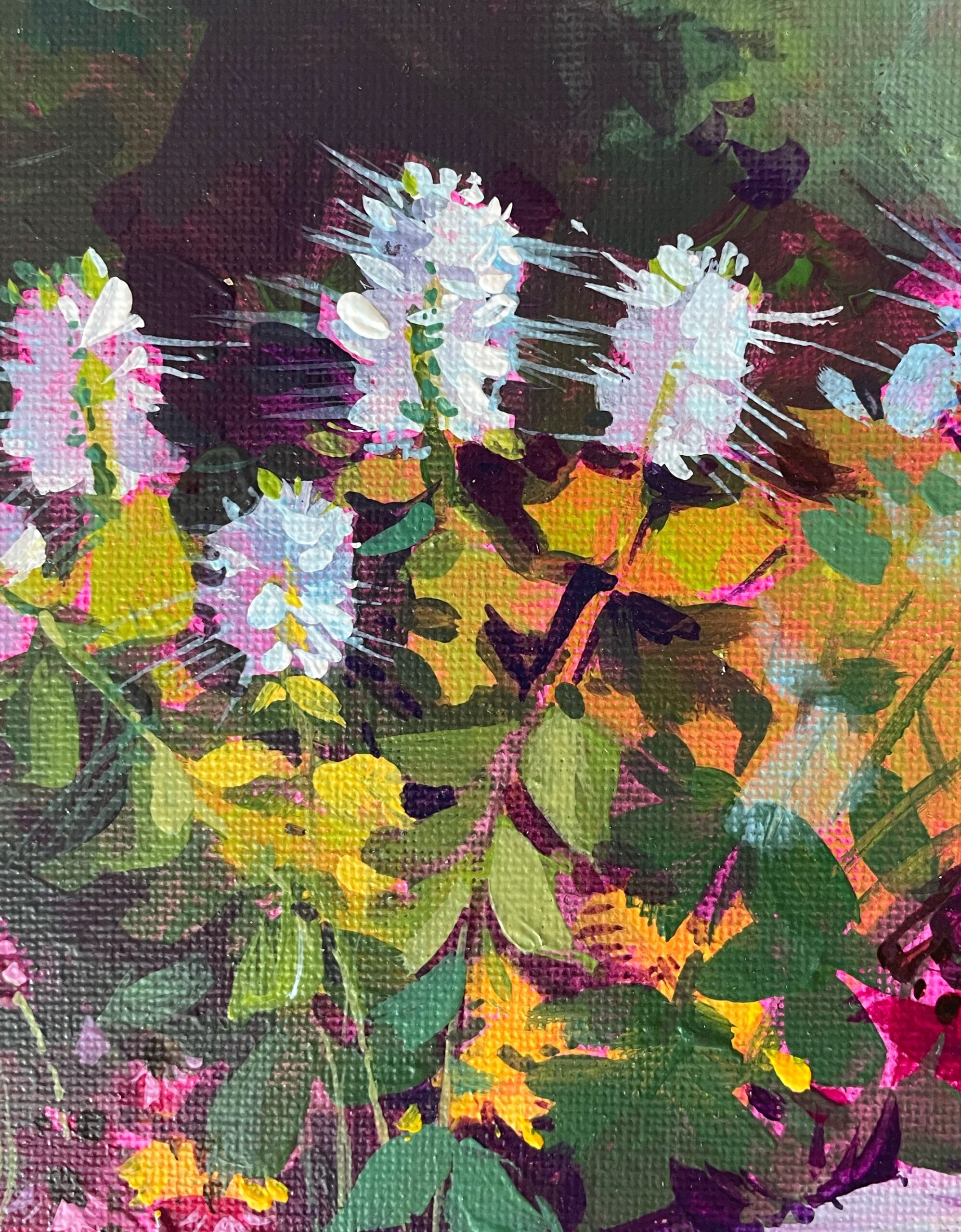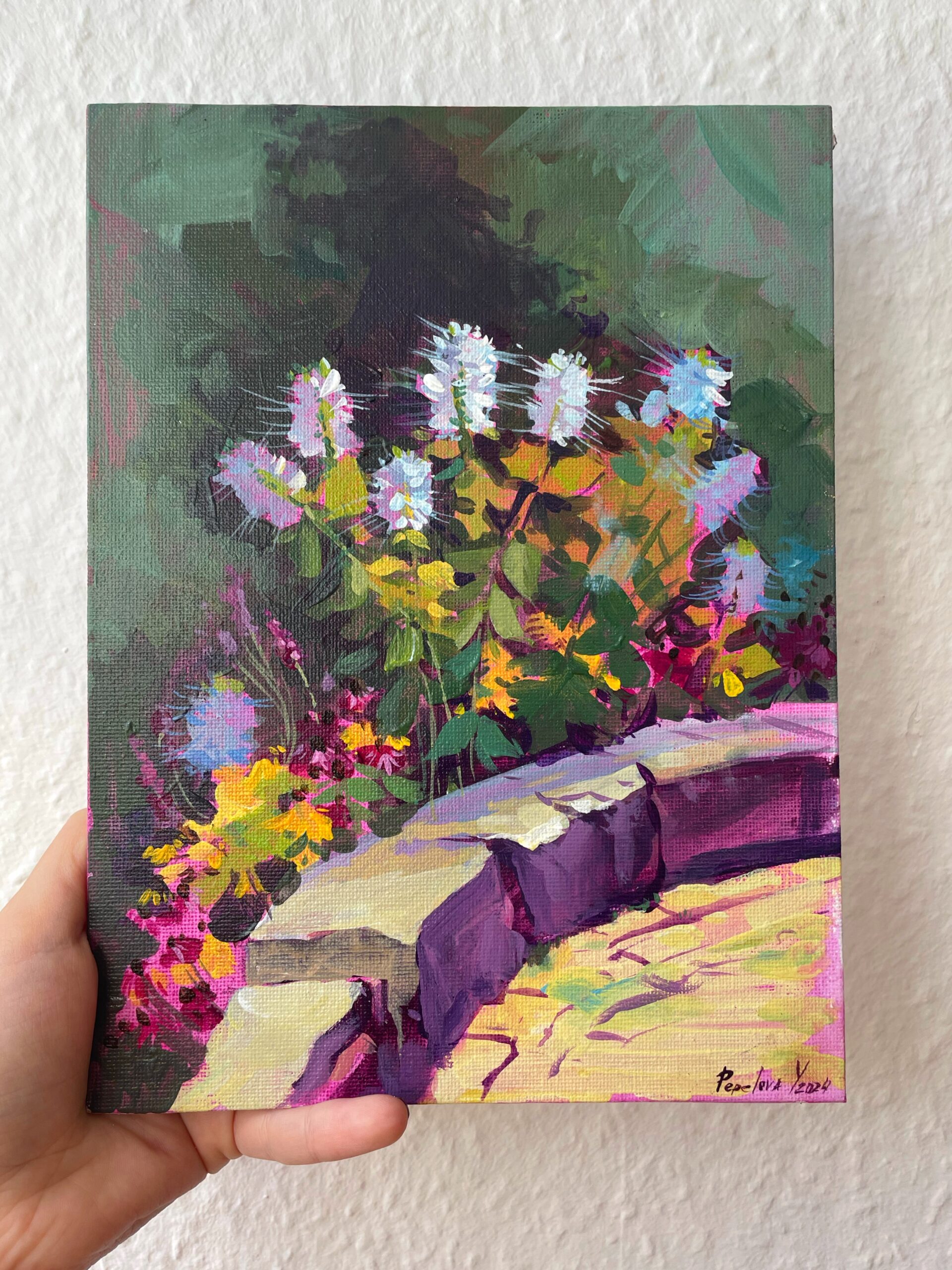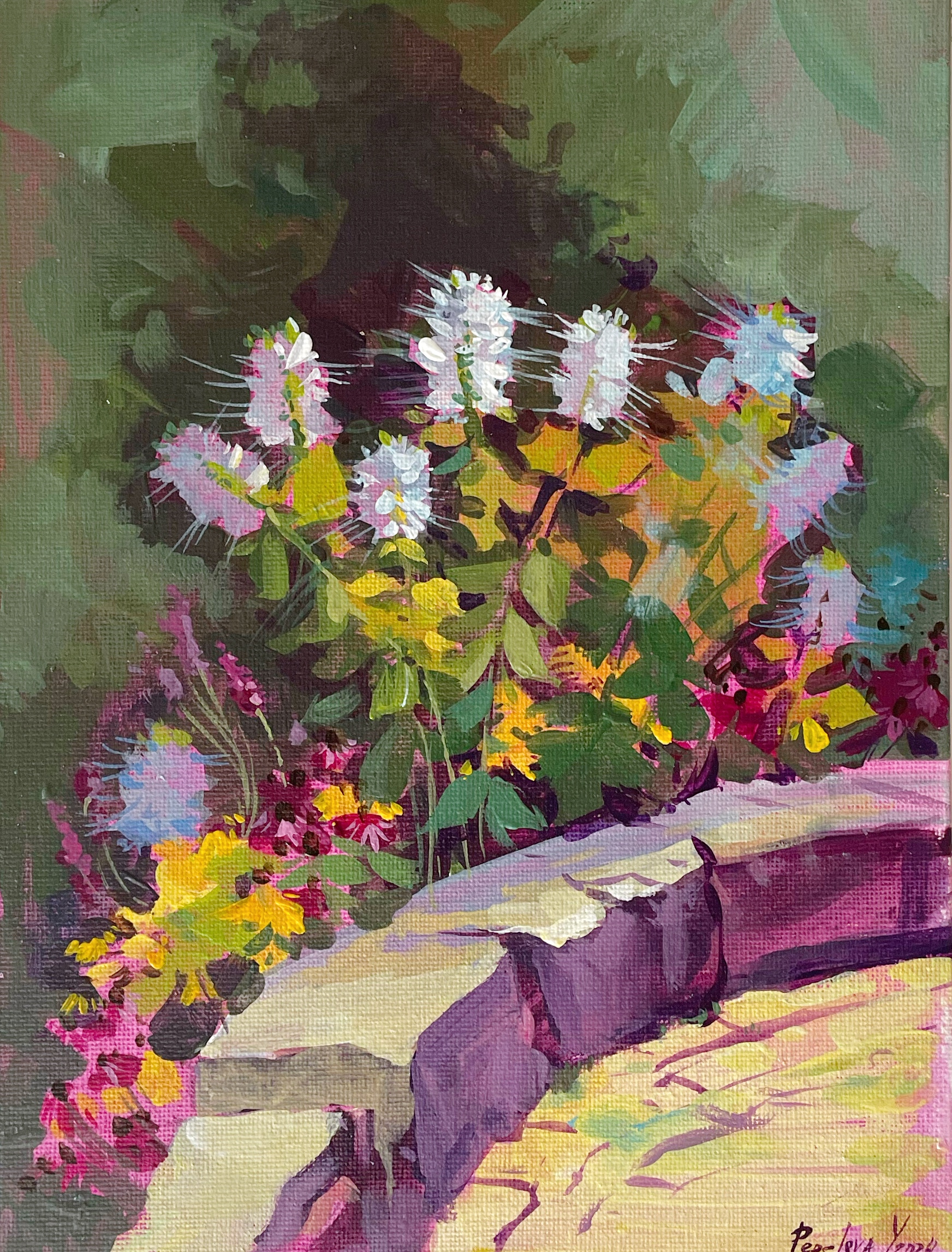 A lively depiction of blooming garden flowers near a stone path, painted with expressive brushstrokes and vivid colors.