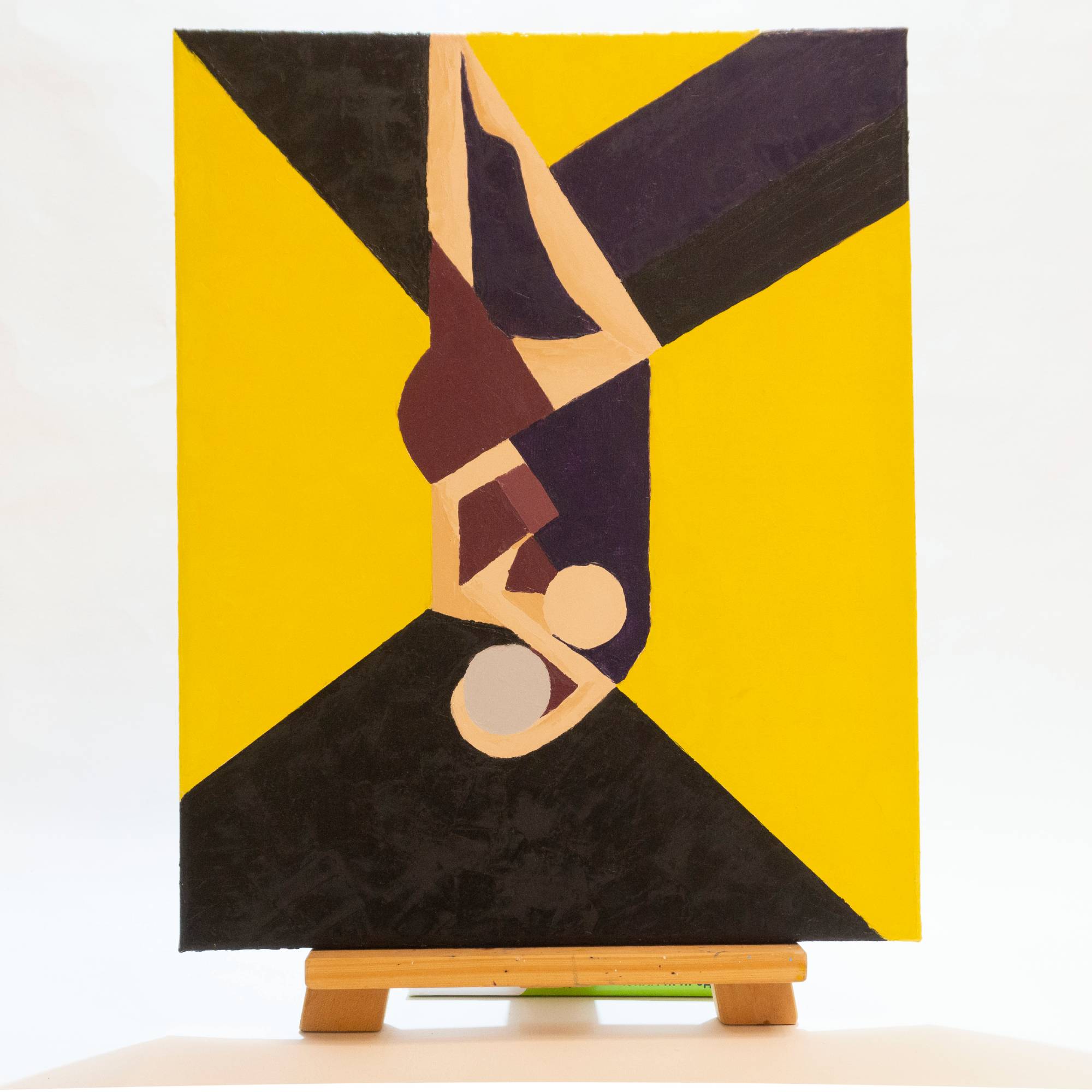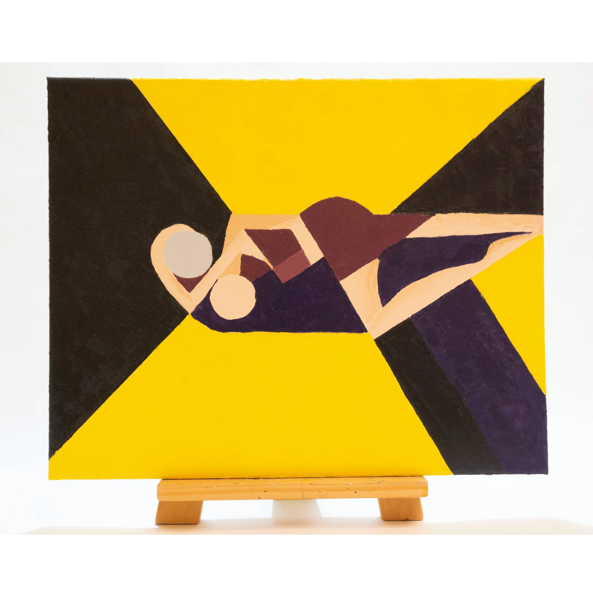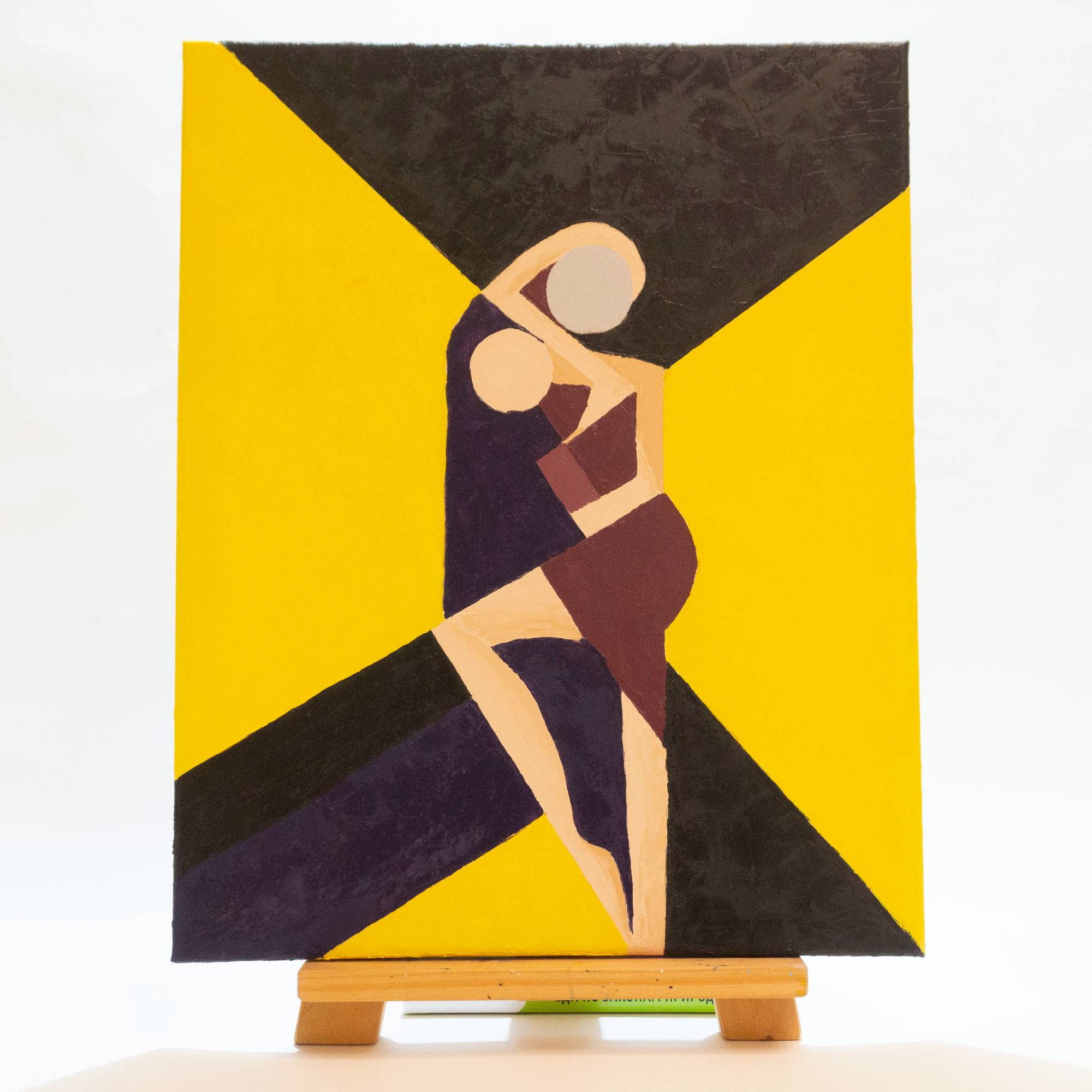 This original oil painting presents an abstract interpretation of a couple, expressed through geometric forms and a bold композиция. Two figures are intertwined in a quiet, intimate moment, reduced to essential shapes and planes. The bright yellow background creates a strong visual contrast, symbolizing warmth, light, and emotional energy, while darker tones add balance and depth.