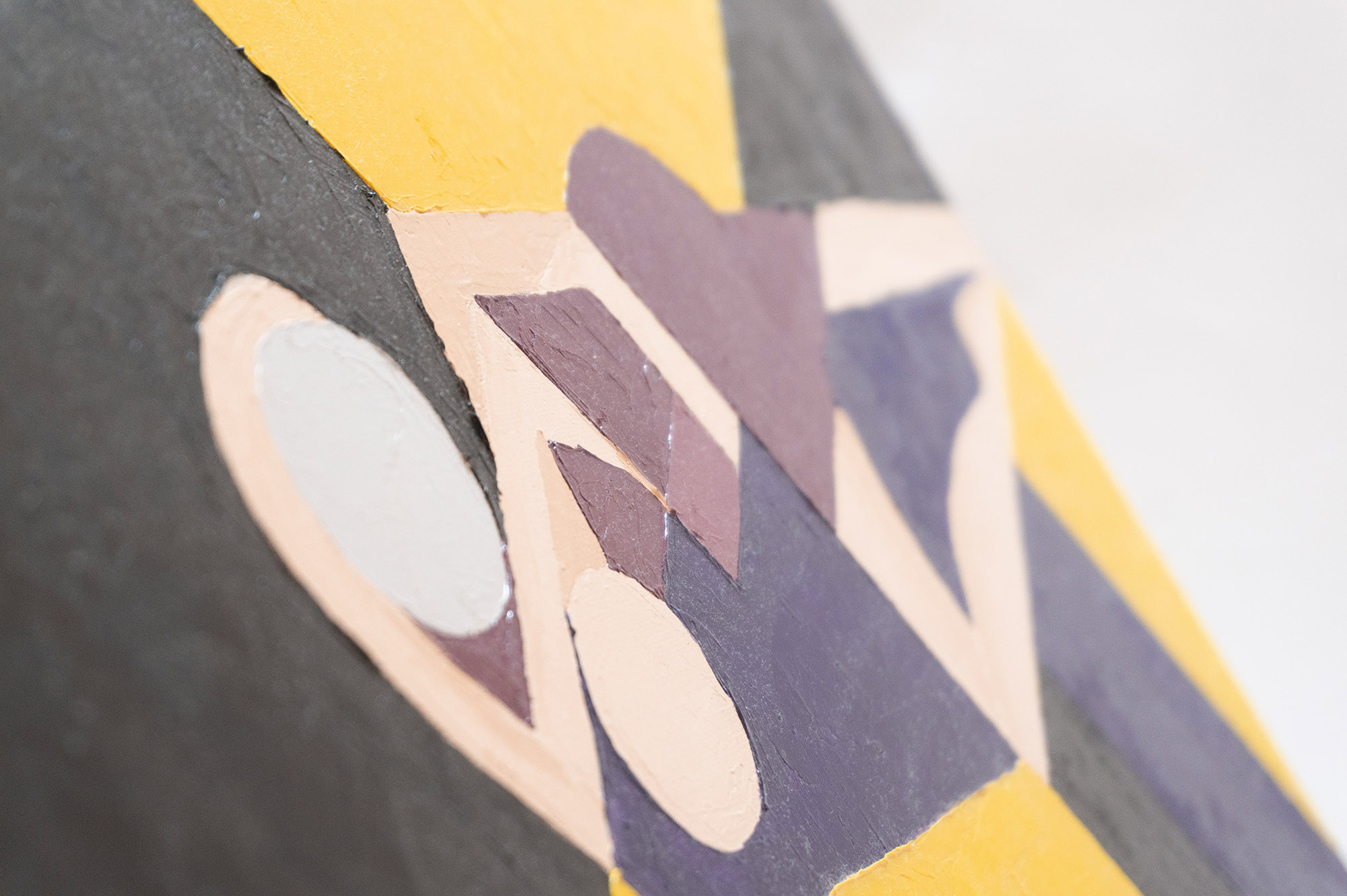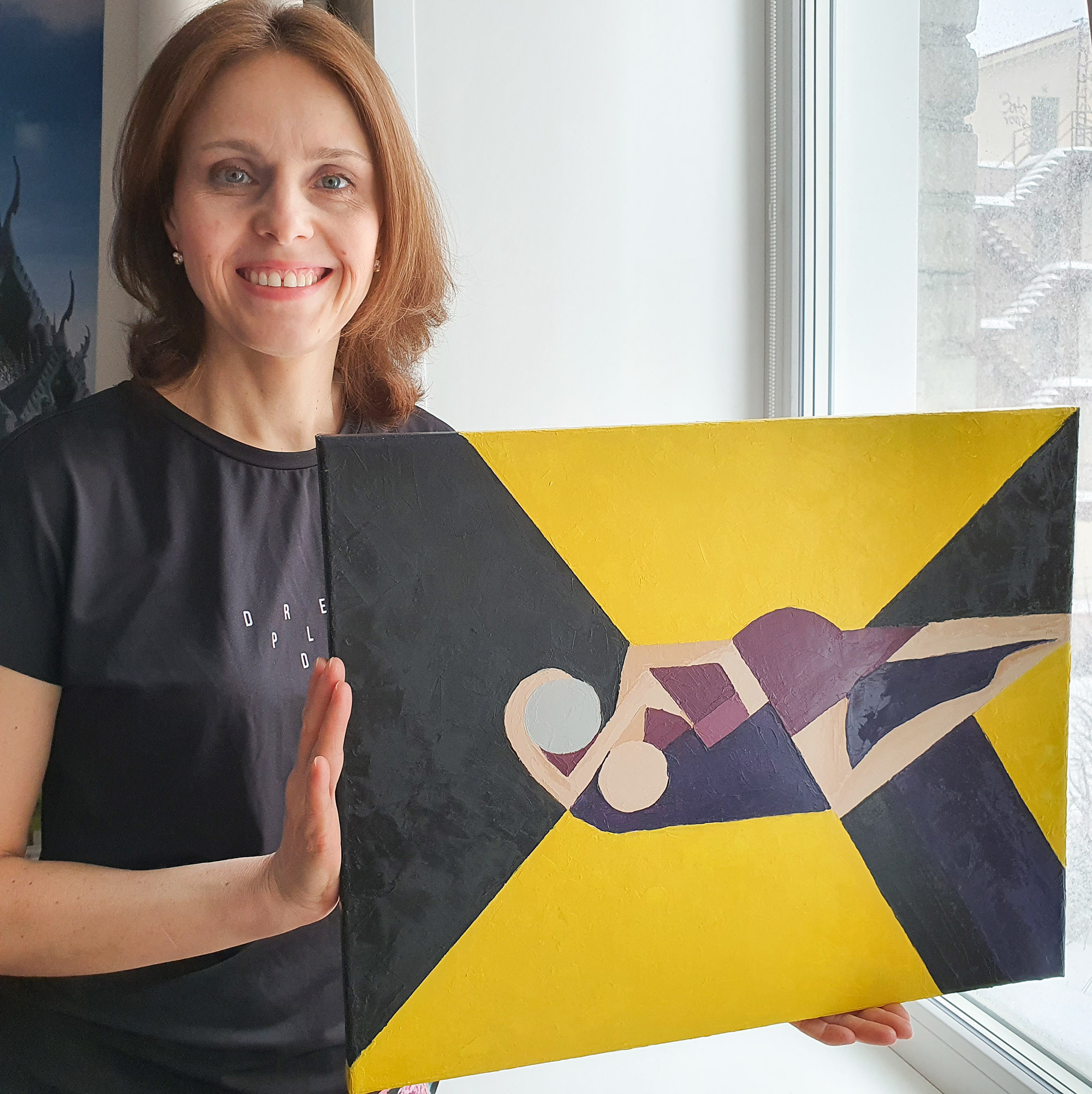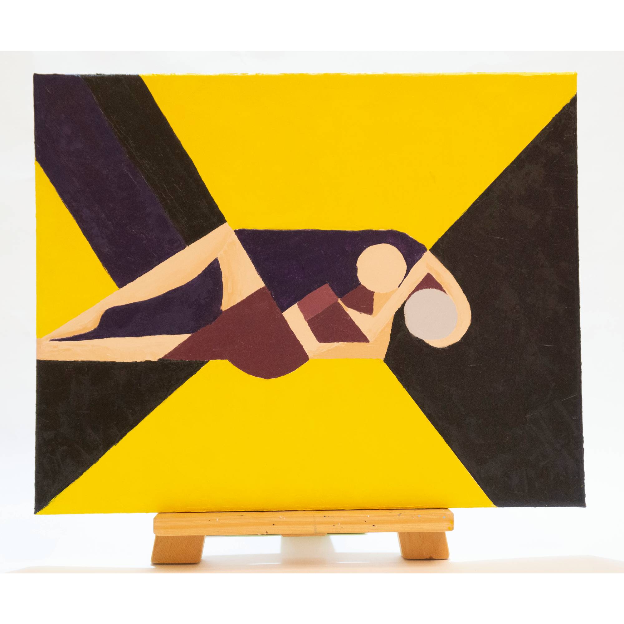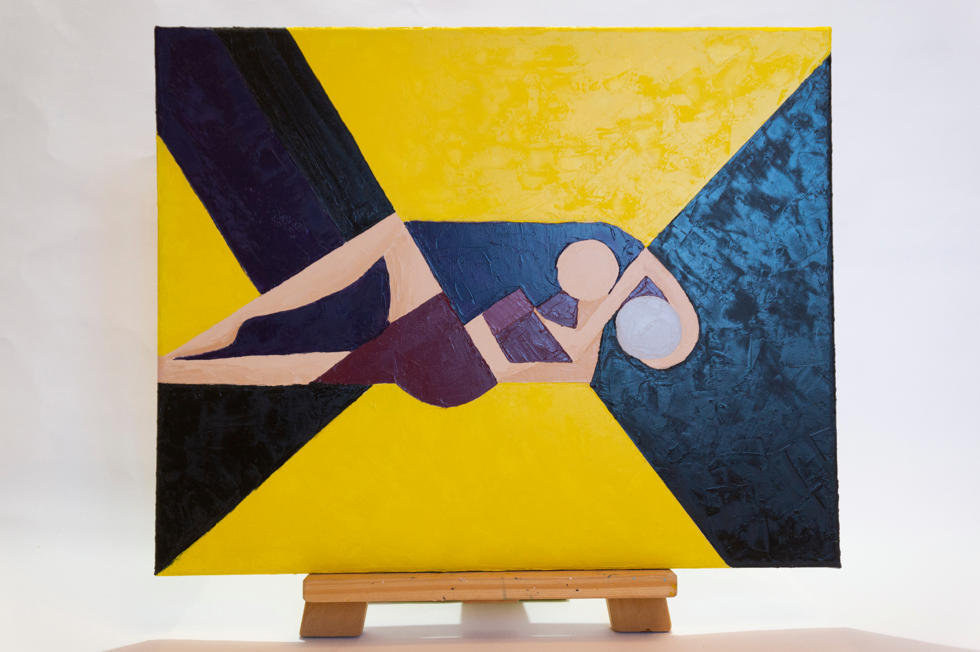 This original oil painting presents an abstract interpretation of a couple, expressed through geometric forms and a bold композиция. Two figures are intertwined in a quiet, intimate moment, reduced to essential shapes and planes. The bright yellow background creates a strong visual contrast, symbolizing warmth, light, and emotional energy, while darker tones add balance and depth.