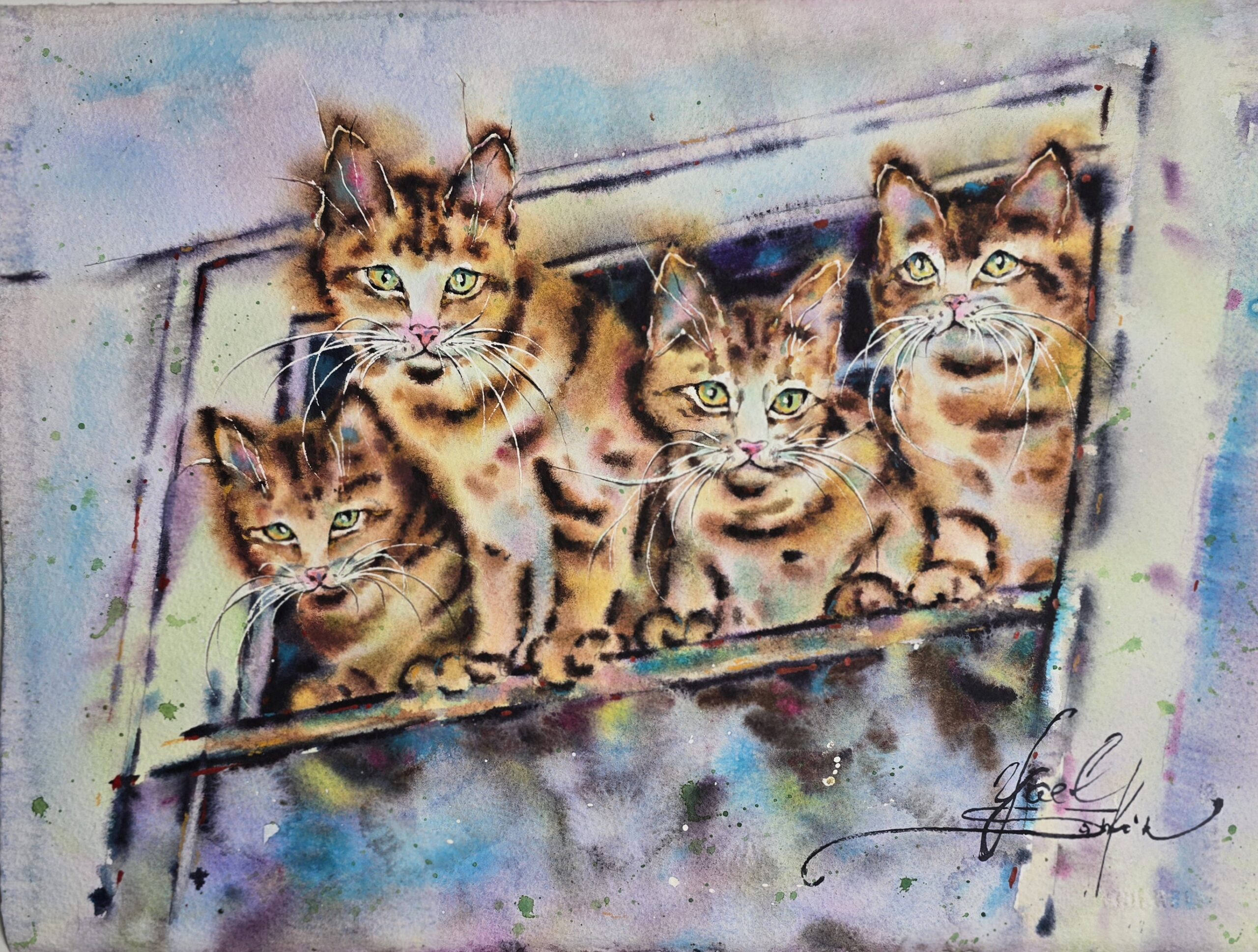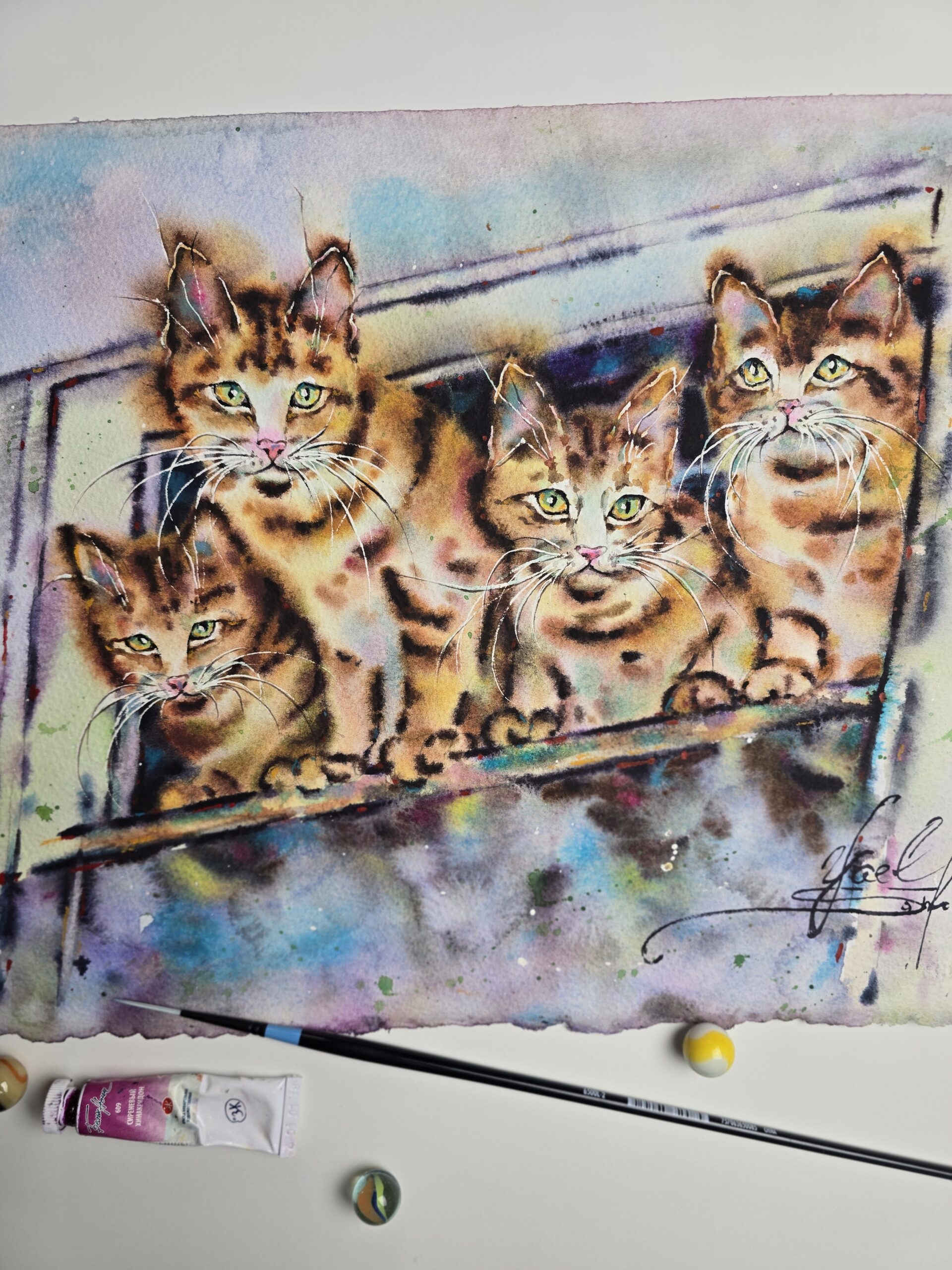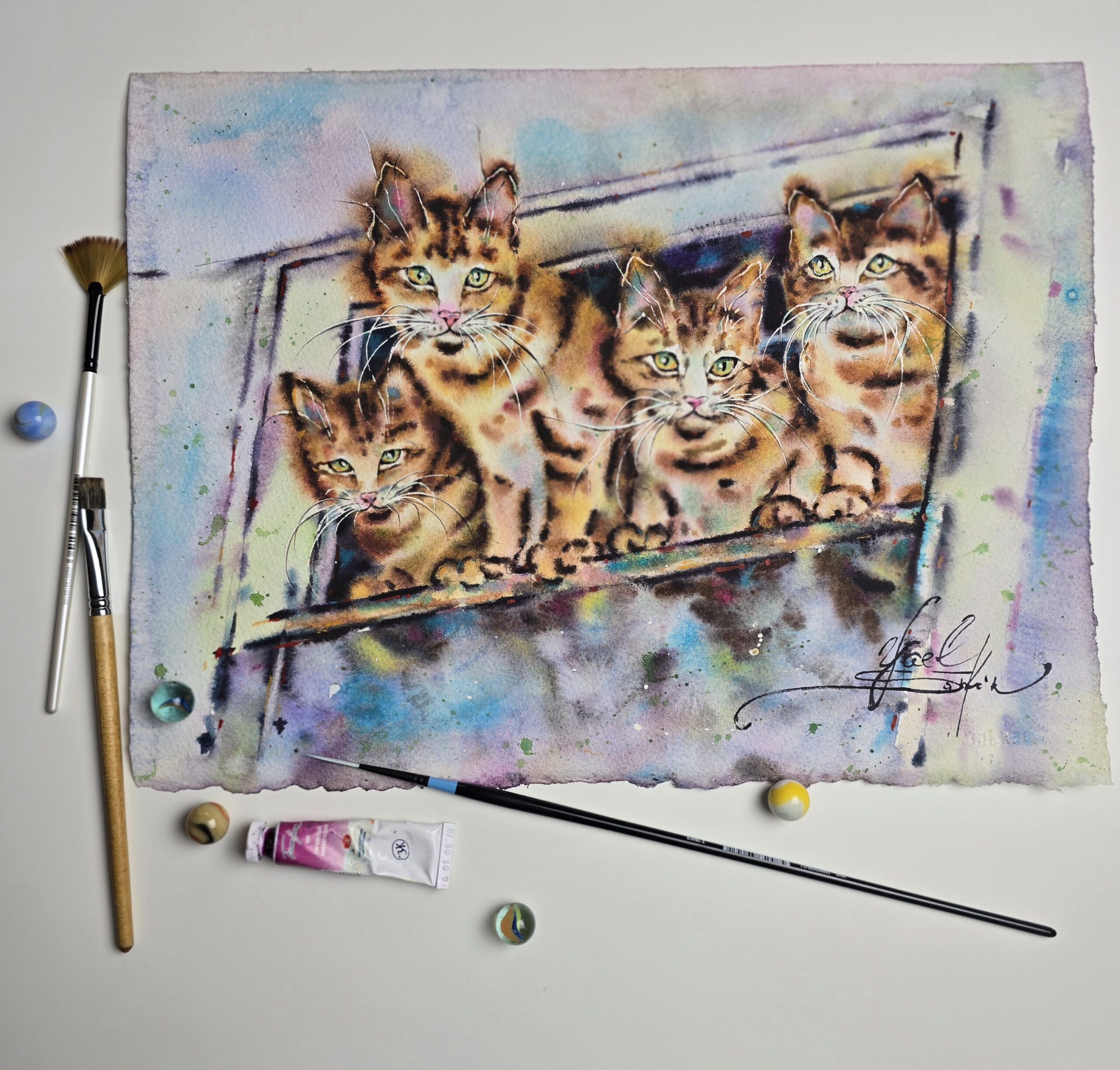 🎨This original watercolor painting features four adorable ginger kittens sitting together on a windowsill, each with bright green eyes and curious expressions.