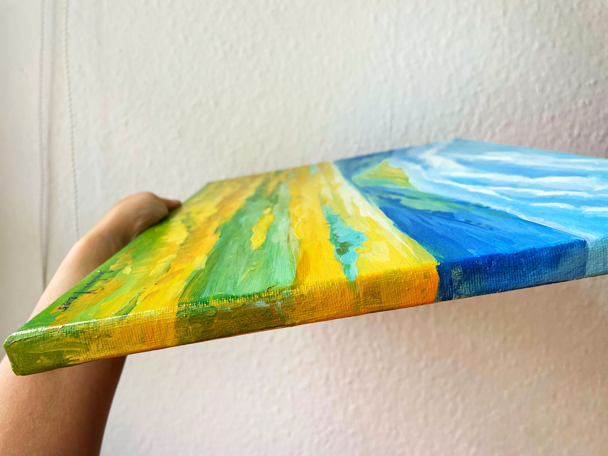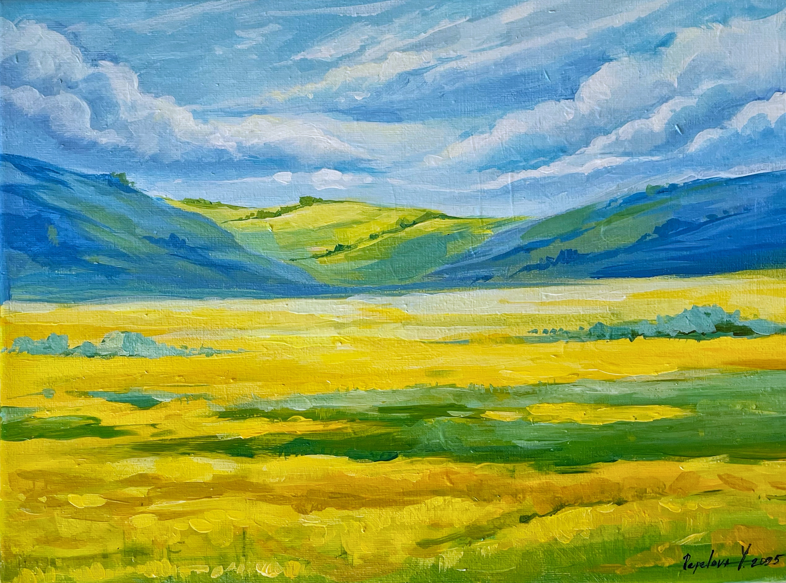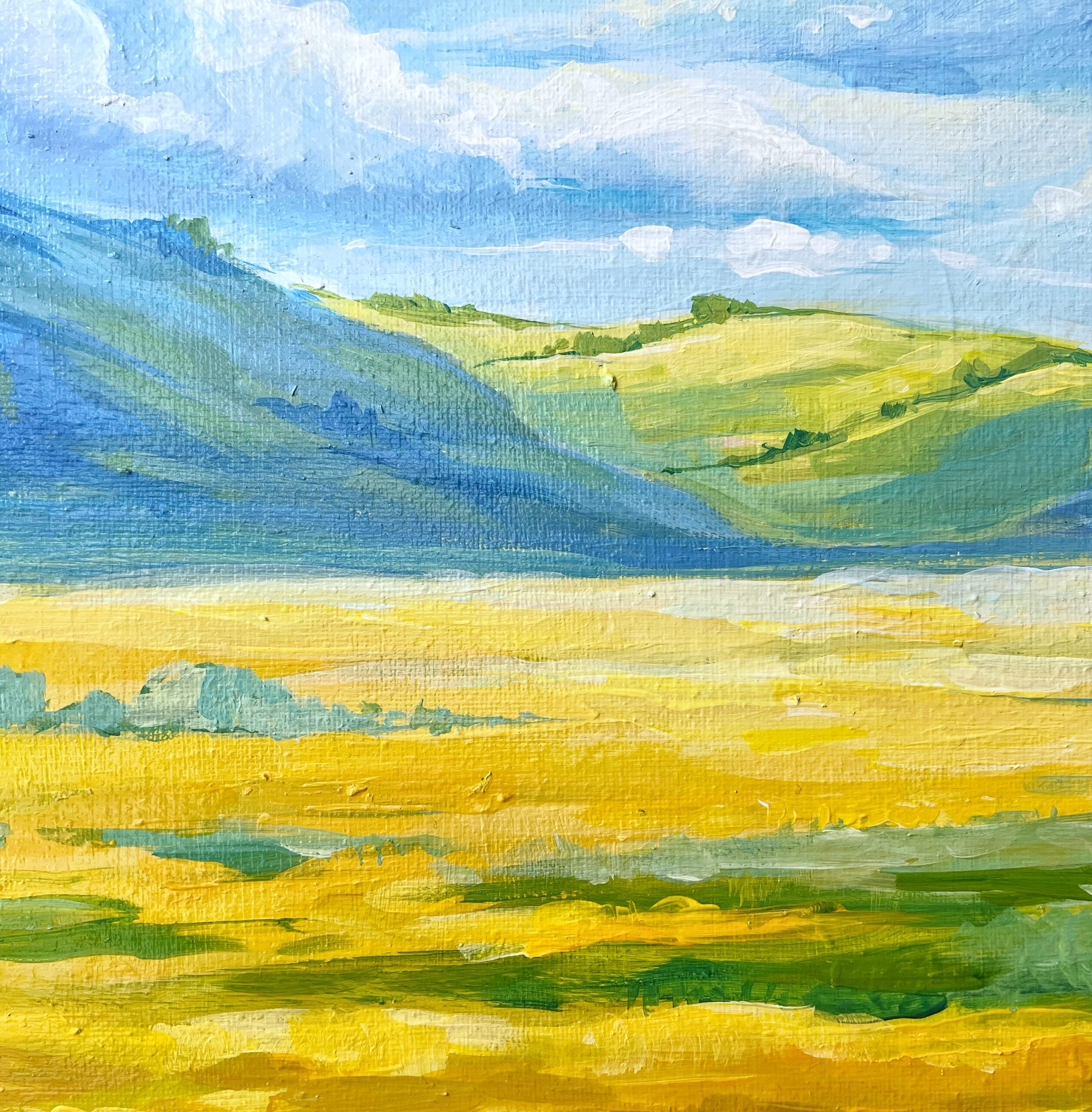 This artwork captures a vivid impression of a wide golden field under a summer sky, surrounded by soft rolling hills.