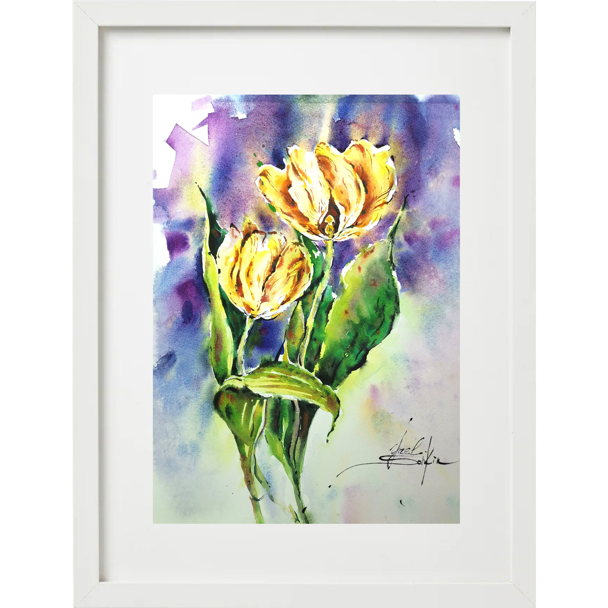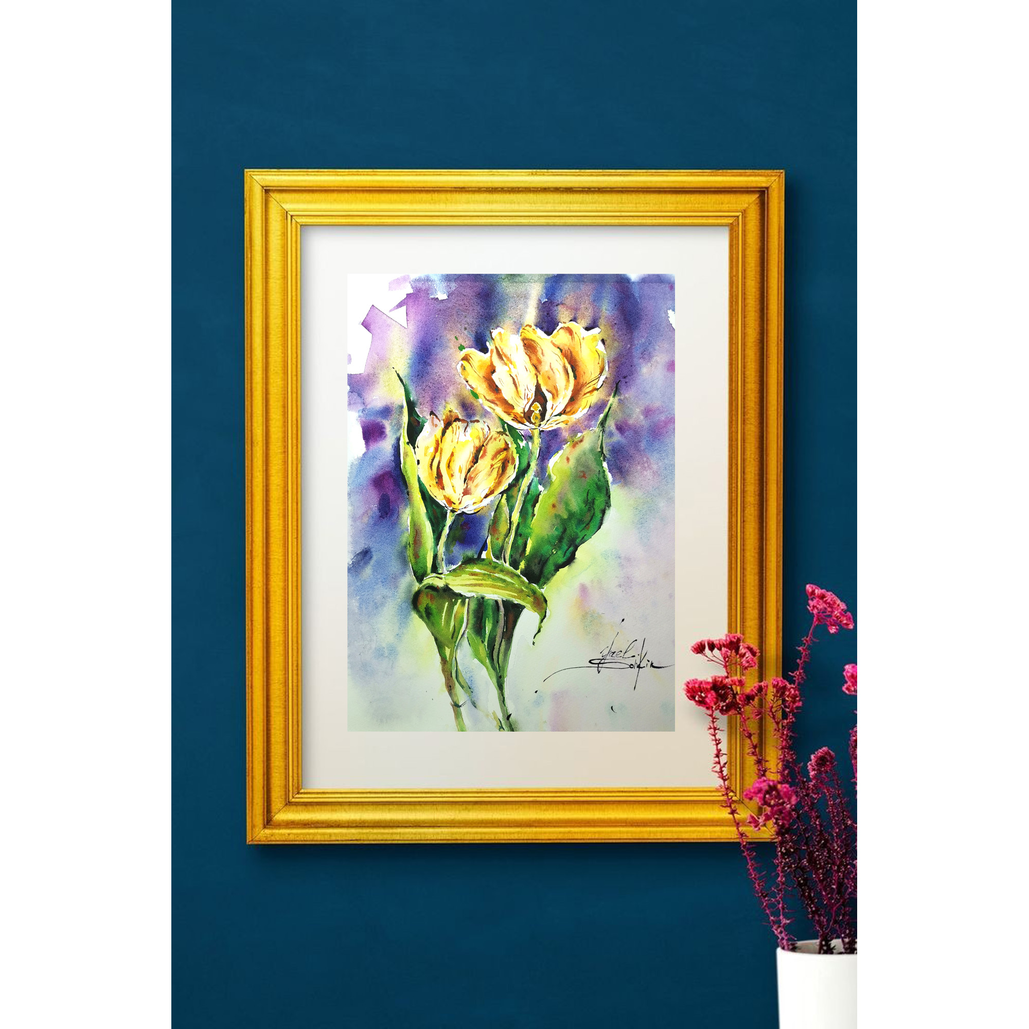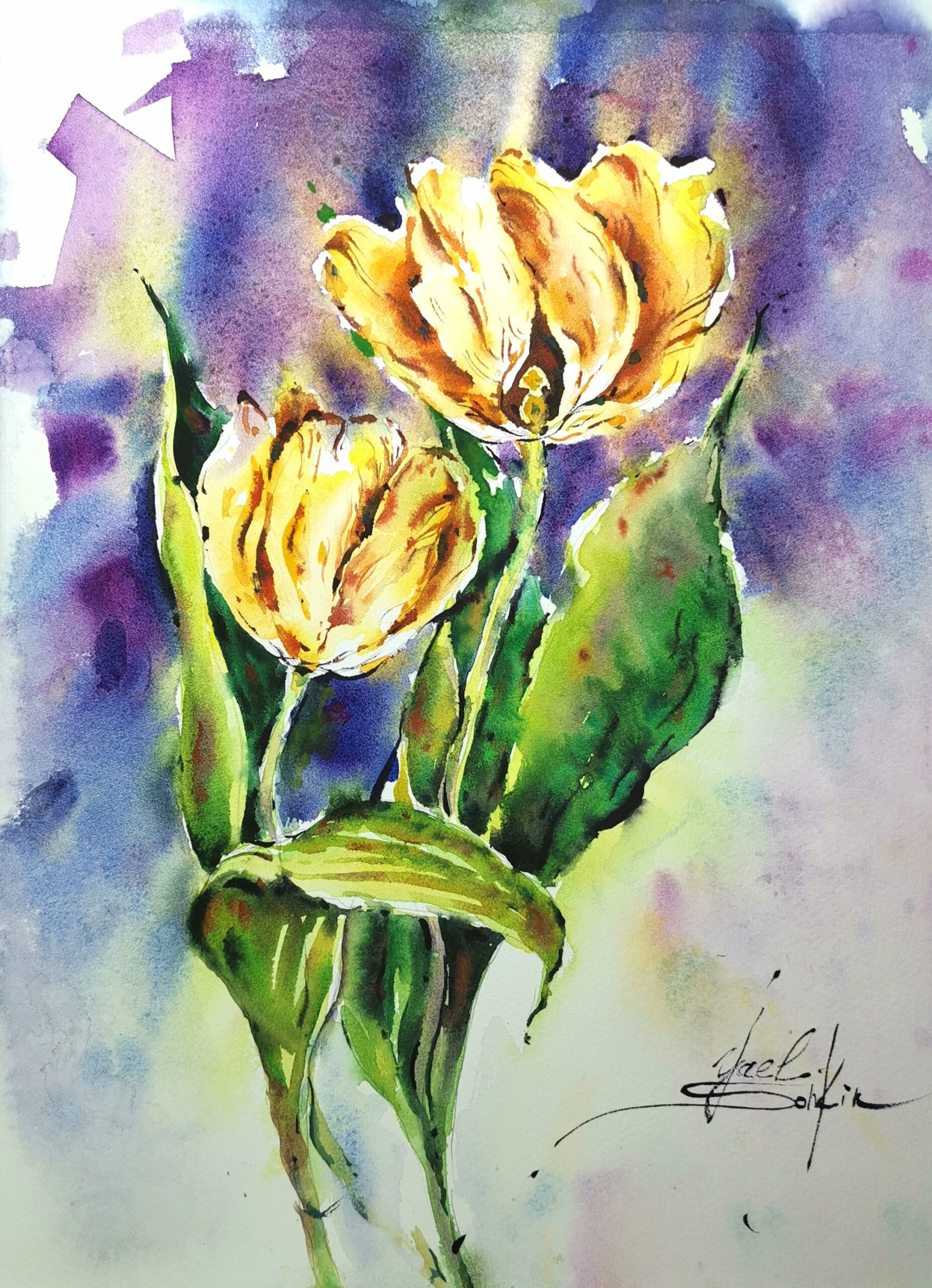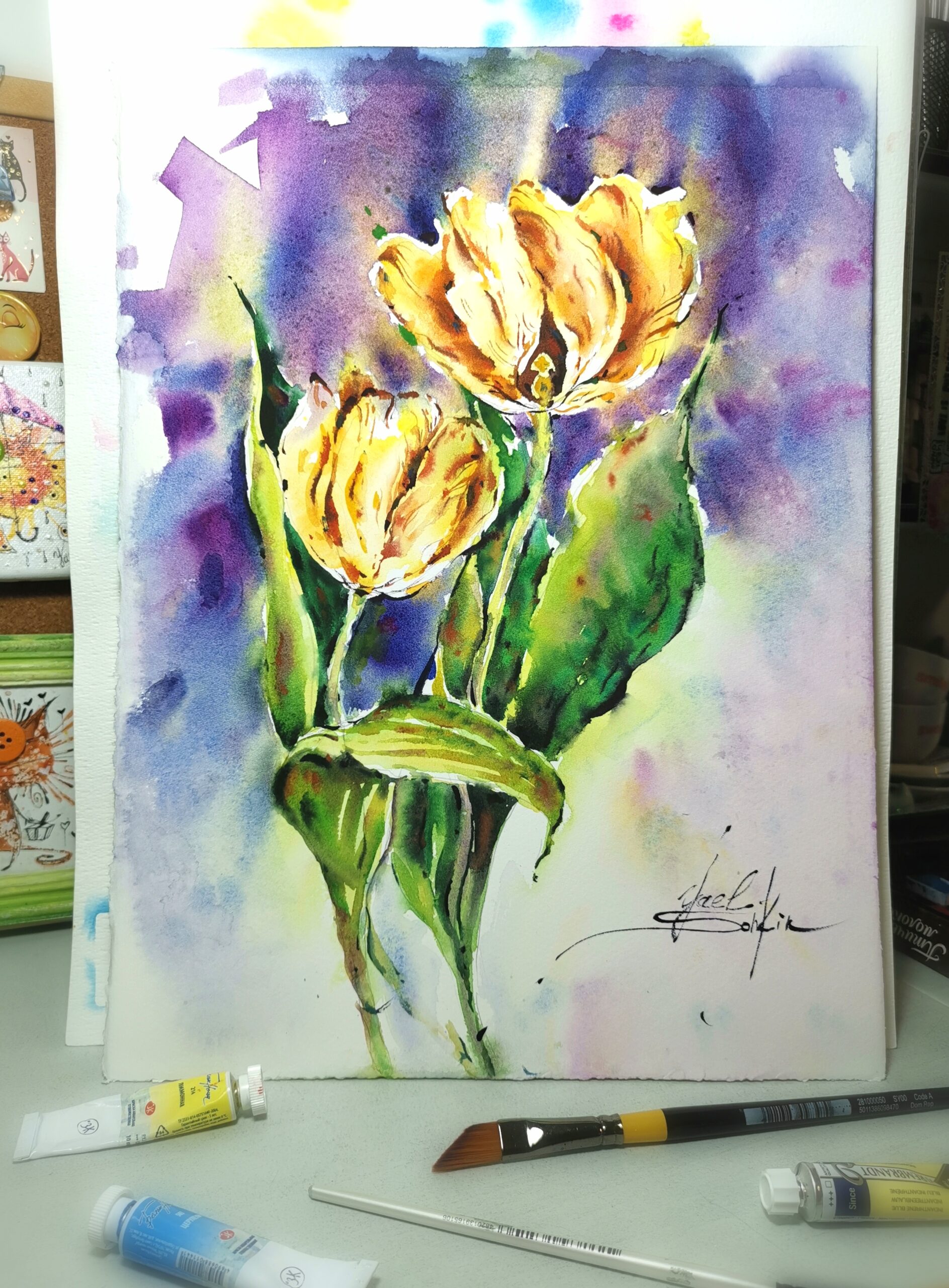 🎨This original watercolor painting by Yael Natali captures the delicate beauty of yellow tulips glowing with warmth and light. Painted in expressive brushstrokes, the composition blends rich greens, golden tones, and hints of violet and blue, creating a vivid contrast full of movement and emotion.