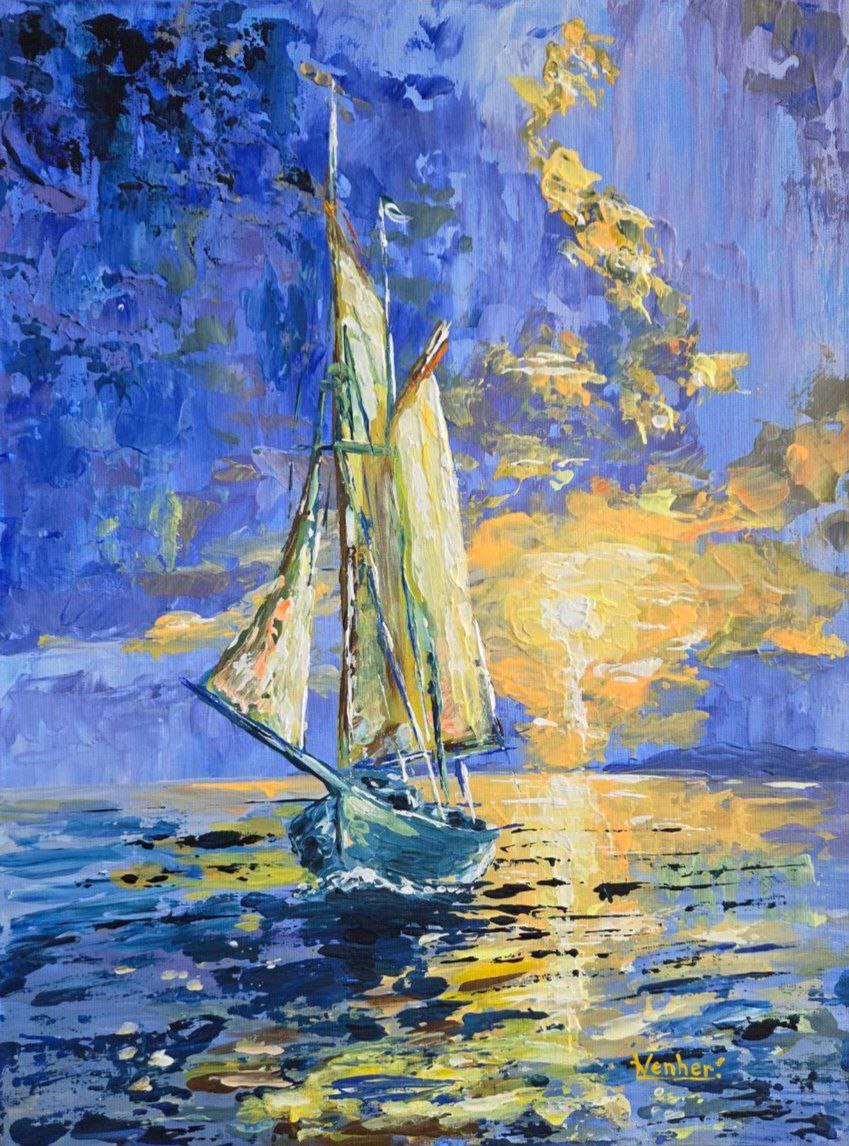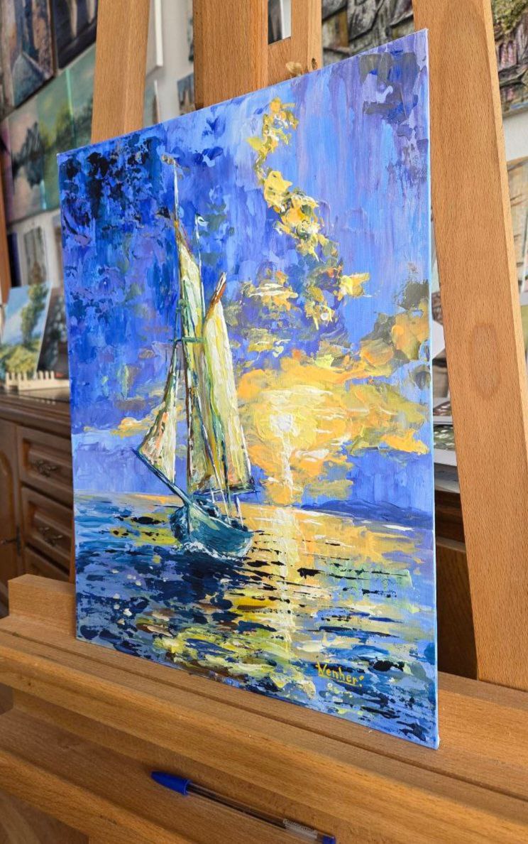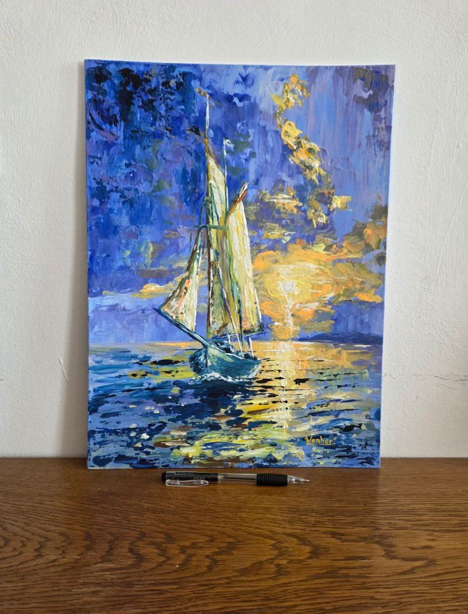 The entire canvas is filled with a sense of the moment: the sun is about to set, the wind doesn’t let up, and the sailboat continues its journey—confident, free, and persistent.