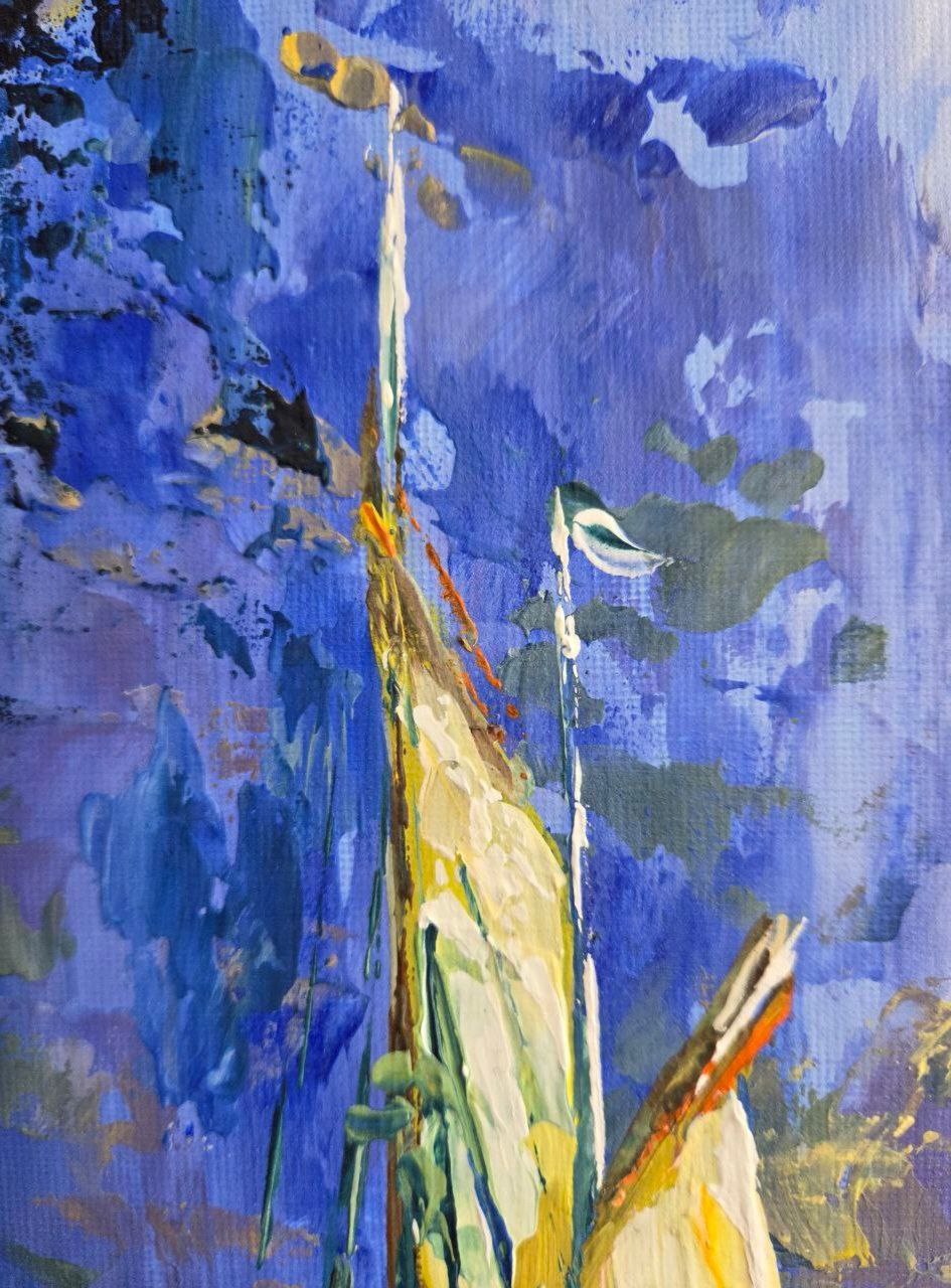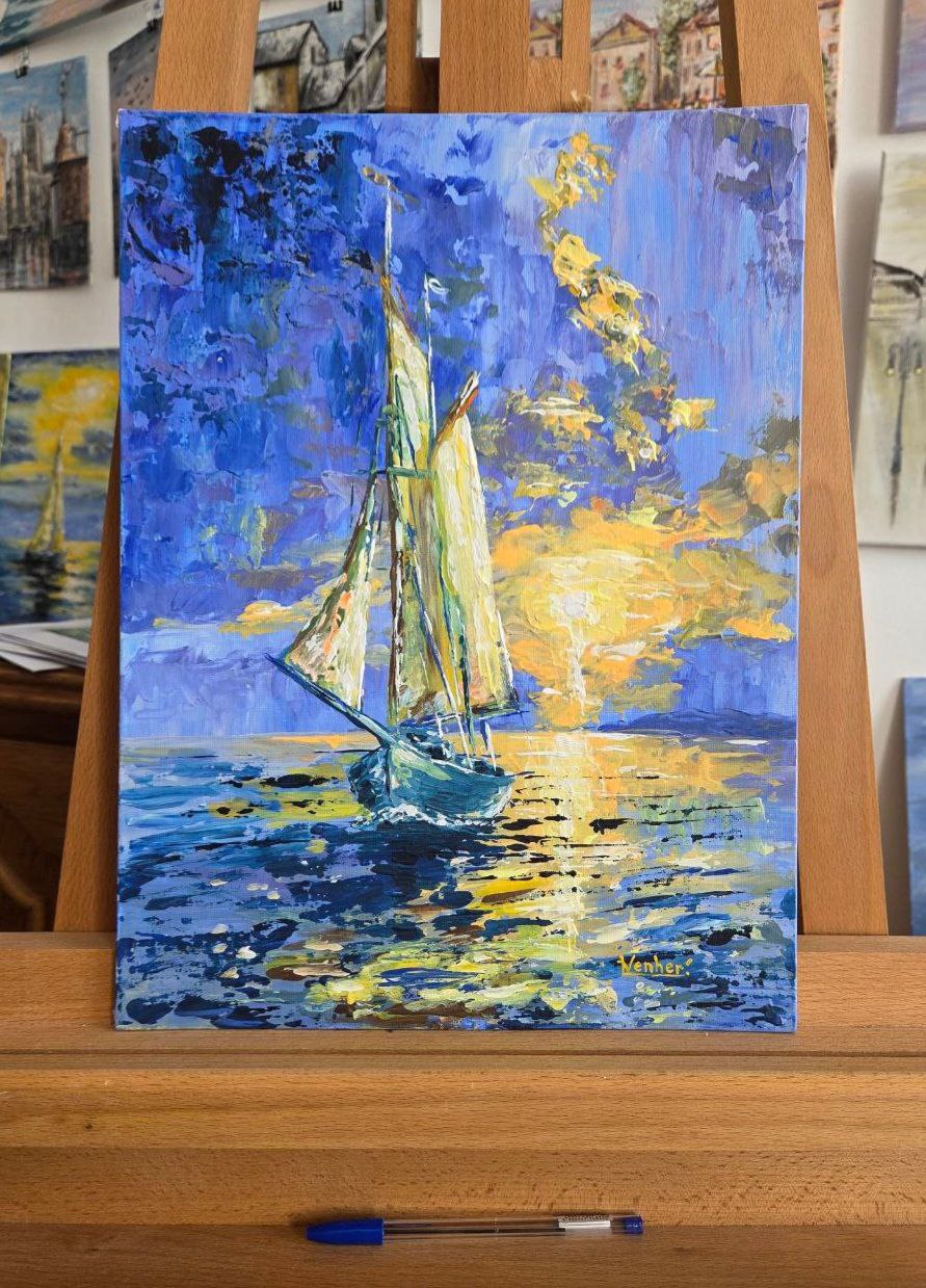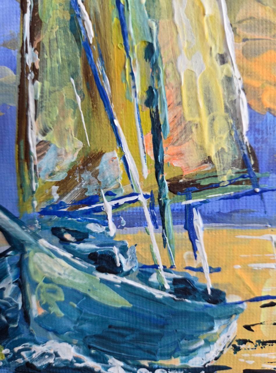 The entire canvas is filled with a sense of the moment: the sun is about to set, the wind doesn’t let up, and the sailboat continues its journey—confident, free, and persistent.