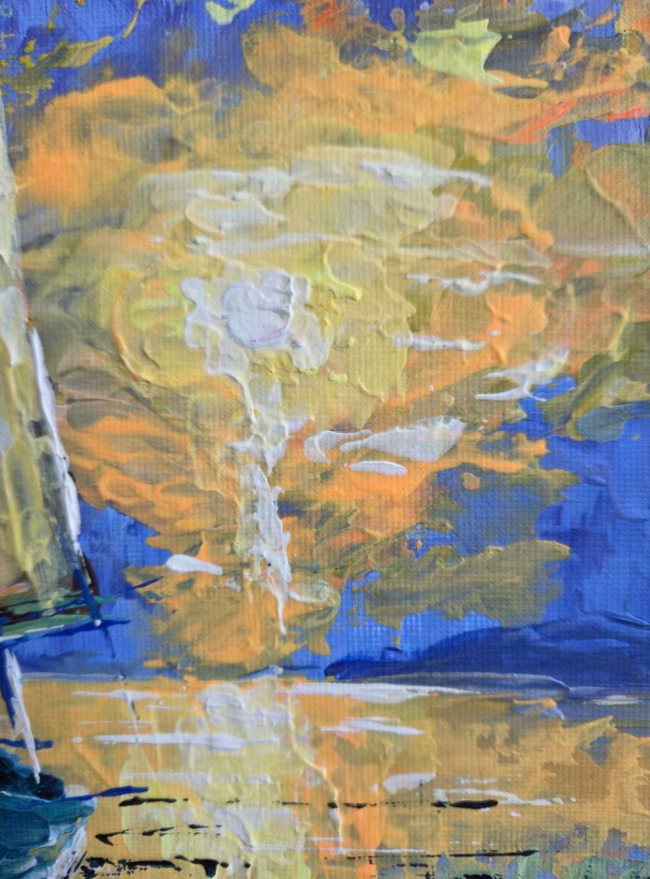 The painting’s palette is built on the contrast of rich blue, yellow, and orange tones. The sky is a deep blue, fading to rich violet and cobalt hues, against which the setting sun’s orange and gold patches sparkle. The water reflects this glow, sometimes glowing with amber highlights, sometimes fading into deep blue shadows.