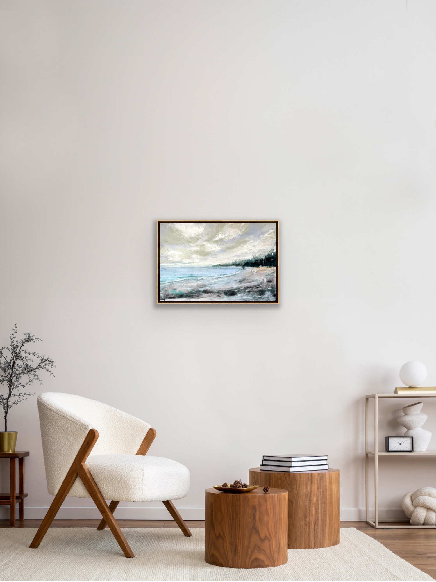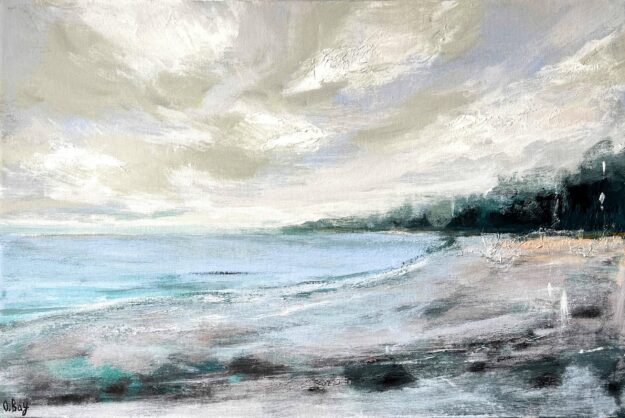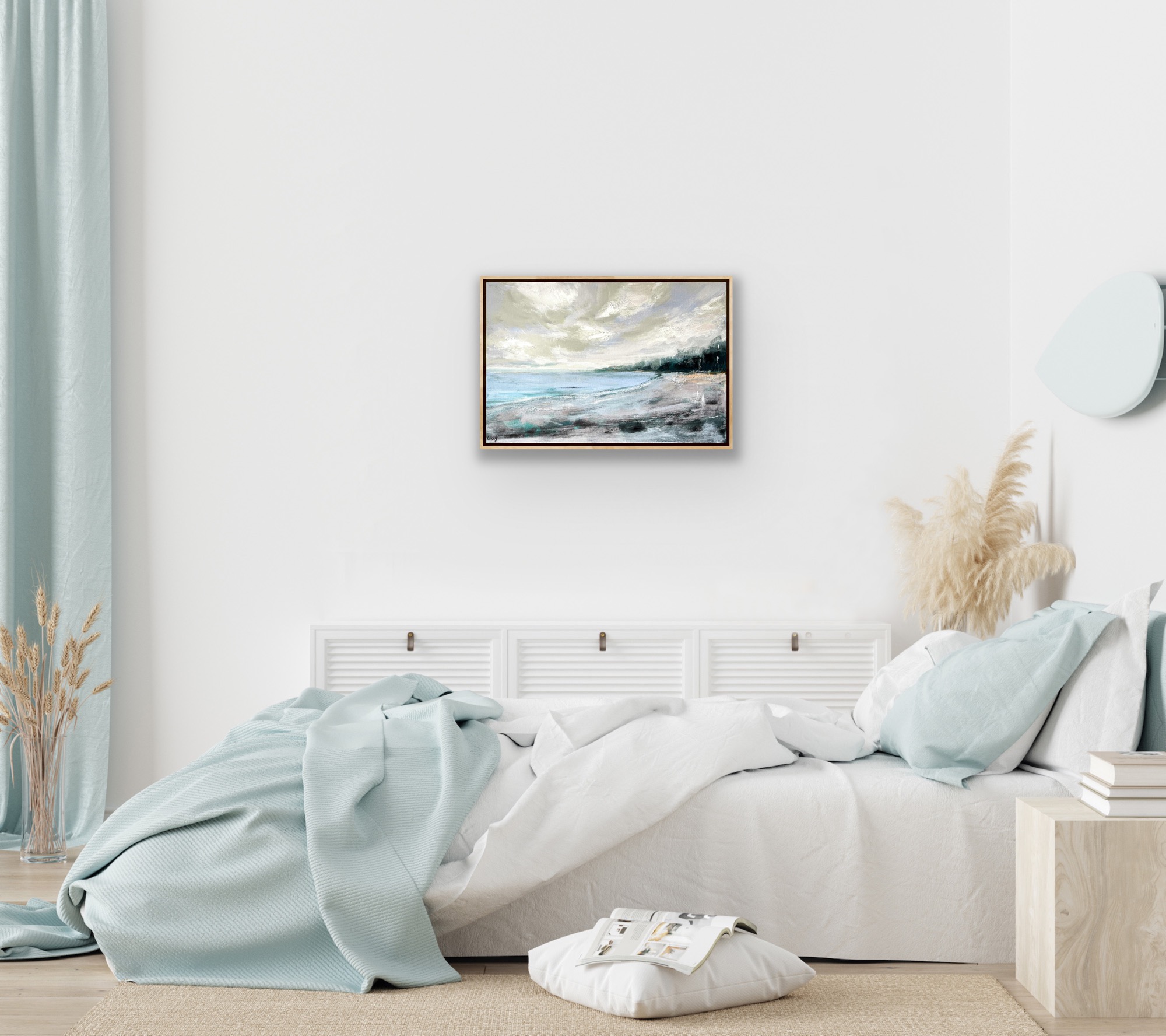 Cloudy day on the Lake is an original one-of-a-kind artwork created on canvas with acrylic paints. Signed on the front and back sides. This painting depicts a tranquil lakeshore beneath a clouded sky in soft blue-green and grey-white tones. It reflects nature’s quiet beauty, radiating harmony and meditative calmness.