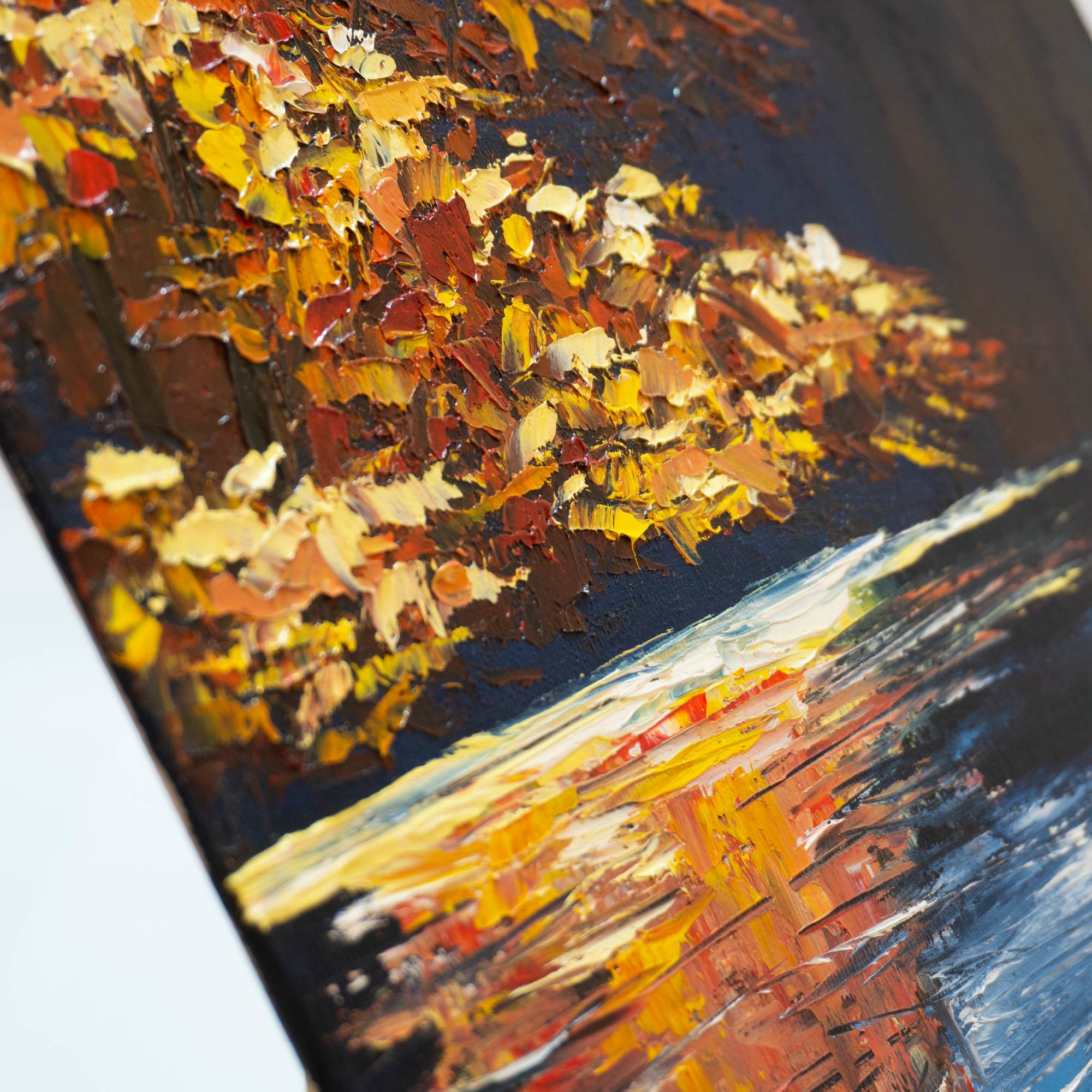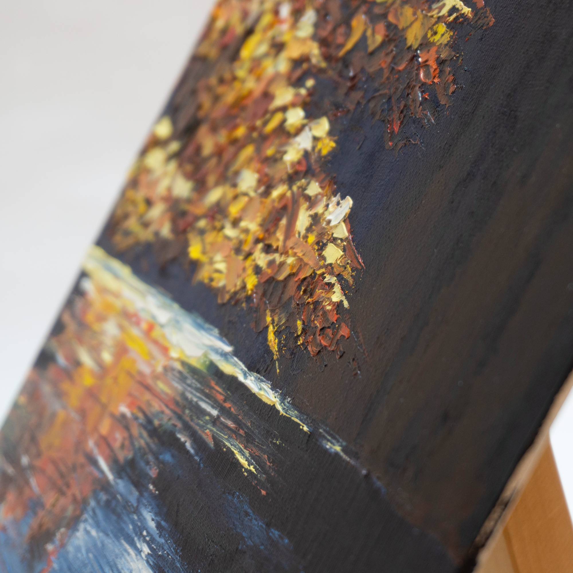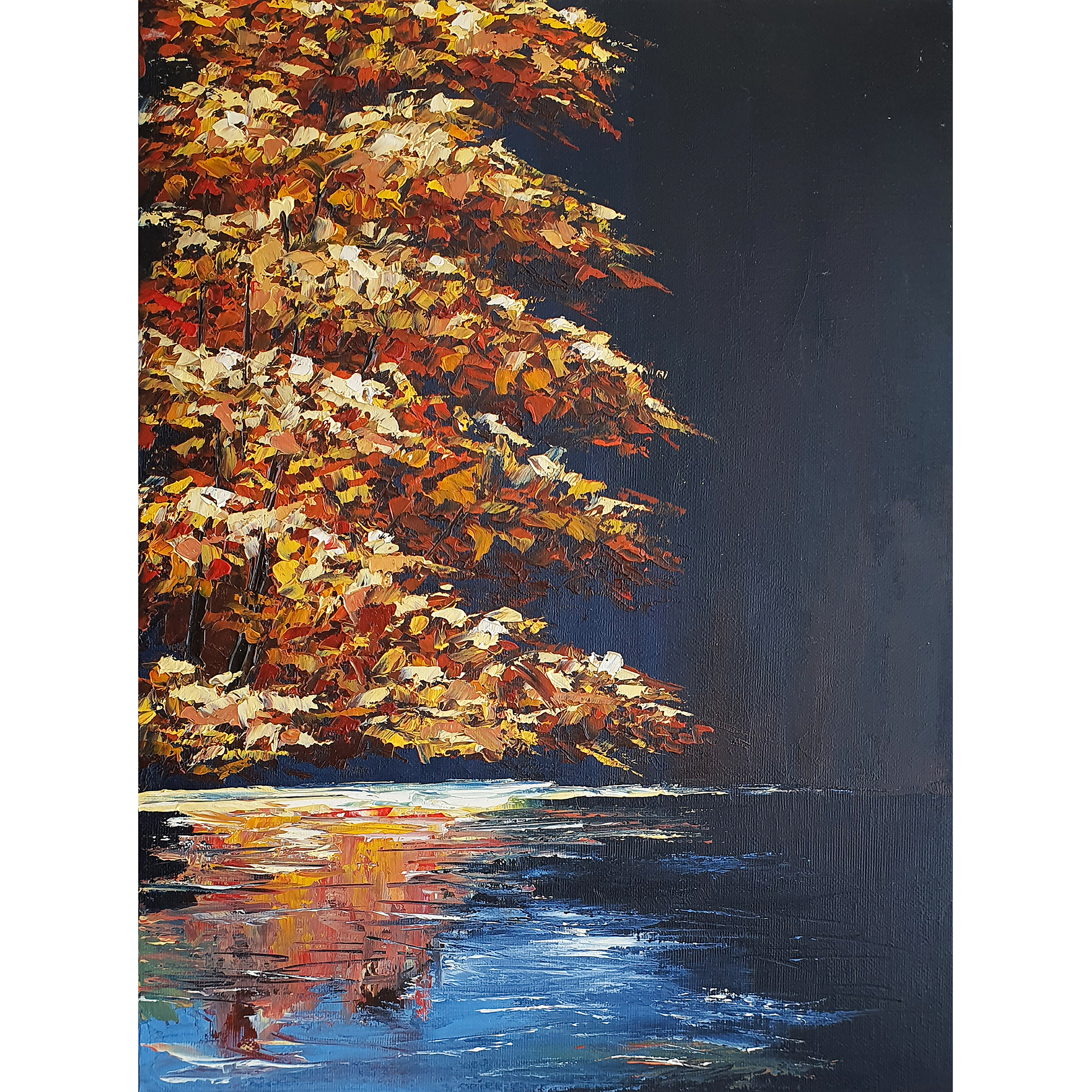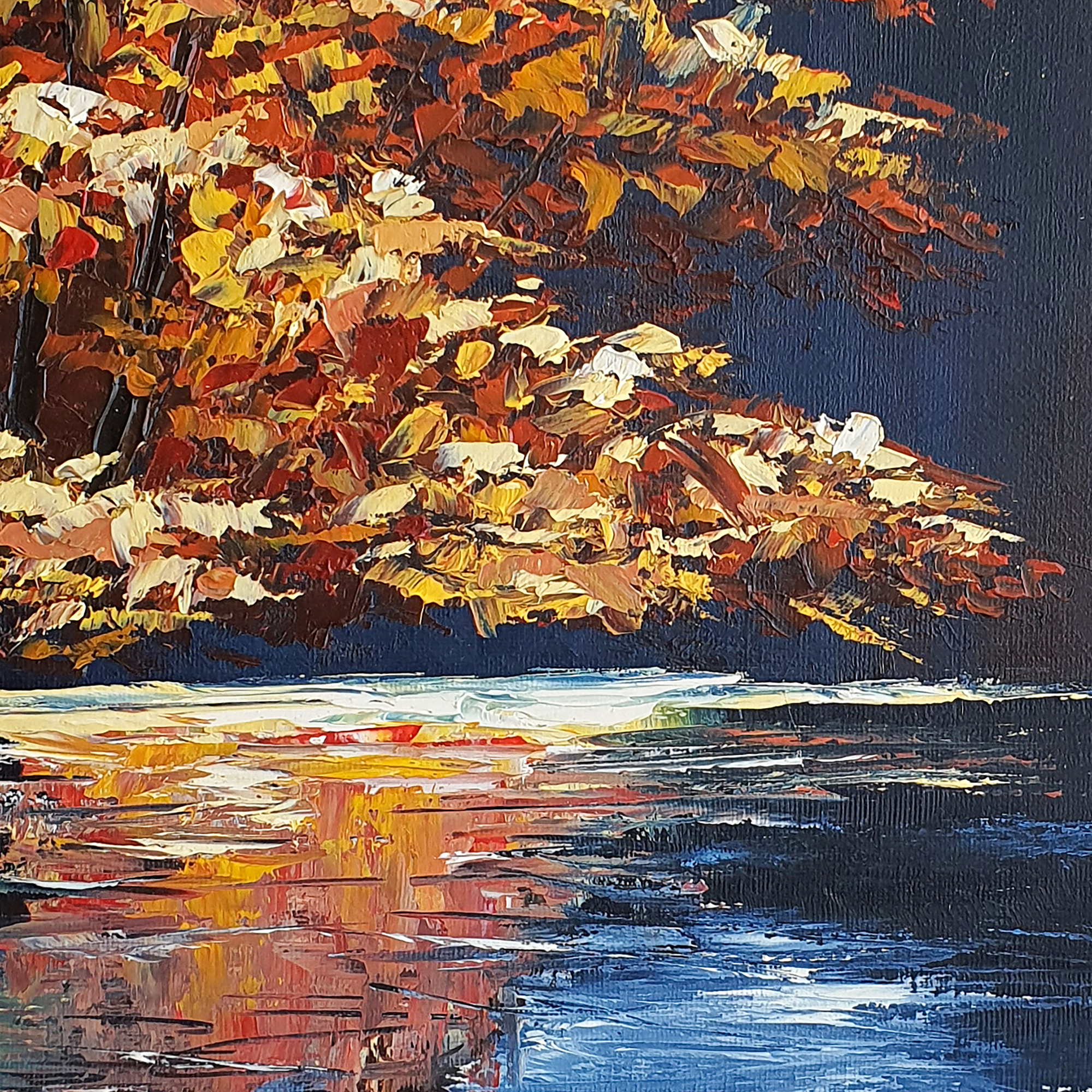 This impasto oil painting captures a tranquil moment of nature’s poetry. Against a deep black background, the fragment of a quiet lake shimmers with golden reflections. Above, heavy branches hang gracefully, covered with vibrant yellow leaves, their bold strokes echoing in the water below.